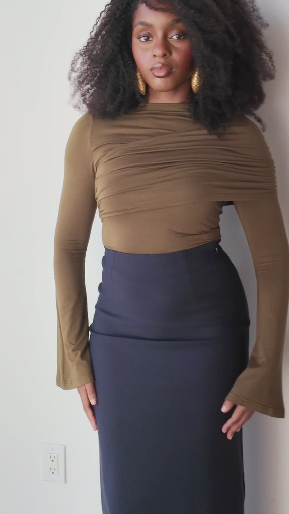 Beautiful details within lines of this skirt. Im only 5’3 so i will definitely have this skirt shorten, but its worth every penny for quality of the suit. I was a little surprised the color was a shade darker than what I expected. But i am still pleased.
