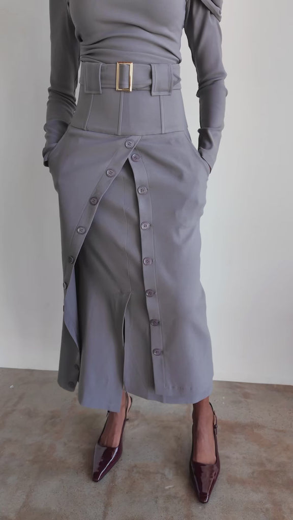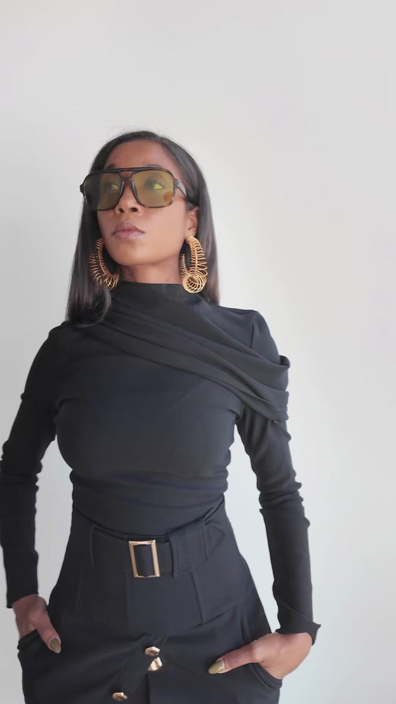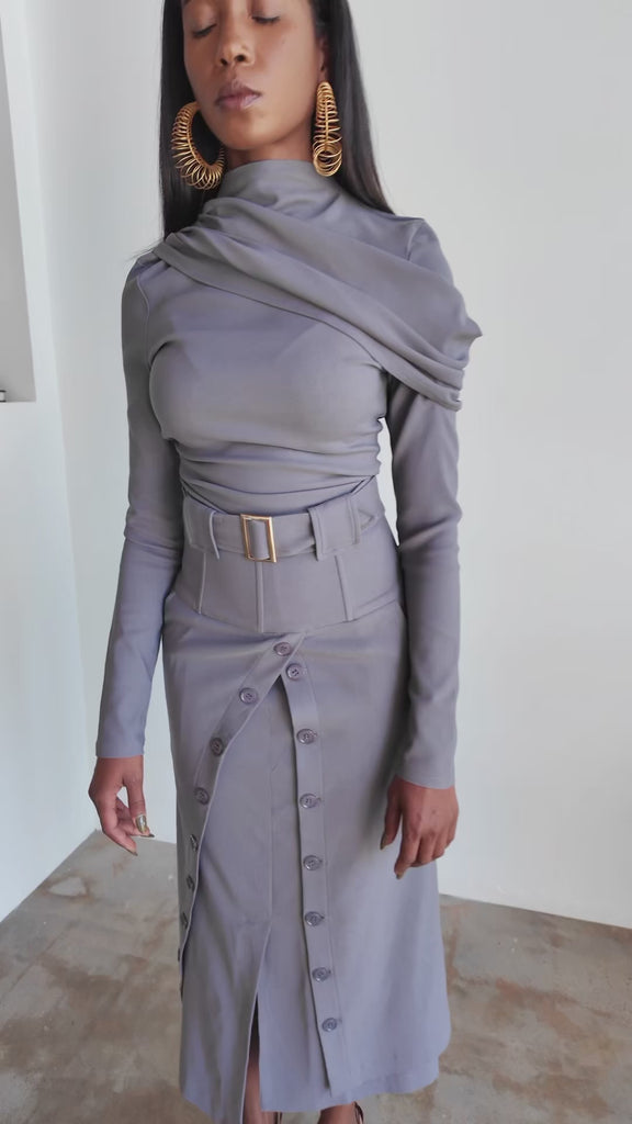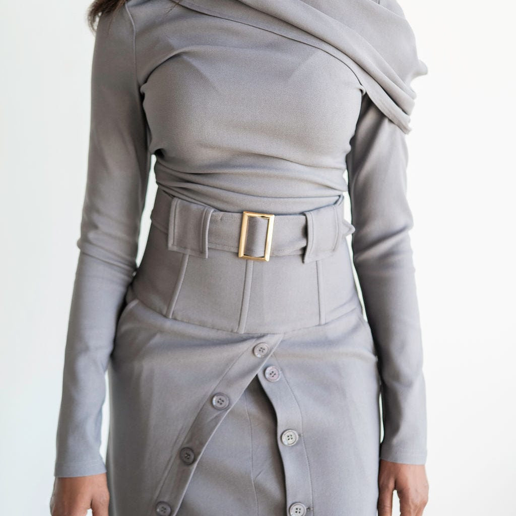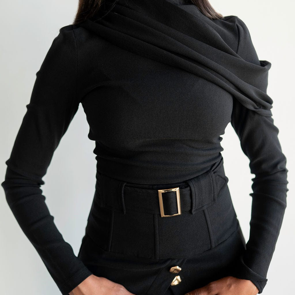 This outfit was such an elegant and classy look, i wore it to an all black wedding. The fabric is super soft with good stretch; sufficient lining in the skirt, and the length was really good even though i am on the shorter end. The gold buckles elevated the look and I cannot recommend this outfit enough. It is super classy, stylish and such a lovely outift.