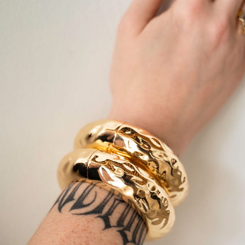 We all know the perfect accessory isn’t always subtle sometimes it’s meant to stand out. This hammered gold bangle features a beautifully textured surface that catches the light with every movement. The handcrafted hammered finish creates a unique shimmer, giving the bracelet a bold yet timeless look that complements both everyday outfits and elegant evening wear.