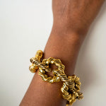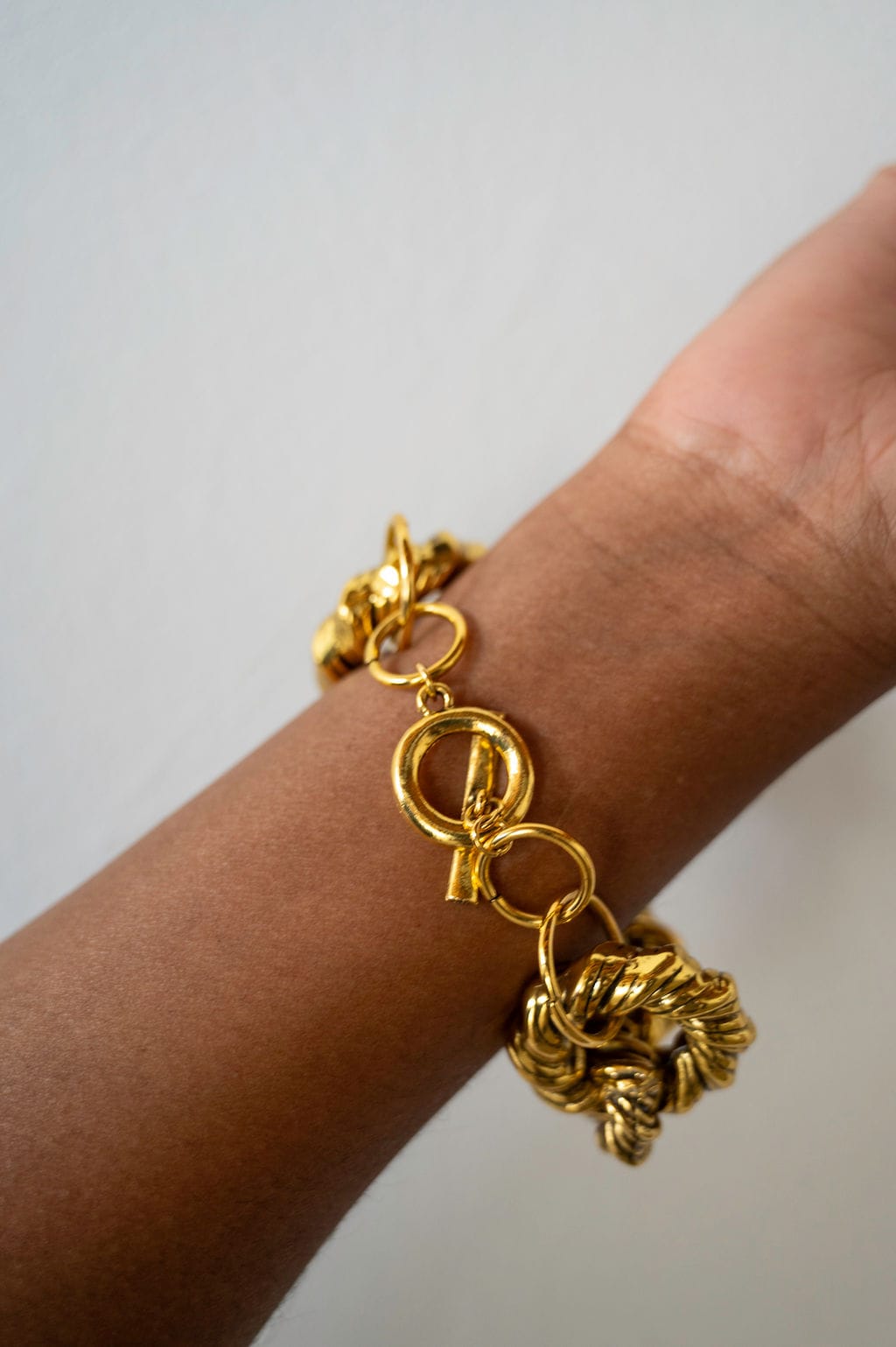 We all know the perfect accessory isn’t always understated sometimes it’s designed to stand out. This twisted gold bracelet features an elegant spiral design that wraps gracefully around the wrist, creating a refined yet eye-catching look. The smooth gold finish catches the light beautifully, adding a touch of sophistication whether you're styling a casual daytime outfit or dressing up for an evening occasion.