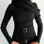 Make a bold statement with the Nia Asymmetrical Shoulder Draped Long Sleeve Top in Black. Its unique draped design and striking asymmetrical neckline create a daring silhouette that elevates your look from workday chic to brunch flair or a night out. Crafted to combine elegance with edge, this top ensures you stand out confidently wherever you go. Pair it with the Nia Pants or Lai Skirt.