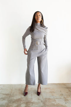 Make a bold statement with the Nia Asymmetrical Shoulder Draped Long Sleeve Top in Grey. Its unique draped design and striking asymmetrical neckline create a daring silhouette that elevates your look from workday chic to brunch flair or a night out. Crafted to combine elegance with edge, this top ensures you stand out confidently wherever you go. Pair it with the Nia Pants or Lai Skirt.