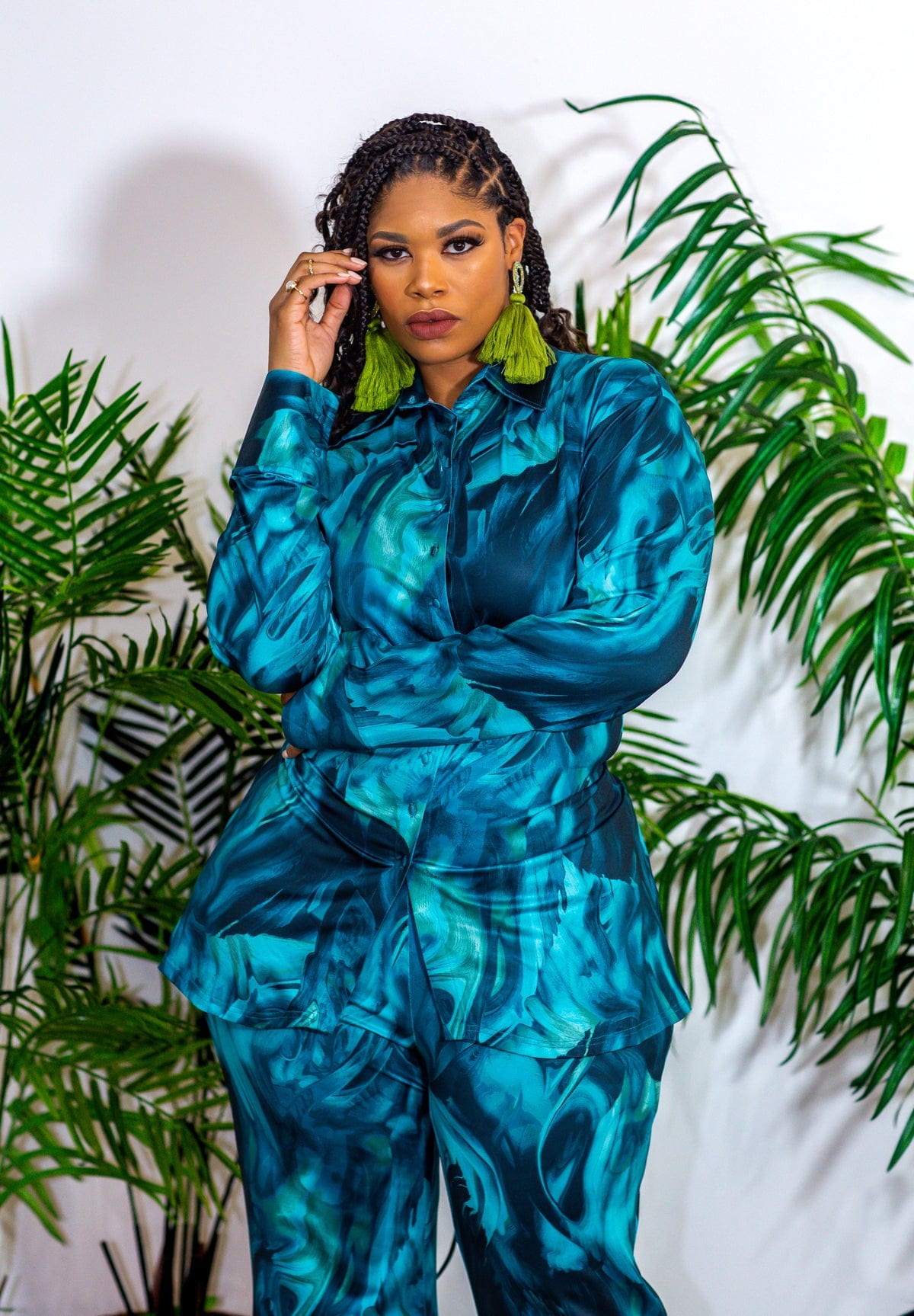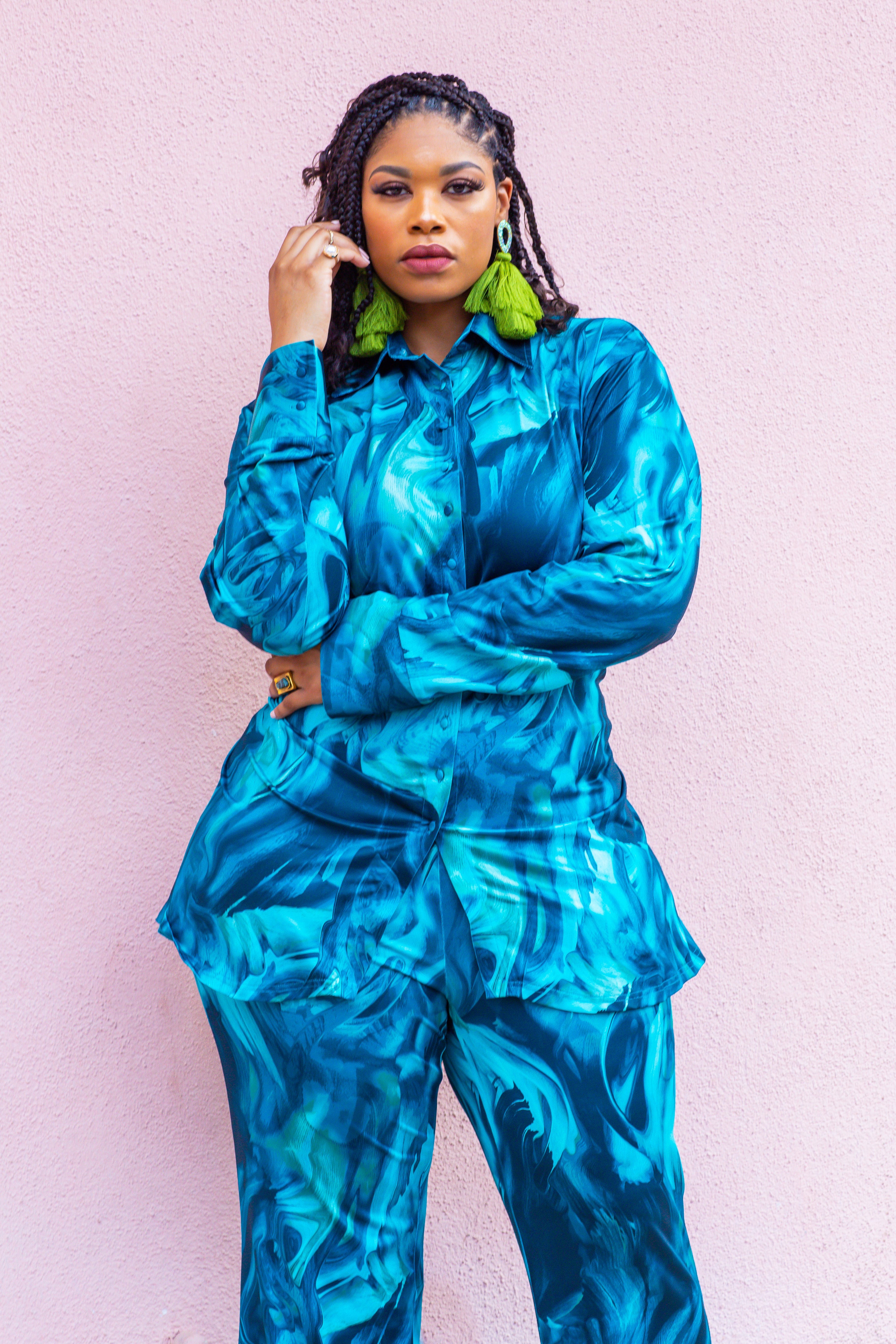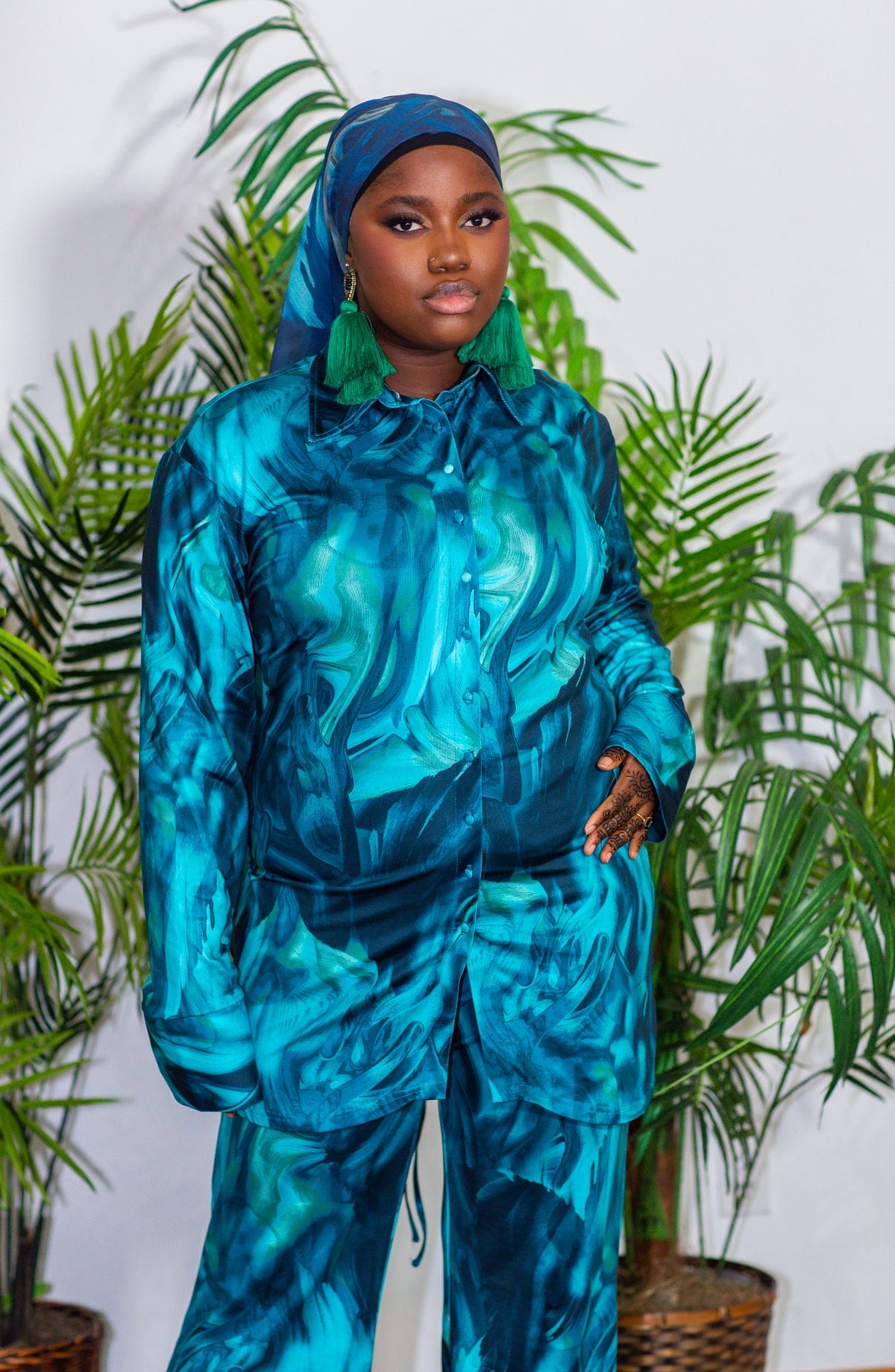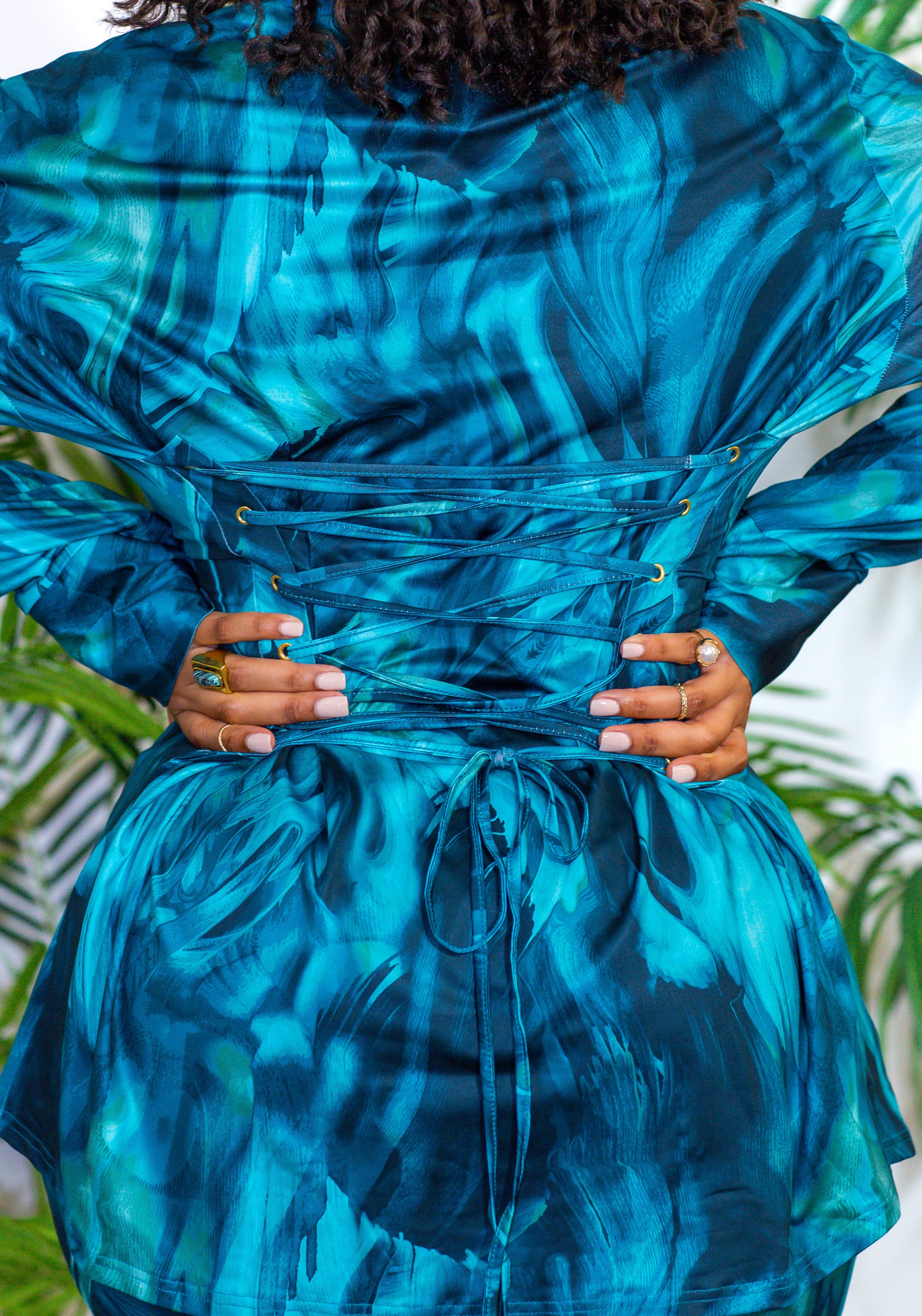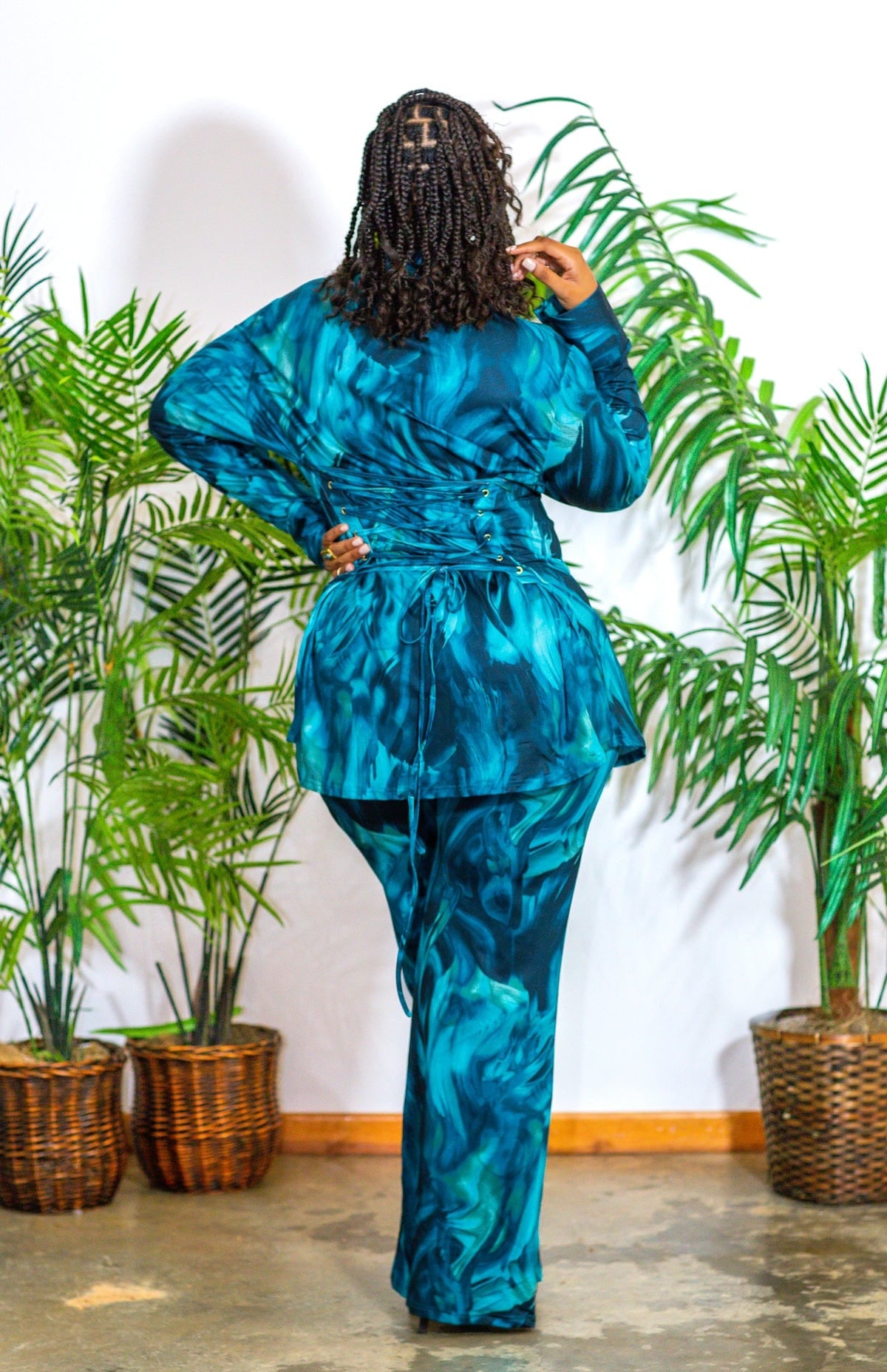 Omi in Yoruba means water, because what else would these beautiful waves on this stunning pattern represent? The Omi long sleeve shirt pairs beautifully with the other Omi clothing and can easily be mixed and matched with pieces in your closet. The best part of this shirt is the back. The lace up back means you can easily adjust it to be as loose or as tight as you prefer.