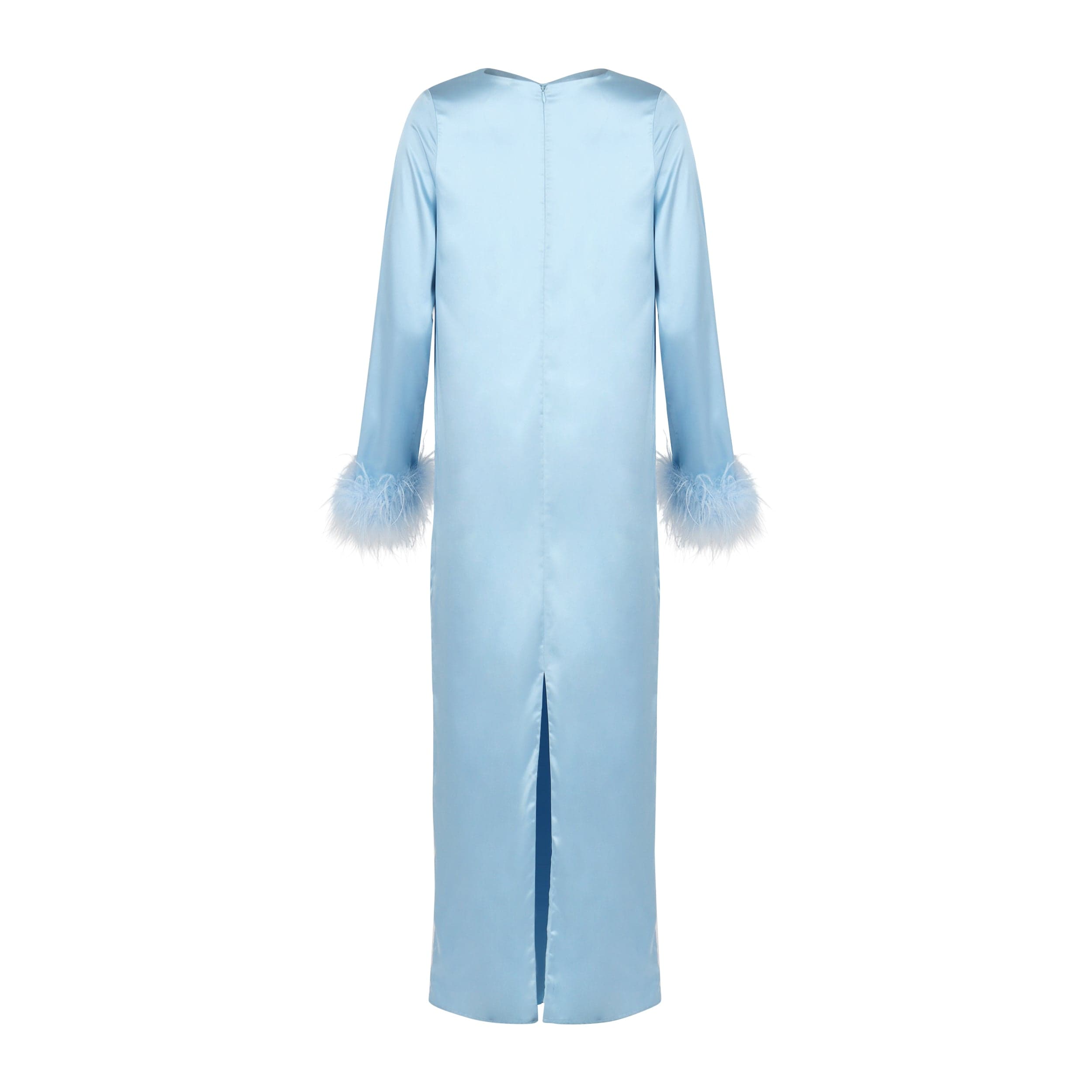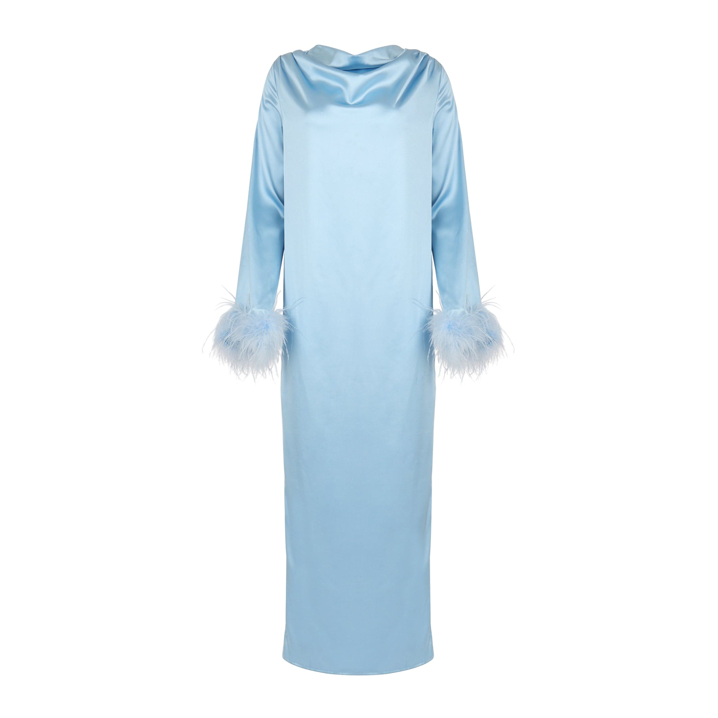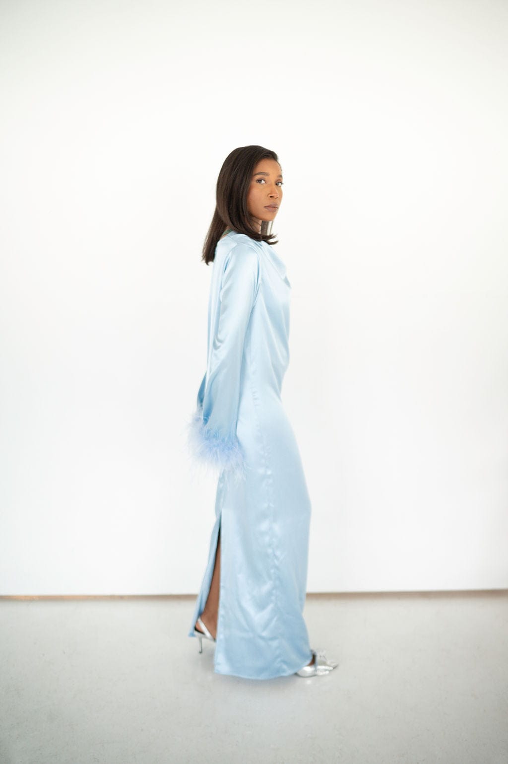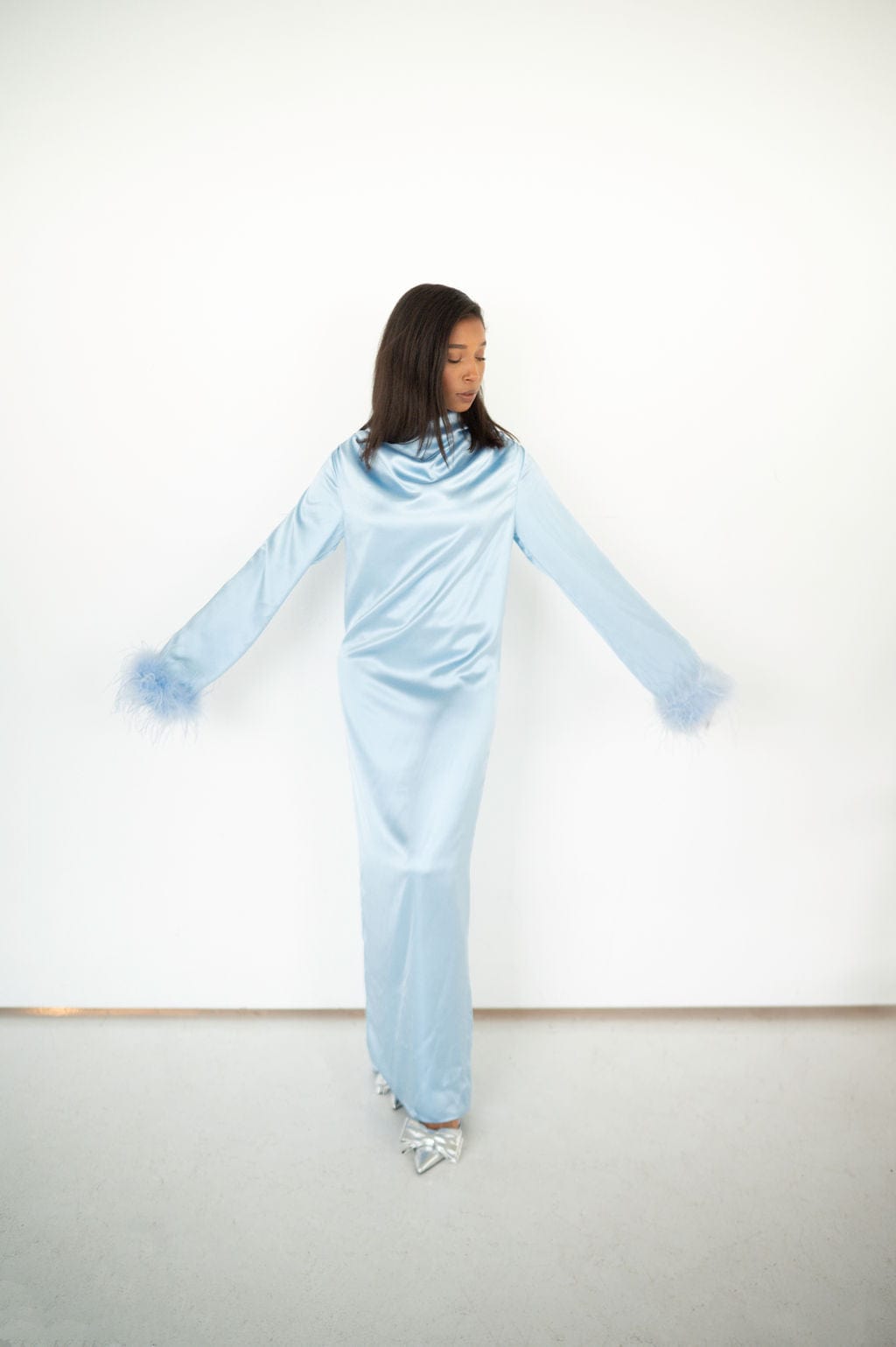 Get ready to turn heads with the Bilquees Long Feather Sleeve Dress! Designed with a draped neck and made with soft satin in a cool icy blue color, this dress will make you stand out from the crowd. You'll be the talk of the town in this unique and playful dress.