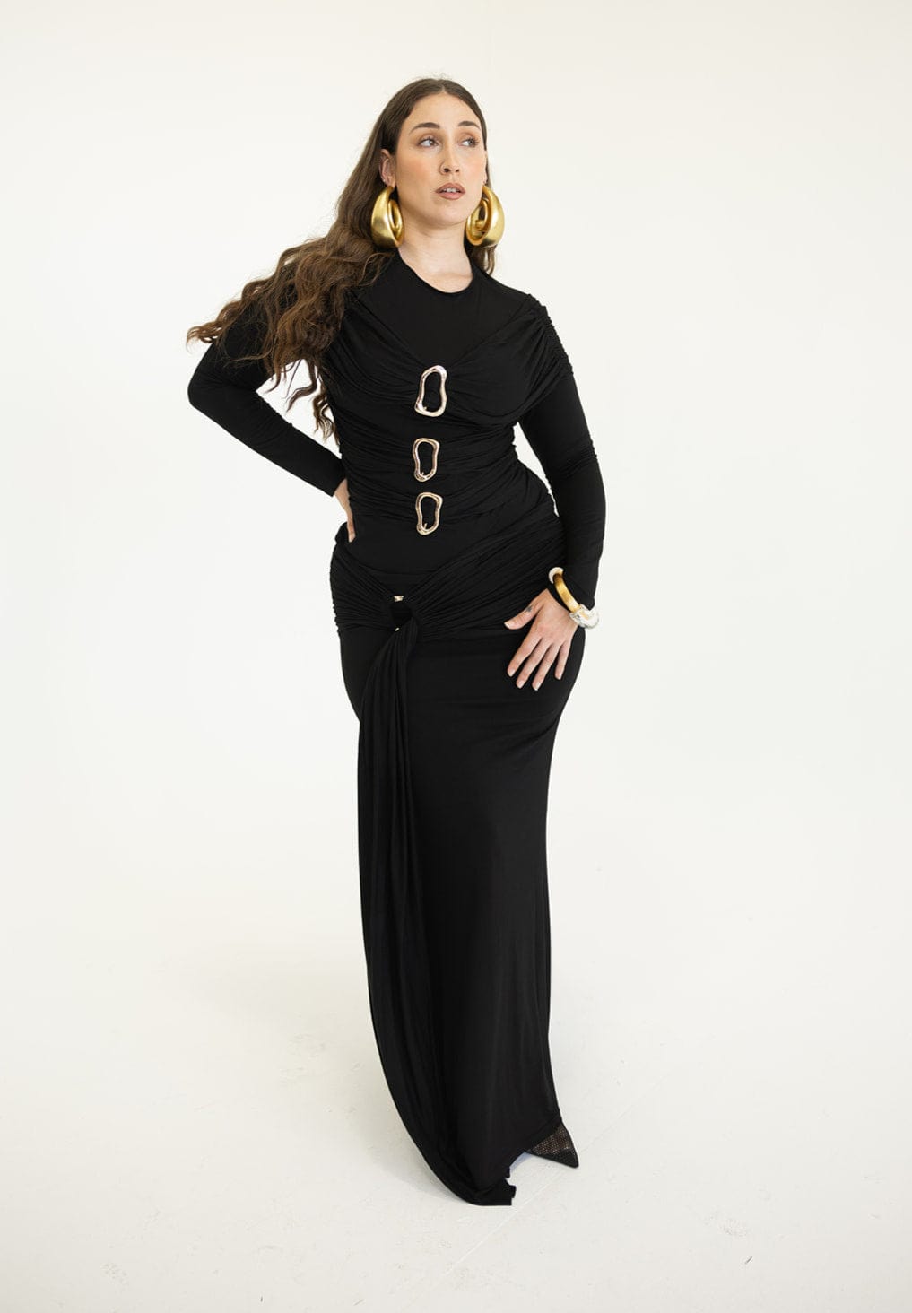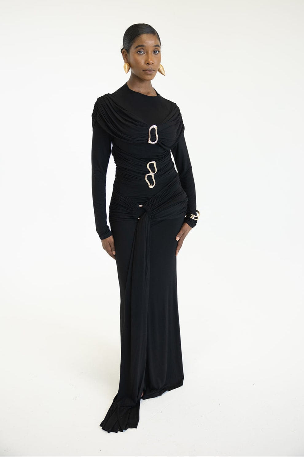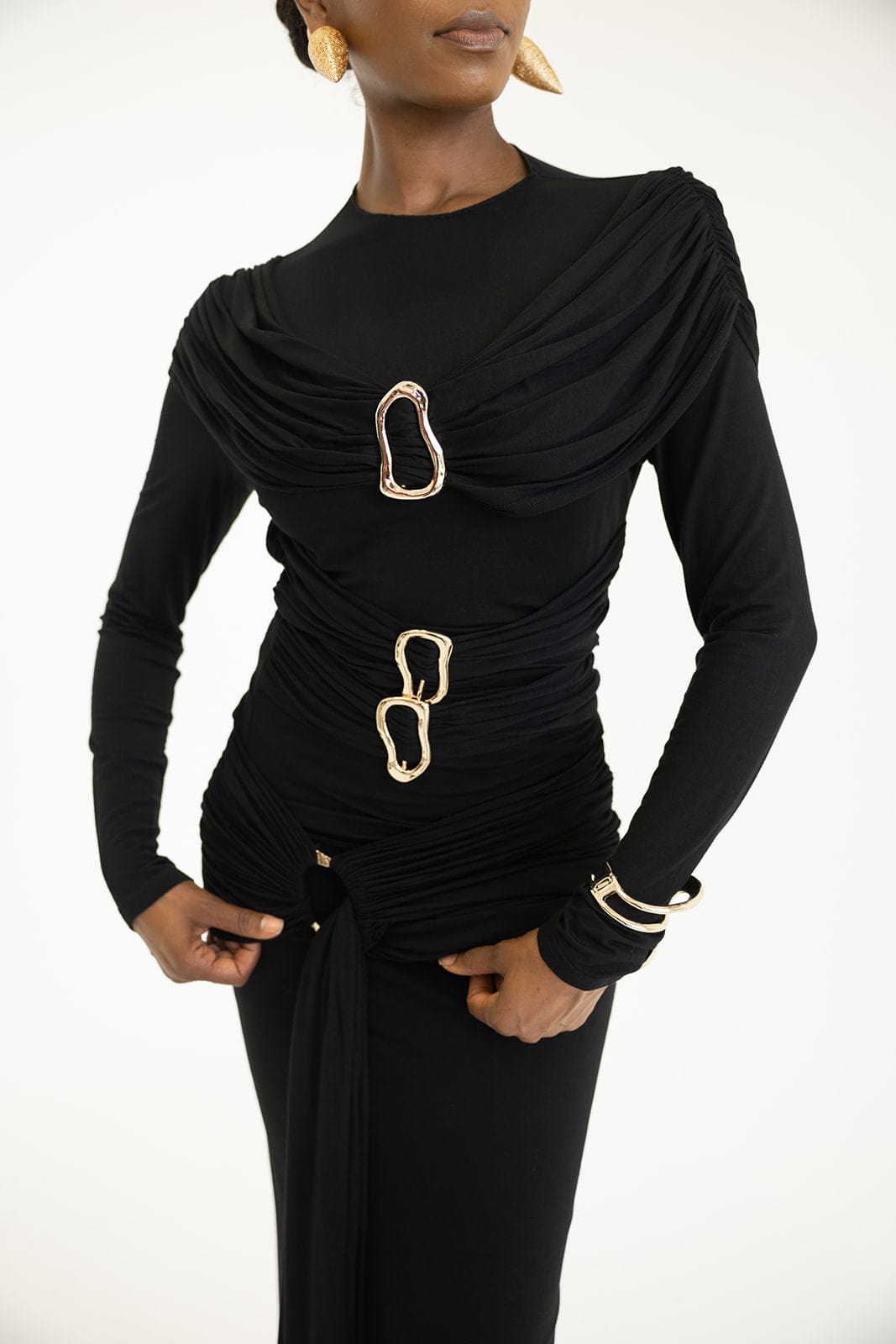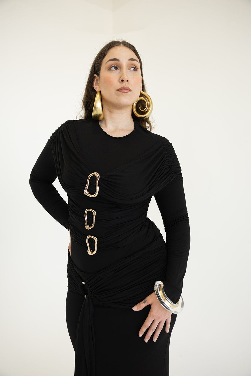 Make a bold statement with the Alita Draped Top, featuring soft jersey fabric that drapes effortlessly for a striking silhouette. Gold accents add an edgy shine, while its versatile design lets you confidently pair it with jeans or a skirt for fearless style that stands out.