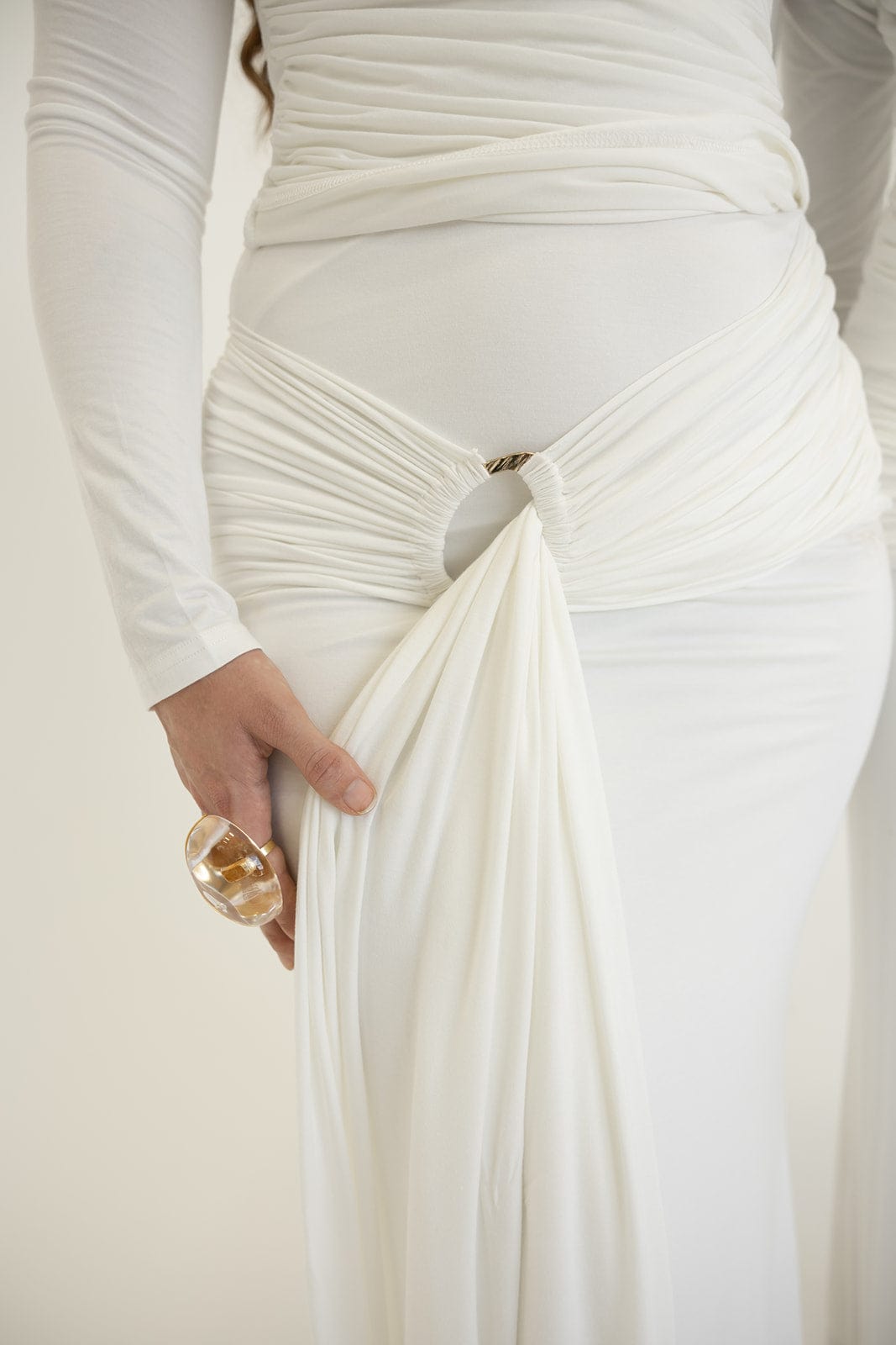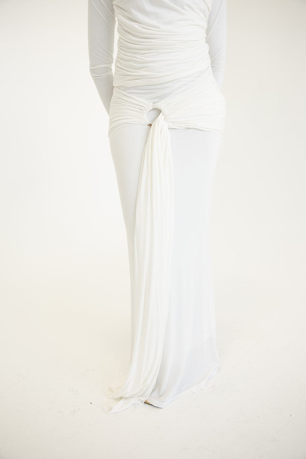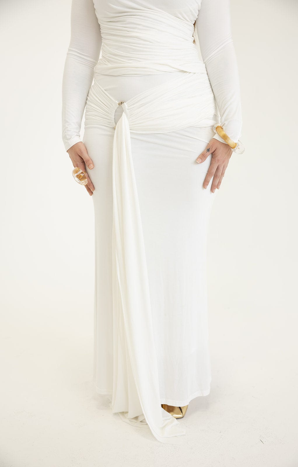 The Lita Draped Tie Maxi Skirt in White features a luxurious, soft buttery fabric that gracefully drapes both at the front and back, creating an elegant silhouette. Accented with refined gold hardware, this skirt offers a sophisticated blend of timeless style and modern detail, perfect for elevating any ensemble with understated glamour.
