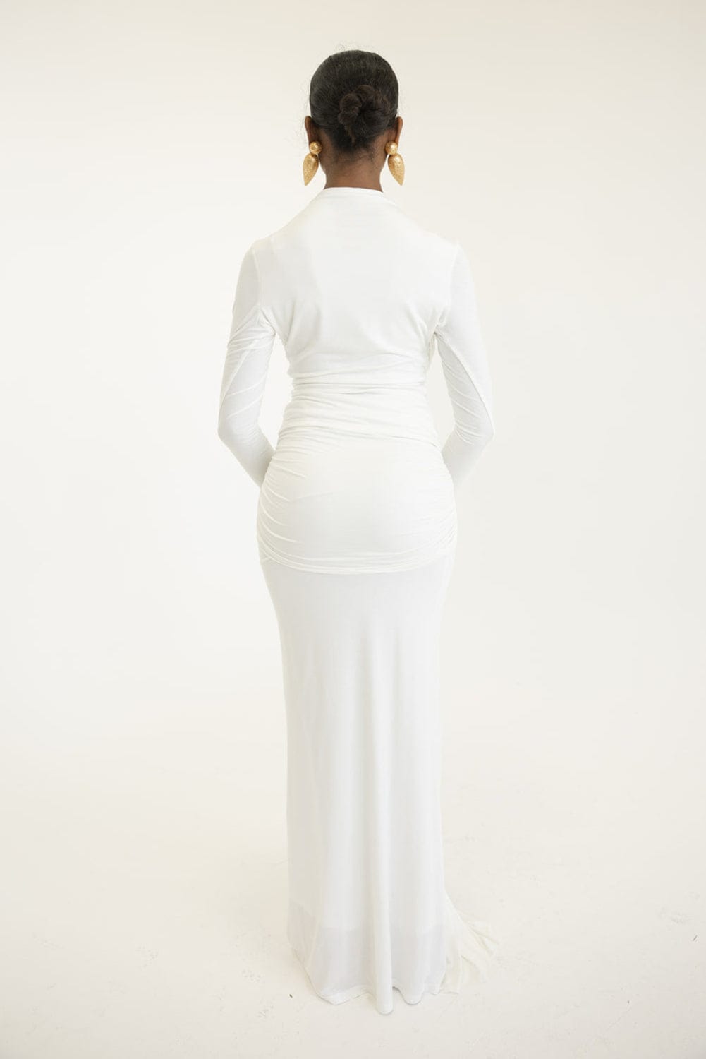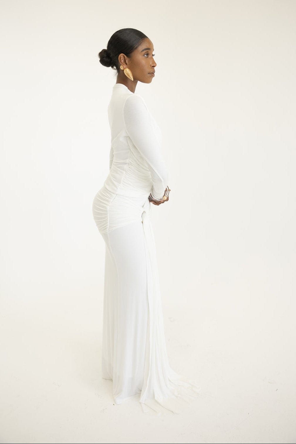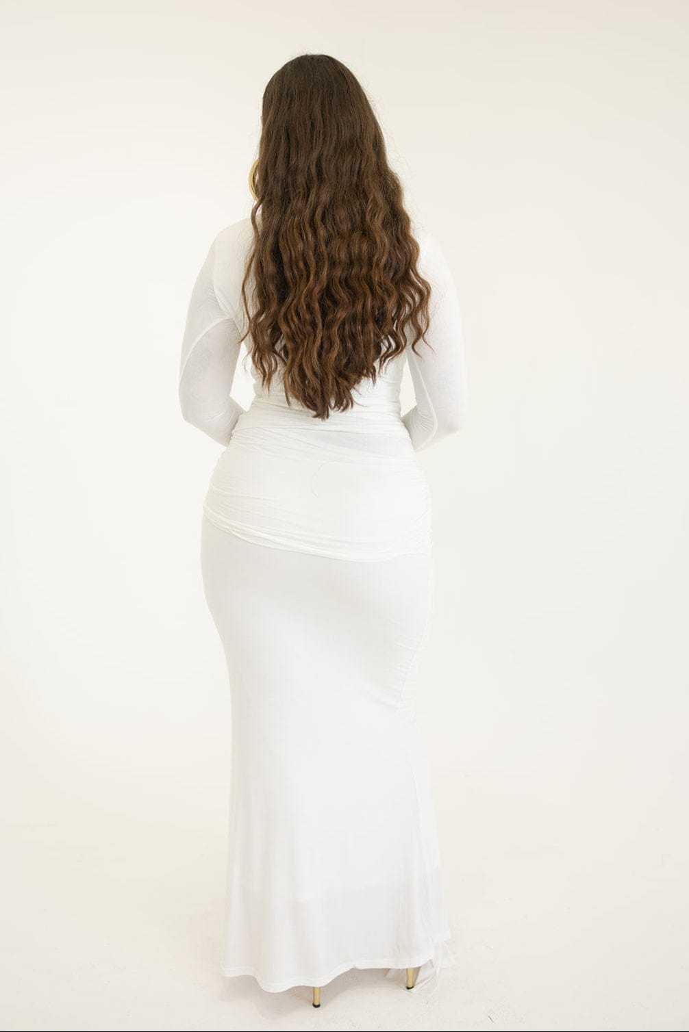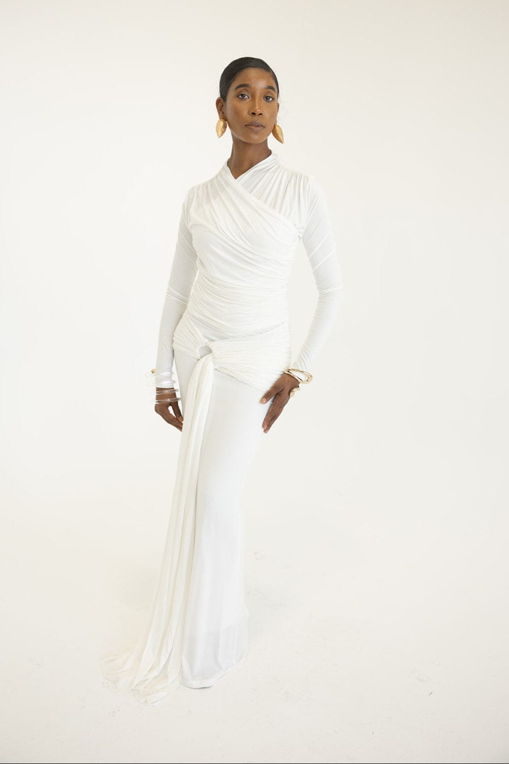 The Lita Draped Tie Maxi Skirt in White features a luxurious, soft buttery fabric that gracefully drapes both at the front and back, creating an elegant silhouette. Accented with refined gold hardware, this skirt offers a sophisticated blend of timeless style and modern detail, perfect for elevating any ensemble with understated glamour.
