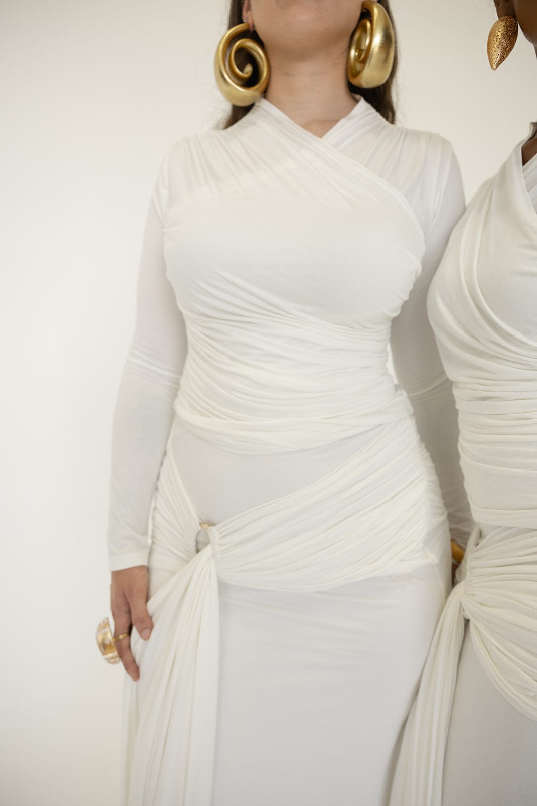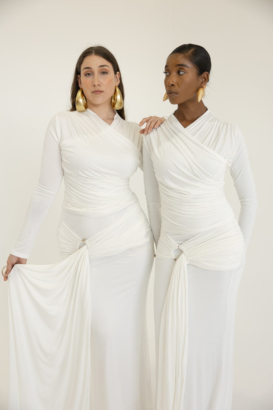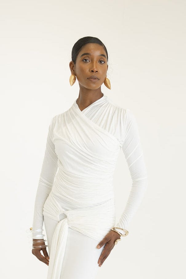 The Lita Draped Top features elegant ruching that enhances its sophisticated silhouette. Its versatile design pairs effortlessly with jeans for a chic casual look or complements the Lita skirt for a polished ensemble. Perfect for elevating your wardrobe with understated refinement.