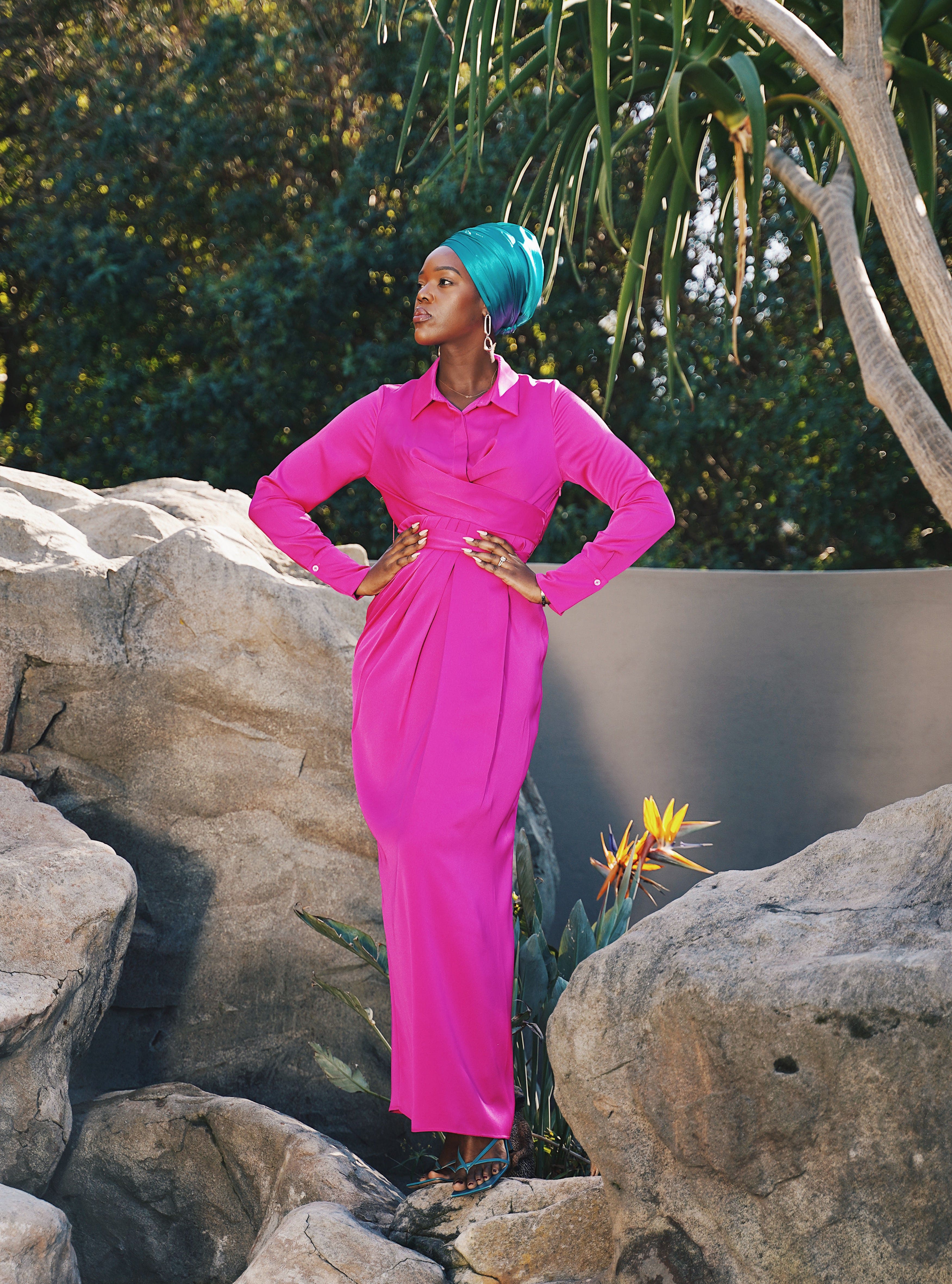 Nesrine in Arabic means "wild rose", a homage to her beautiful and bright color. She checks off the boxes of those fashionistas who love draping and structure. Nesrine can be worn in many settings, and is the perfect addition to your wardrobe.