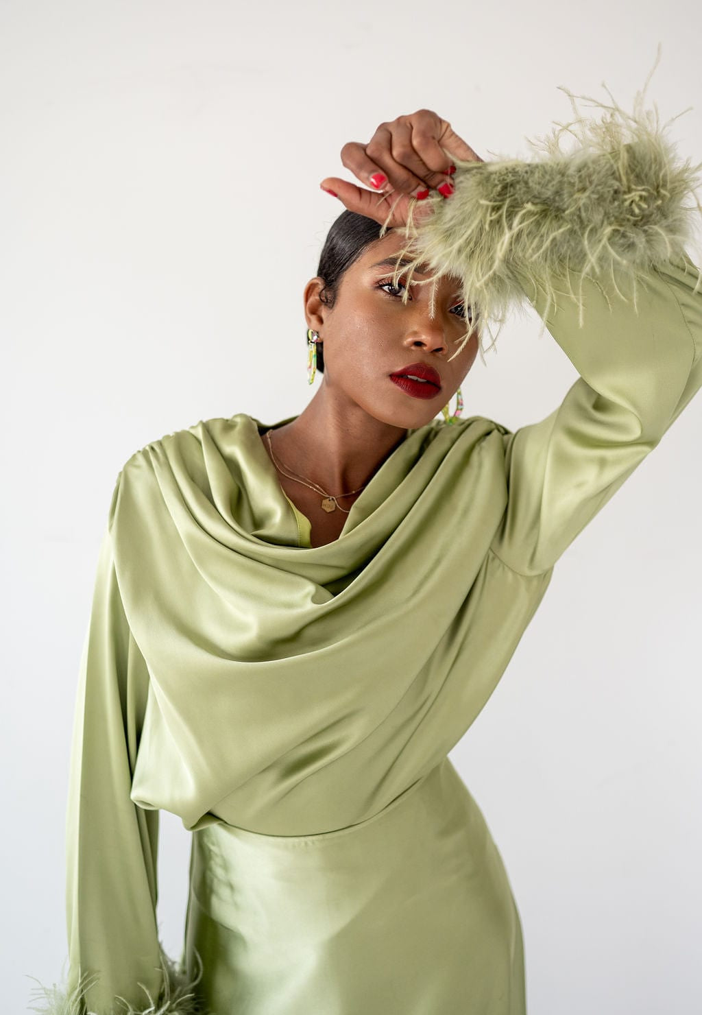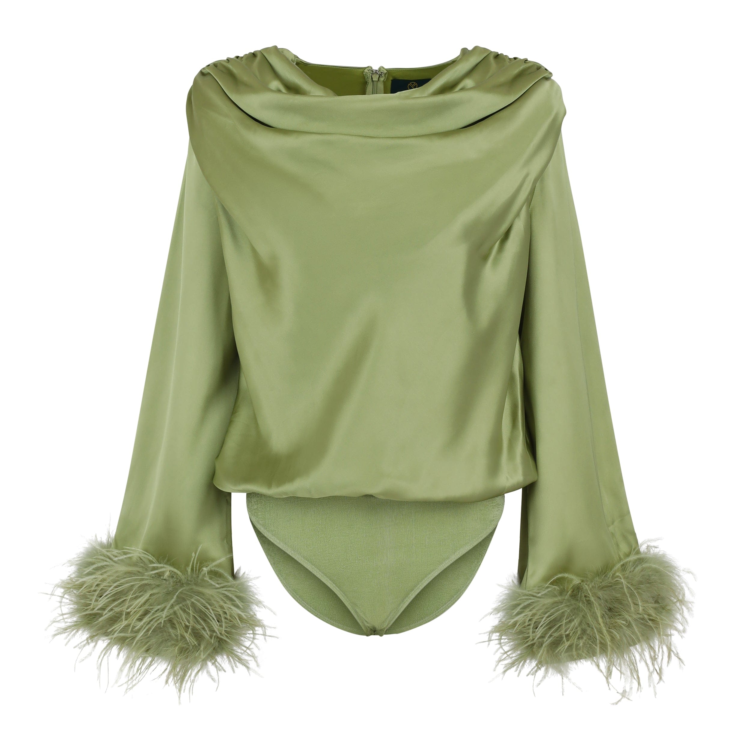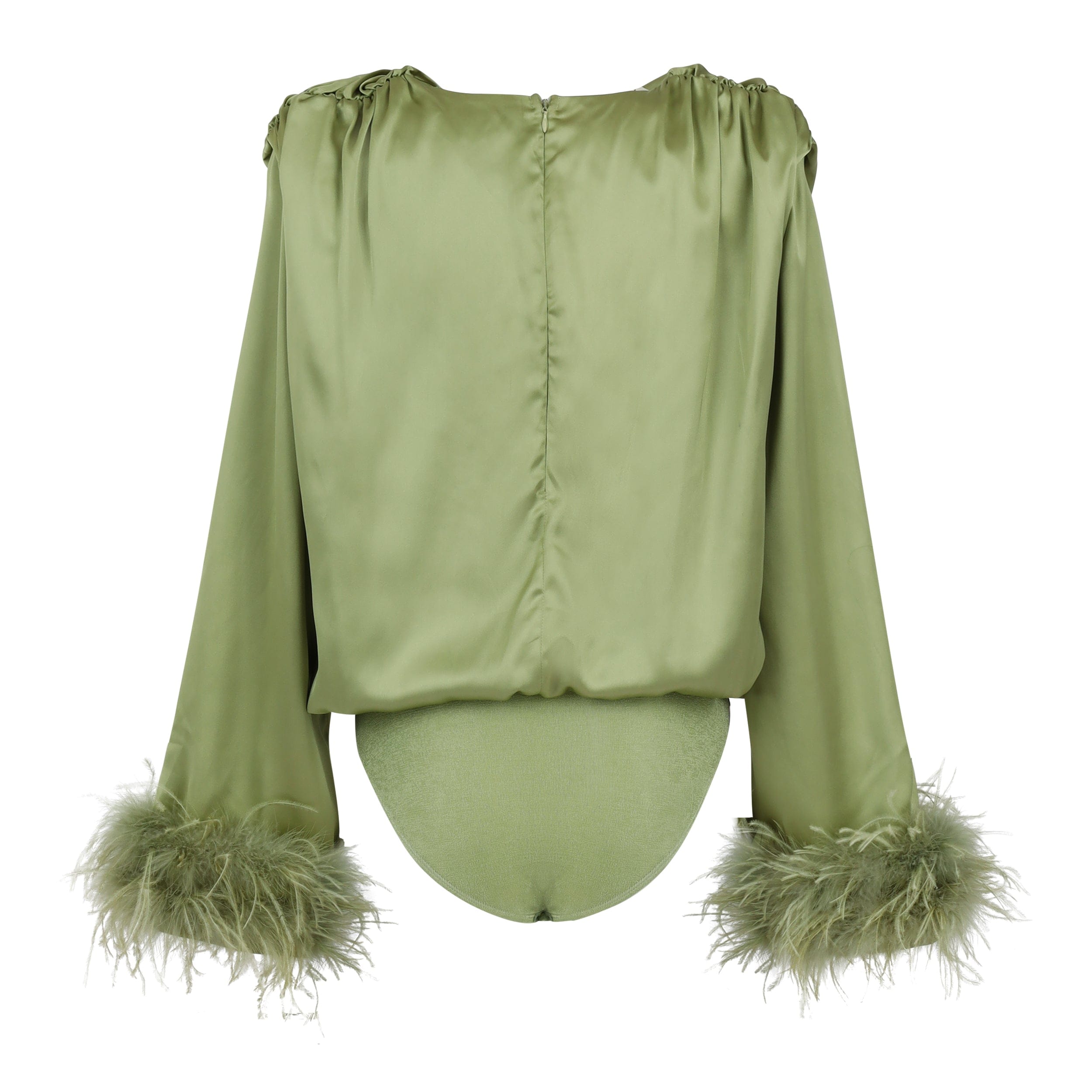 Zaina Feather Sleeve Draped Bodysuit- Sage