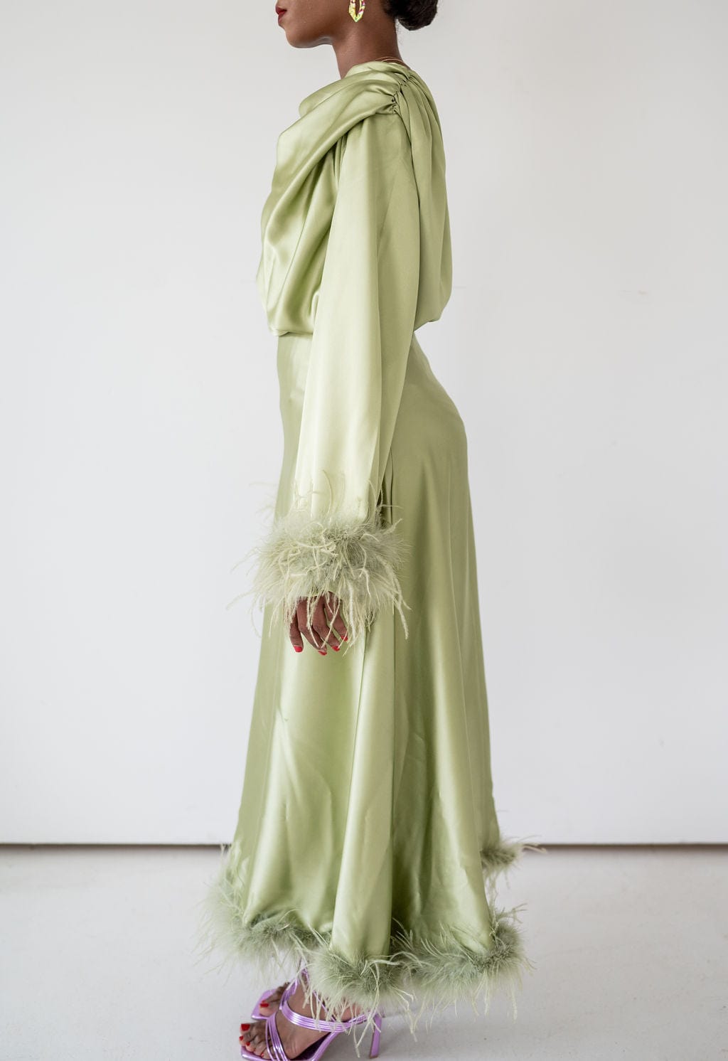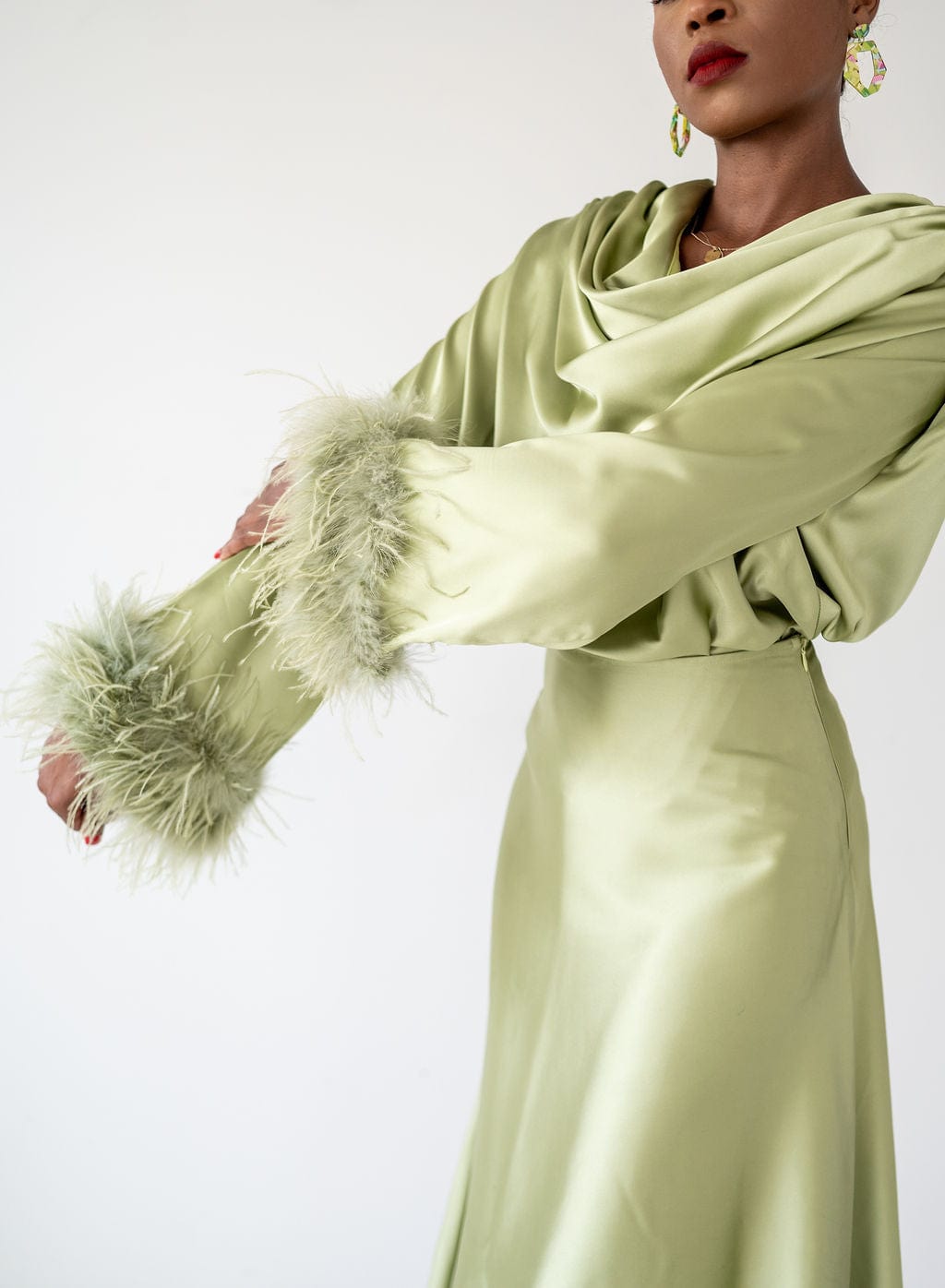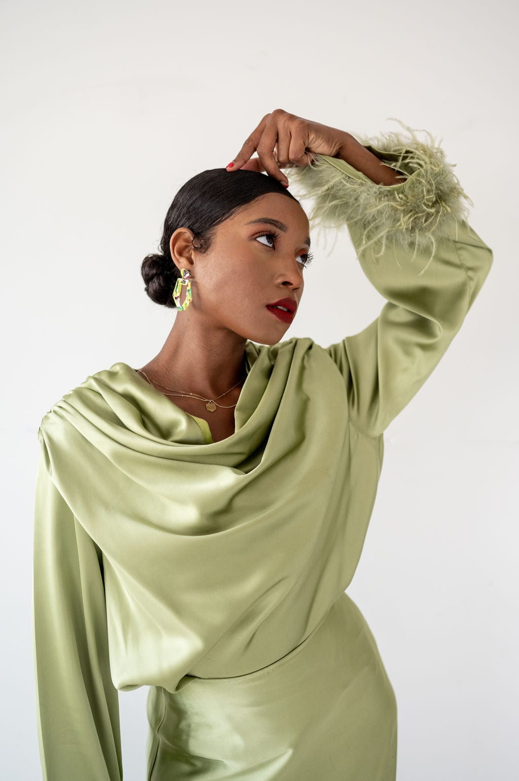 Zaina Feather Sleeve Draped Bodysuit- Sage