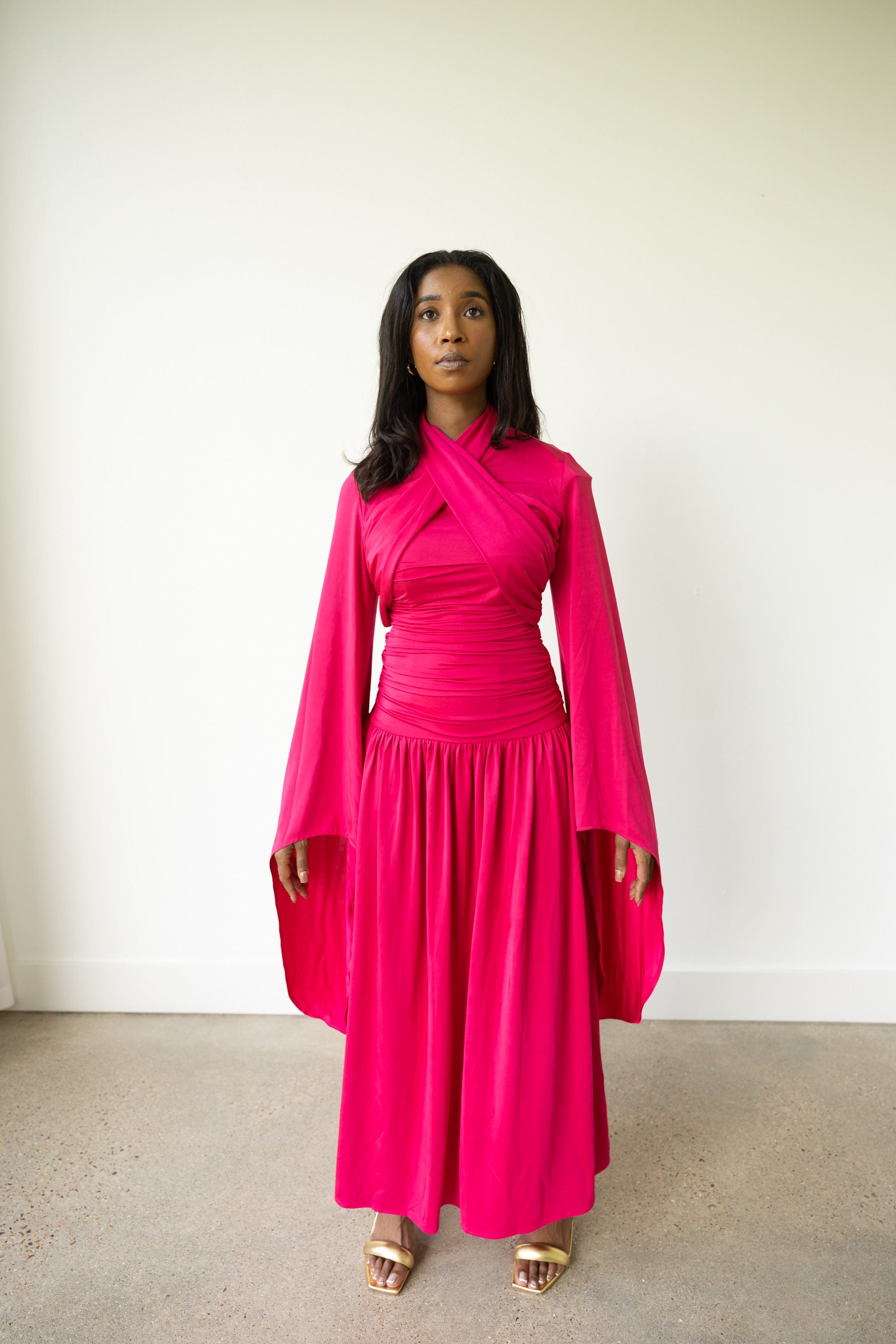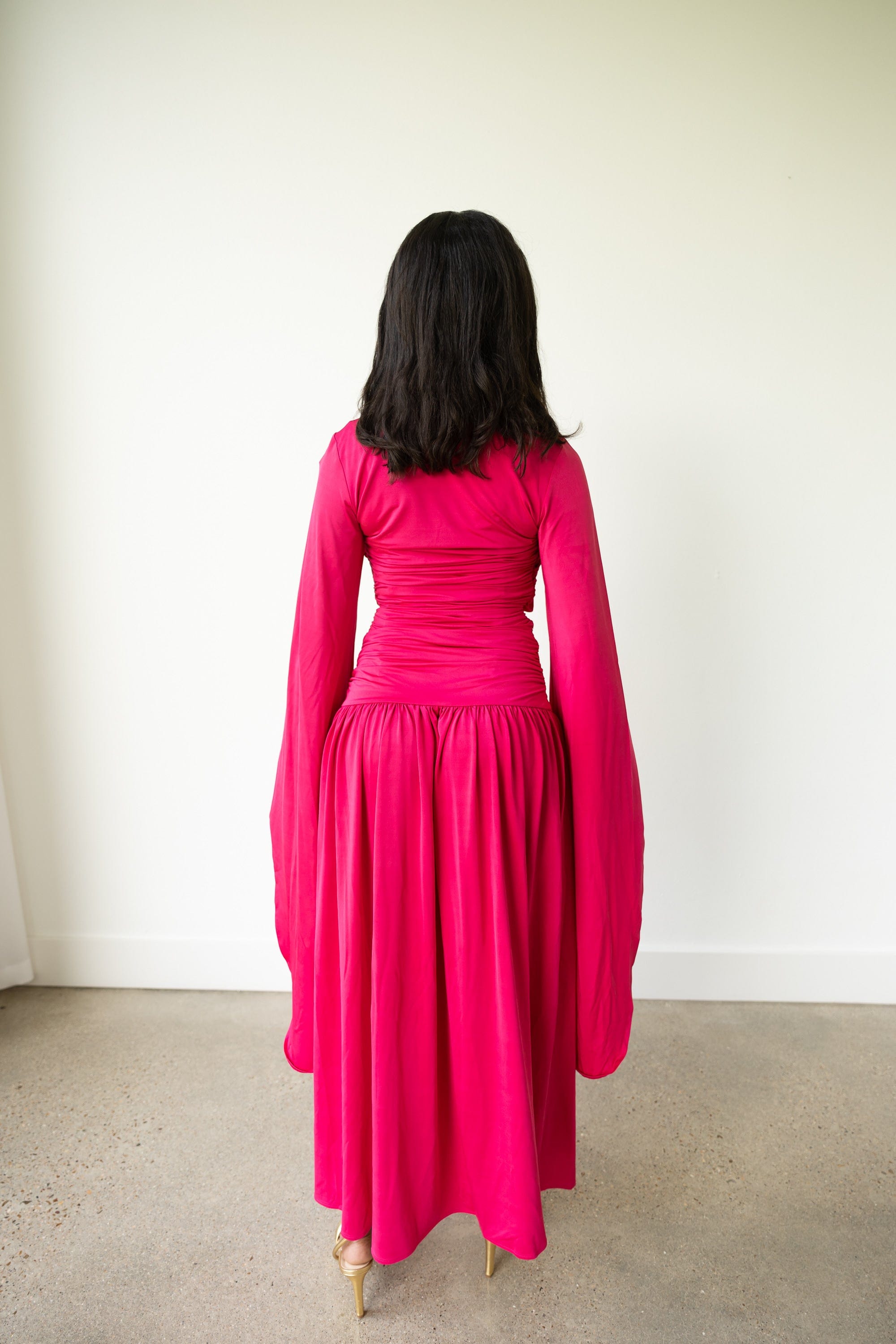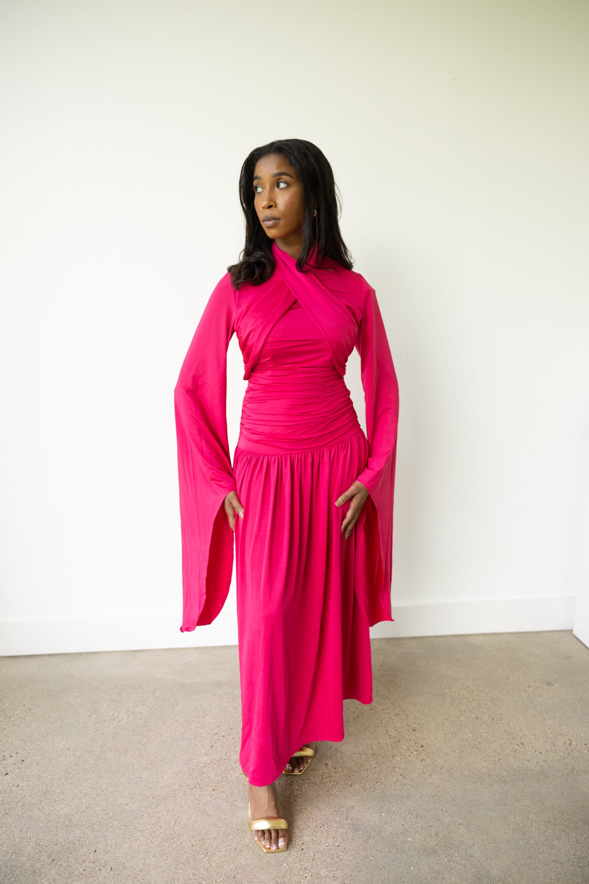 Mide Maxi Dress with Long Flowy Sleeves in Deep Pink