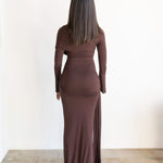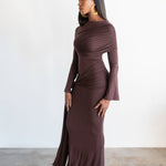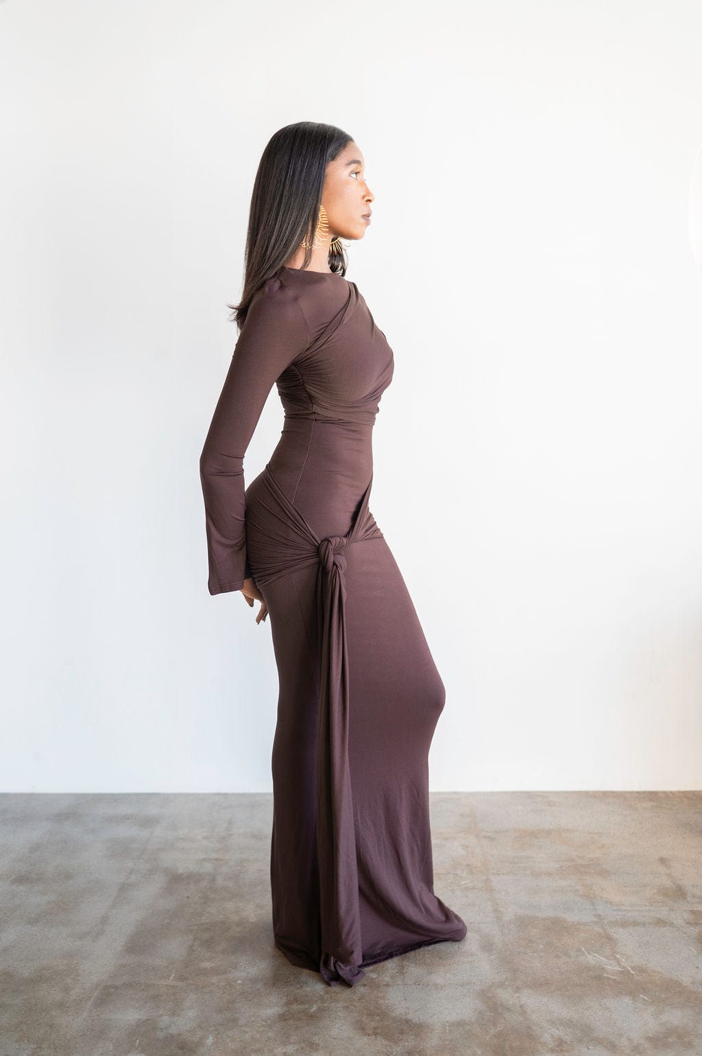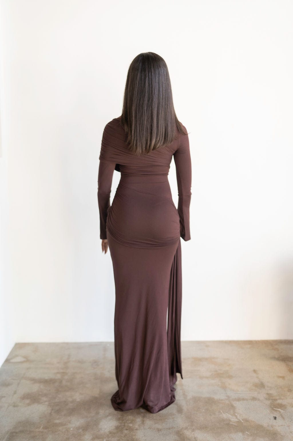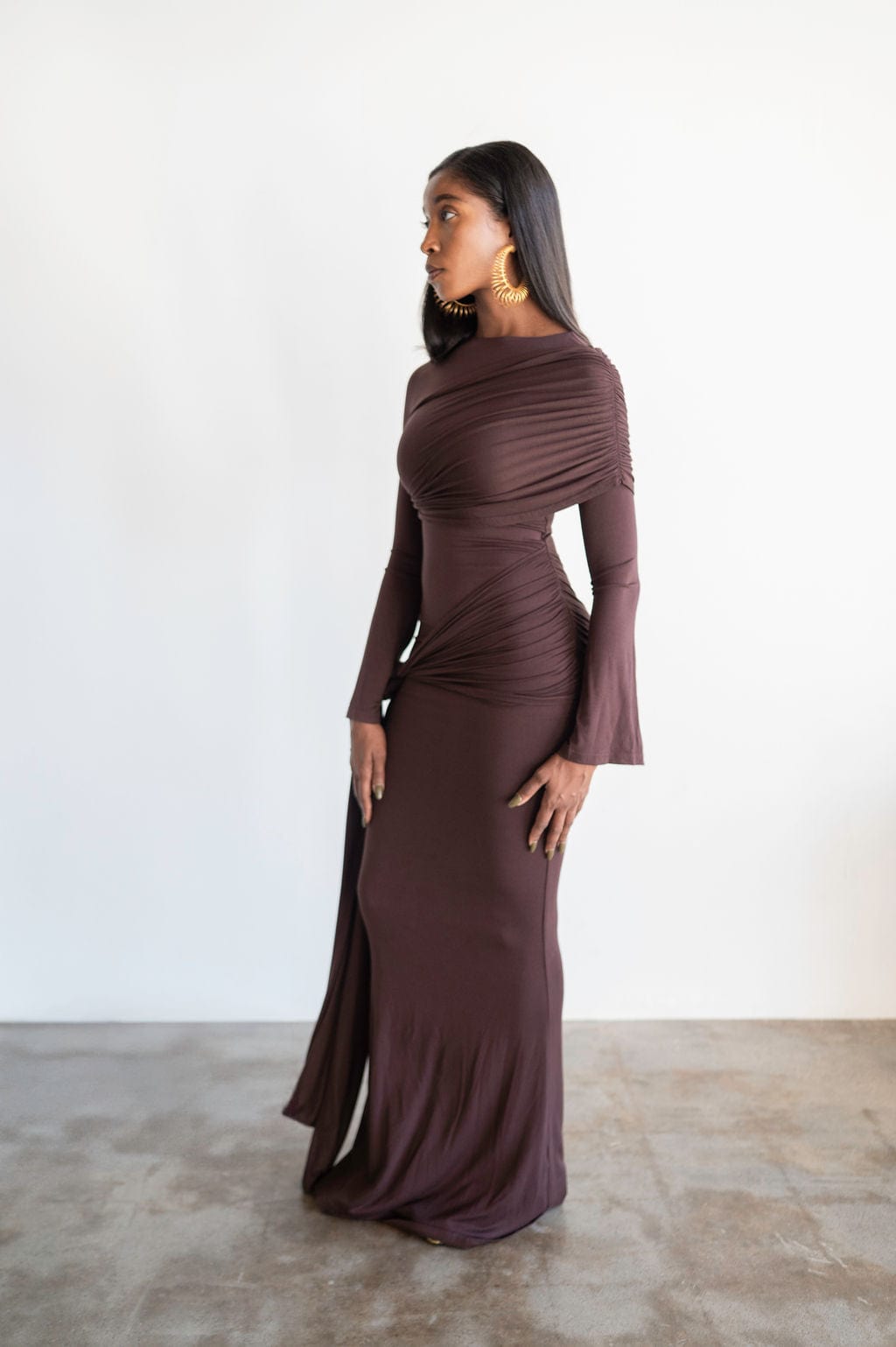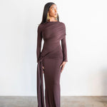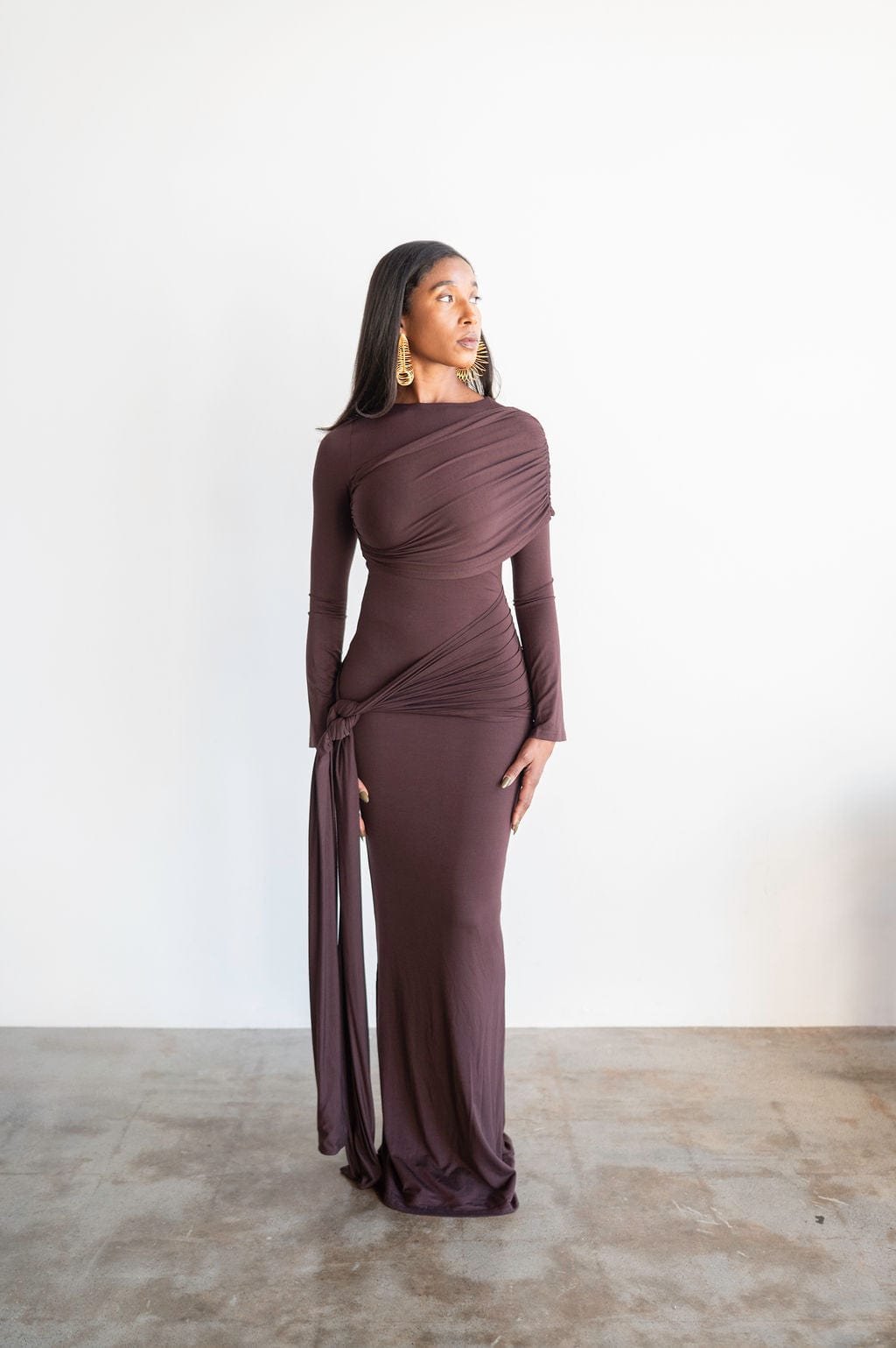 Tala Long Sleeve Asymmetrical Drape Maxi Dress in Mocha Brown