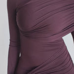 Elevate your wardrobe with the Tala Long Sleeve Asymmetrical Drape Maxi Dress in Mocha Brown. Its unique asymmetrical drape design creates a stunning silhouette that turns heads effortlessly. The long sleeves add elegance and versatility, making it perfect for both day and evening occasions. Stand out with this eye-catching dress that combines comfort and style in one unforgettable piece.