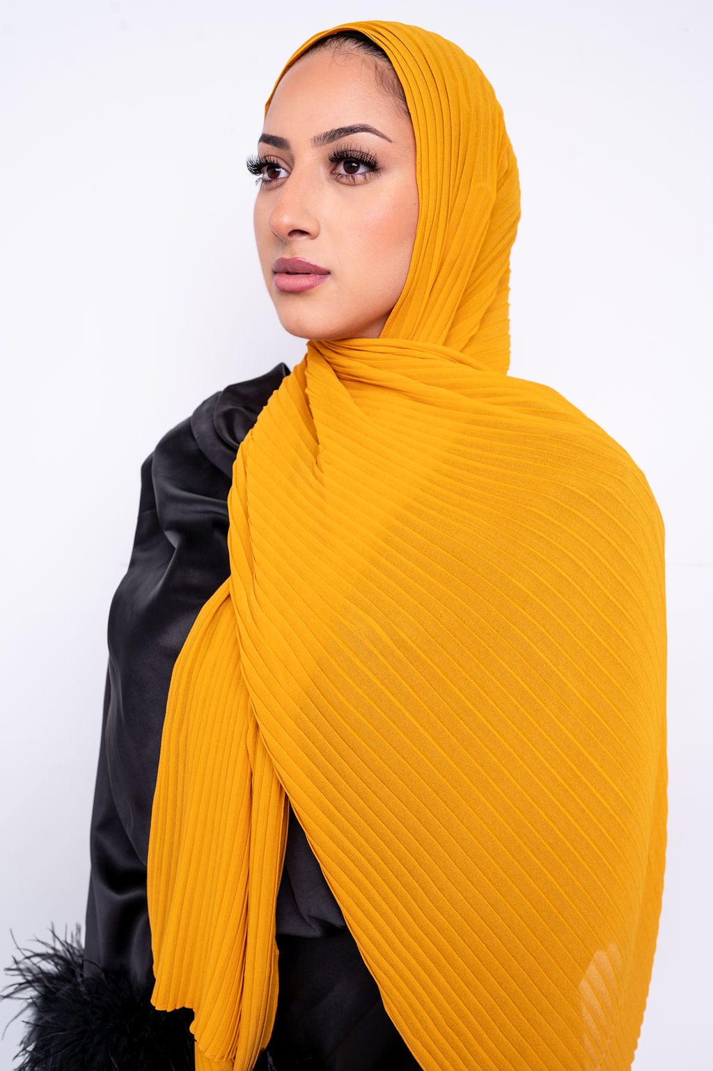 Our pleated chiffon scarves are lightweight is the perfect addition to any outfit. The You can tie it around your head as a full hijab, tie it to the back, or as a turban!