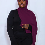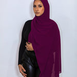This is a deep, rich burgundy color. It may appear differently due to light photography. Our chiffon scarfs are incredibly high quality and feel like butter on your skin. This scarf can be worn tied to the back, as a turban, or as a traditional hijab. The possibilities are endless with RI MI. The measurements are 180 x 70 cm.