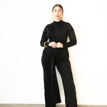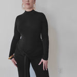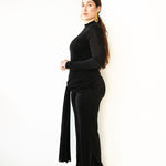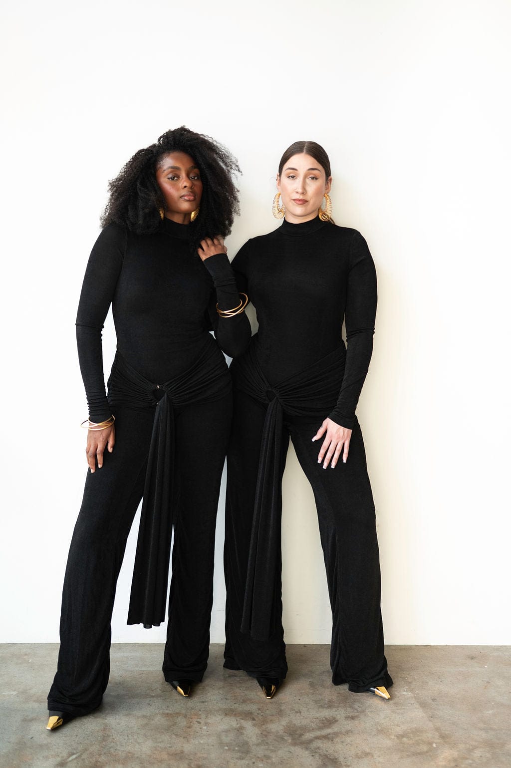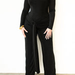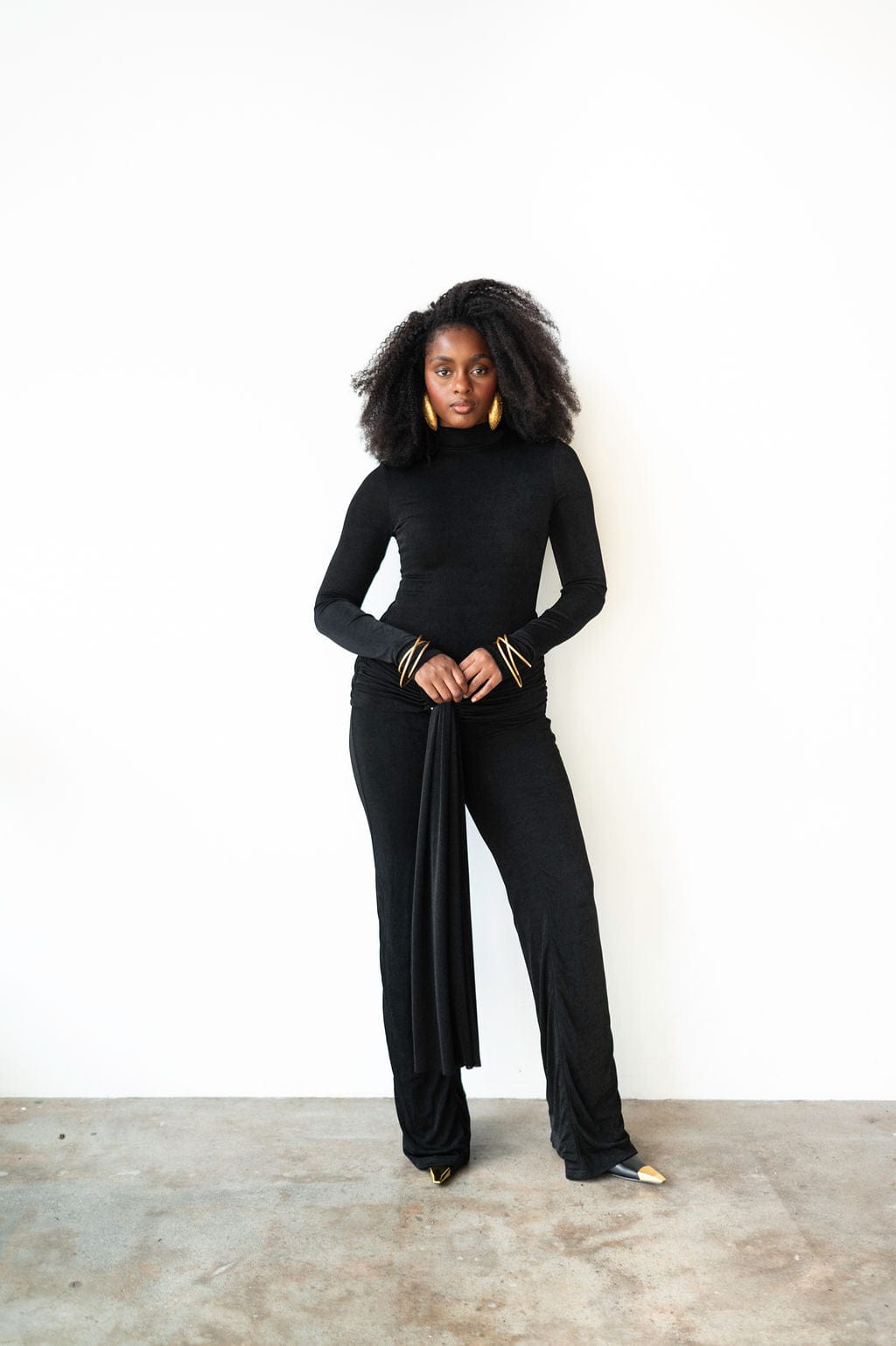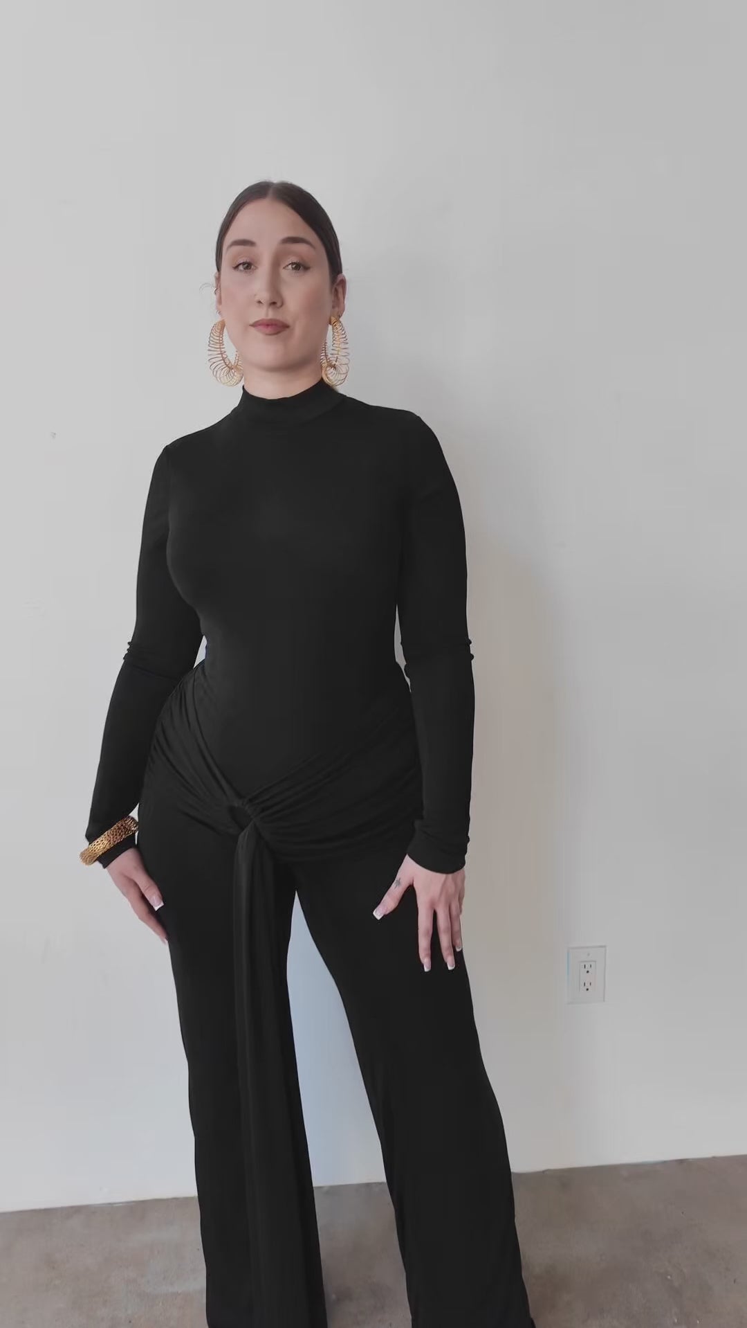 Elevate your evening wardrobe with the Kiki Long Sleeve Draped Jumpsuit in Black. Crafted from luxuriously slinky fabric, this sophisticated piece features graceful draped detailing that creates an effortlessly chic silhouette. The long sleeves provide elegant coverage while the fluid draping adds movement and dimension to your look. Perfect for cocktail events, date nights, or upscale gatherings, this jumpsuit combines comfort with refined style. The sleek black hue ensures versatility, pairing seamlessly with heels and statement jewelry for an unforgettable impression.