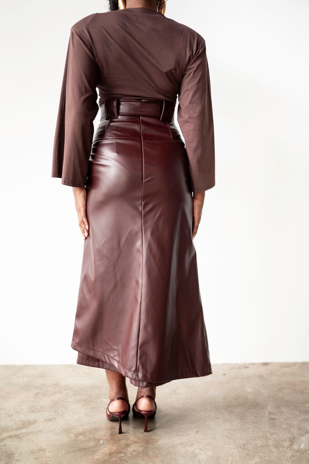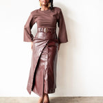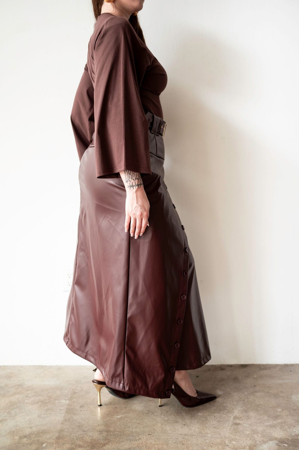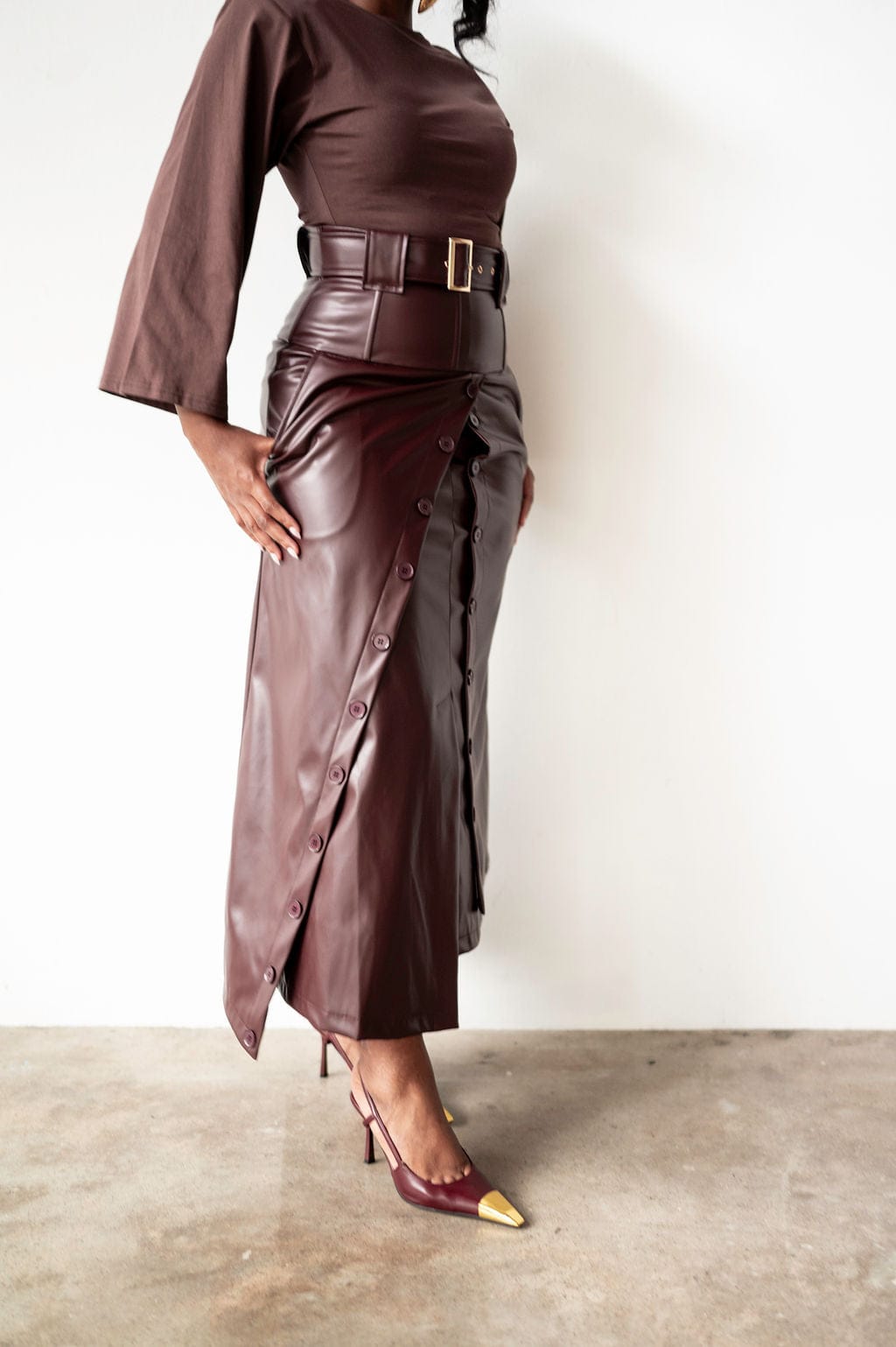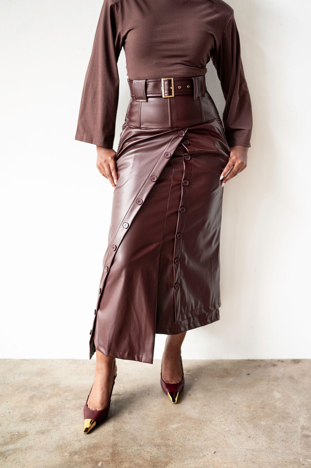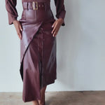 Elevate your wardrobe with the Lai High Waist Asymmetrical Button Skirt in rich mahogany vegan leather. This statement piece features an eye-catching asymmetrical cut and strategic button detailing that commands attention. Crafted from sustainable vegan leather, it delivers that coveted boss energy while keeping your style ethically conscious. If you're already obsessed with the original Lai silhouette, this reimagined version takes it further with its daring asymmetry and luxe finish. Perfect for those who refuse to blend in.