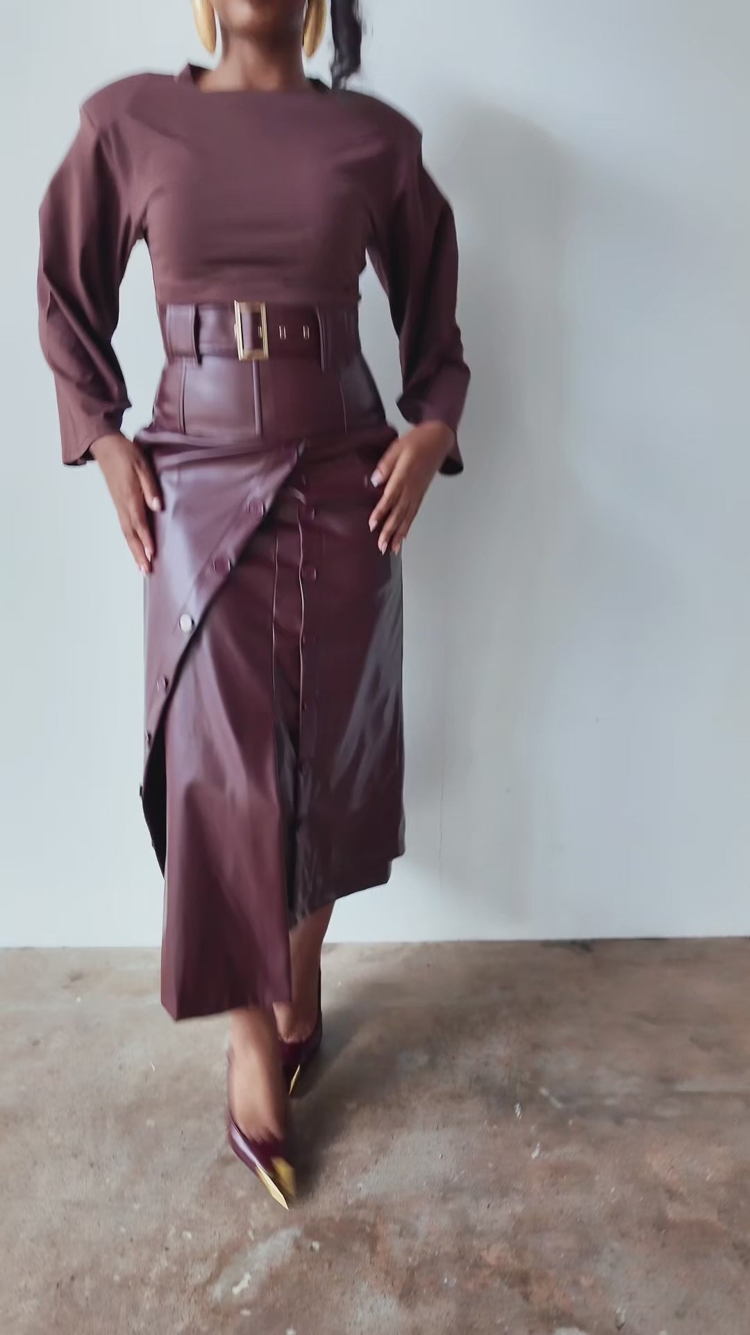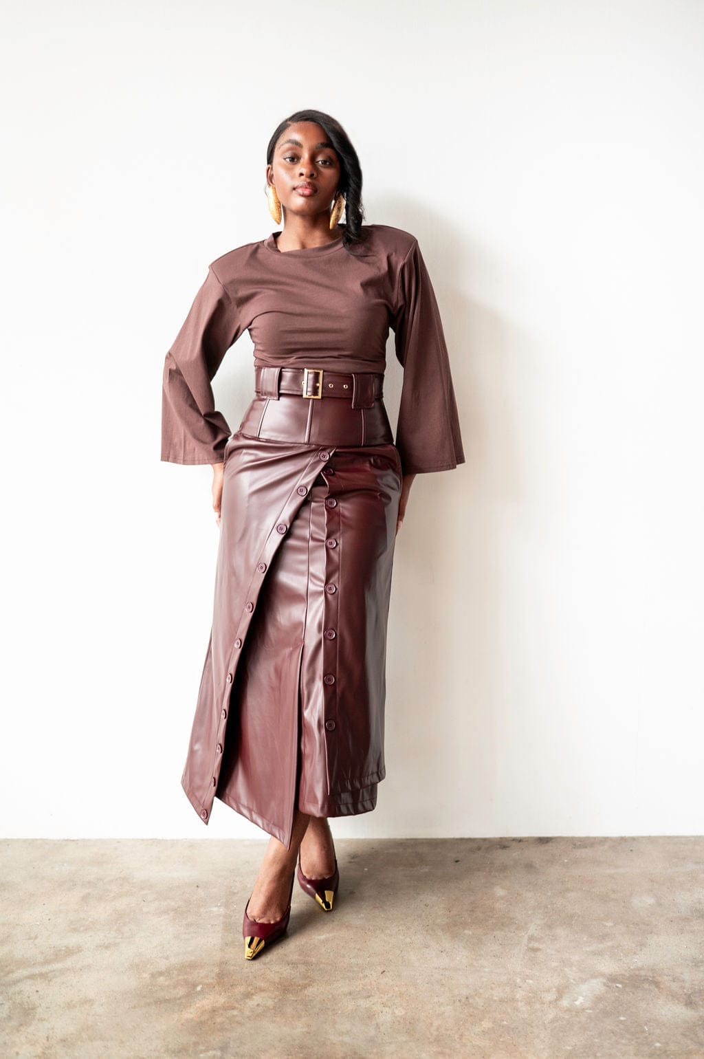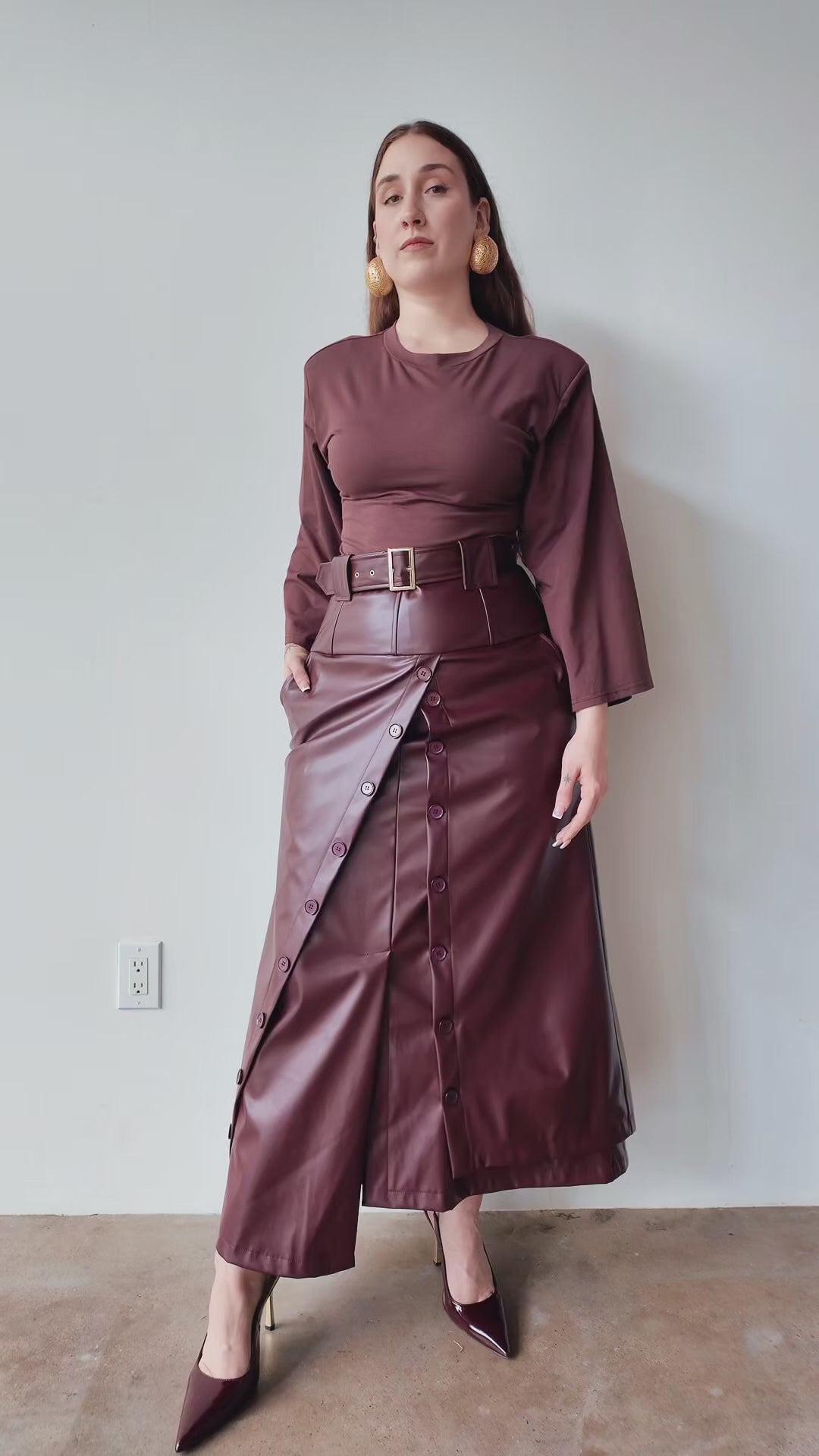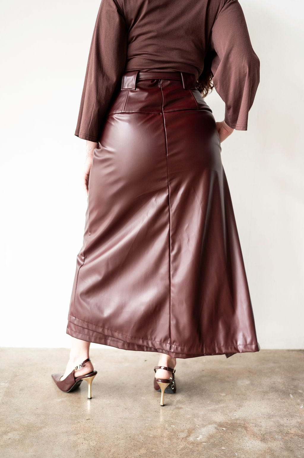Elevate your wardrobe with the Lai High Waist Asymmetrical Button Skirt in rich mahogany vegan leather. This statement piece features an eye-catching asymmetrical cut and strategic button detailing that commands attention. Crafted from sustainable vegan leather, it delivers that coveted boss energy while keeping your style ethically conscious. If you're already obsessed with the original Lai silhouette, this reimagined version takes it further with its daring asymmetry and luxe finish. Perfect for those who refuse to blend in.