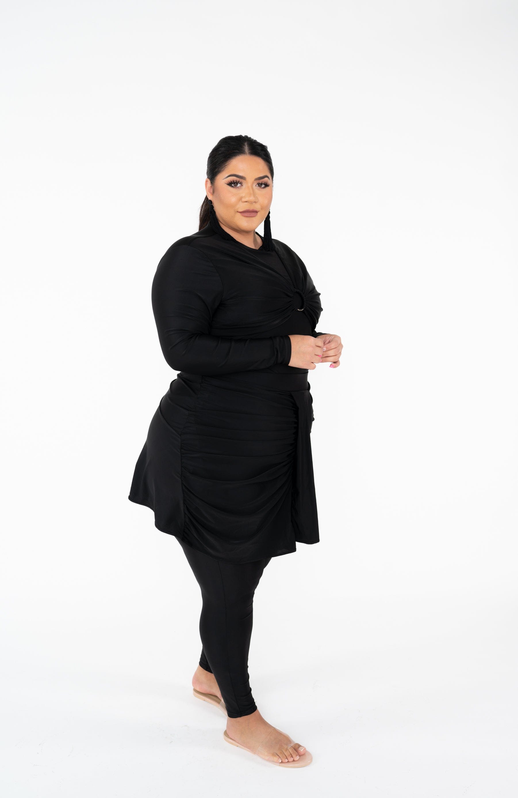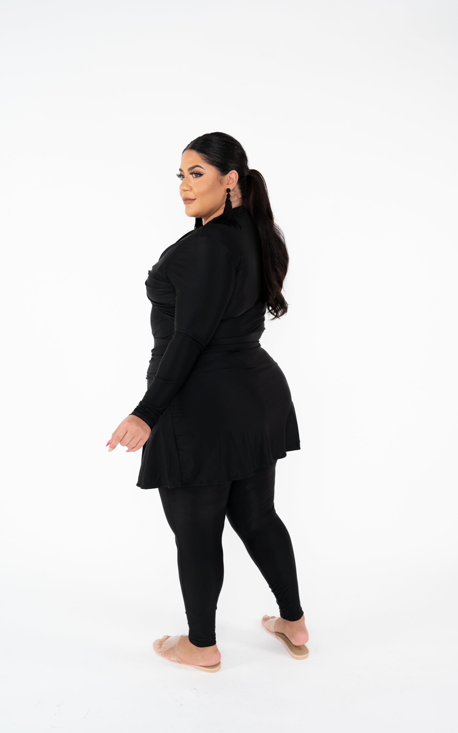 RI MI modest swimsuits come with four pieces; head turban, bodysuit, overskirt, leggings. We recommend you wear your bodysuit first, then your leggings, and then your overskirt. All swimsuits are made of high quality, quick drying swim fabric.