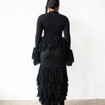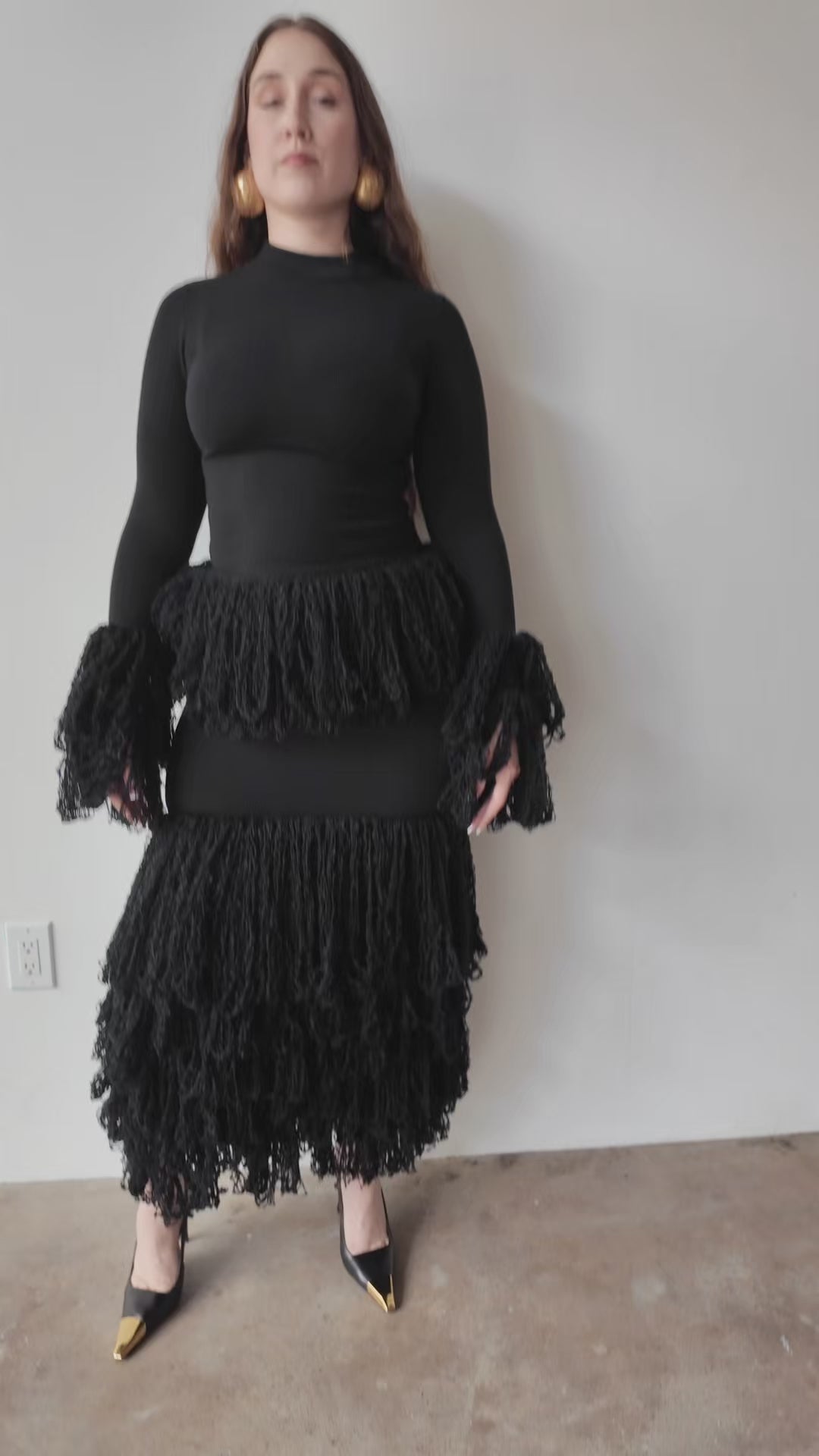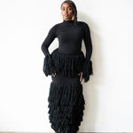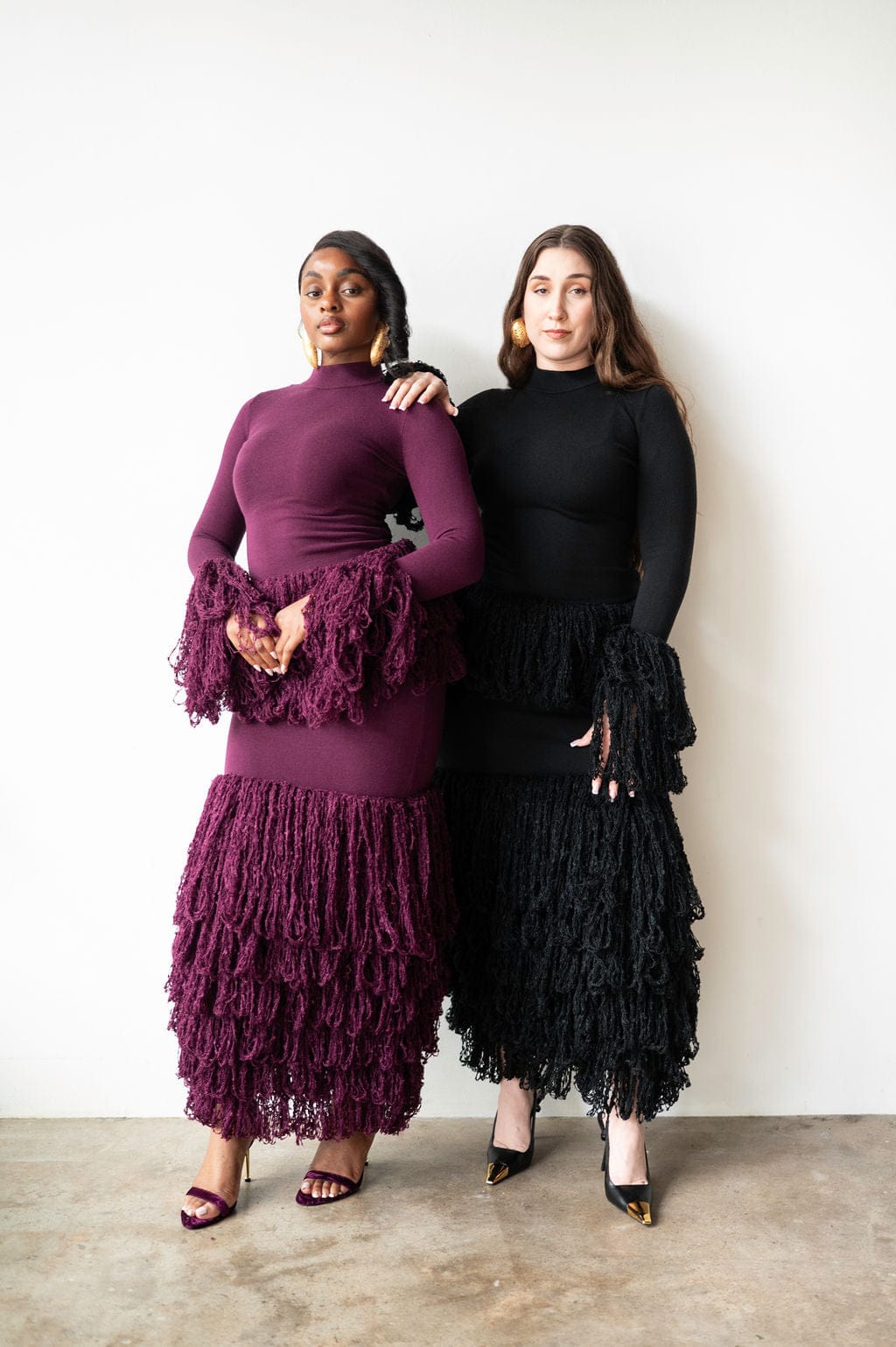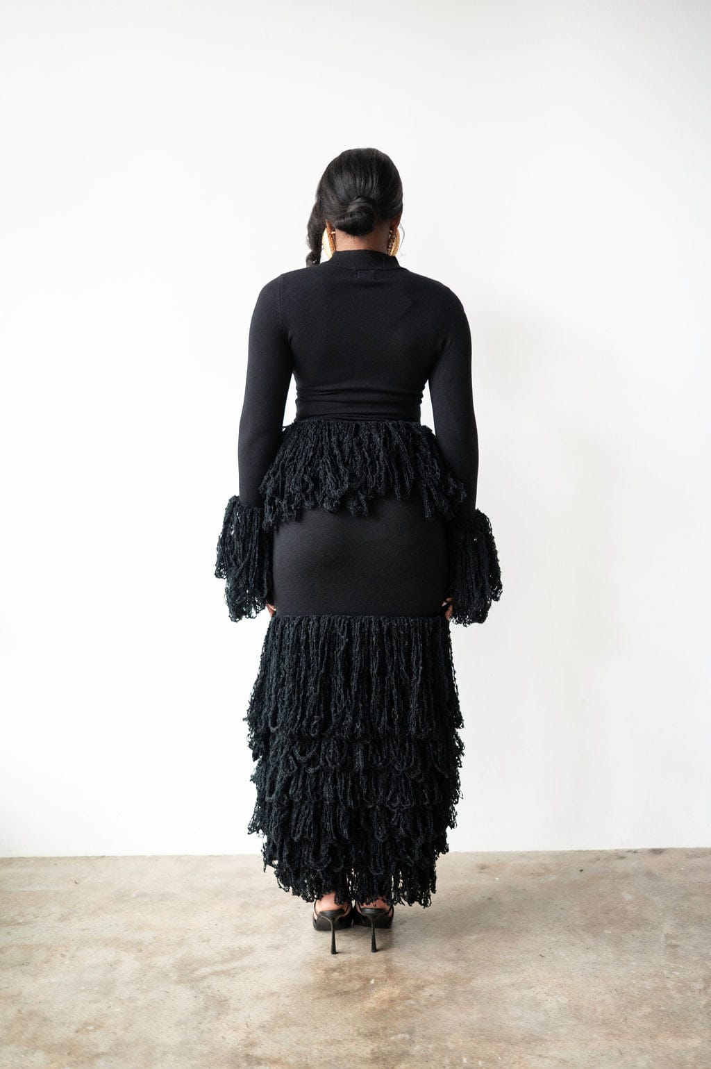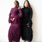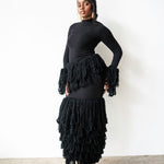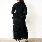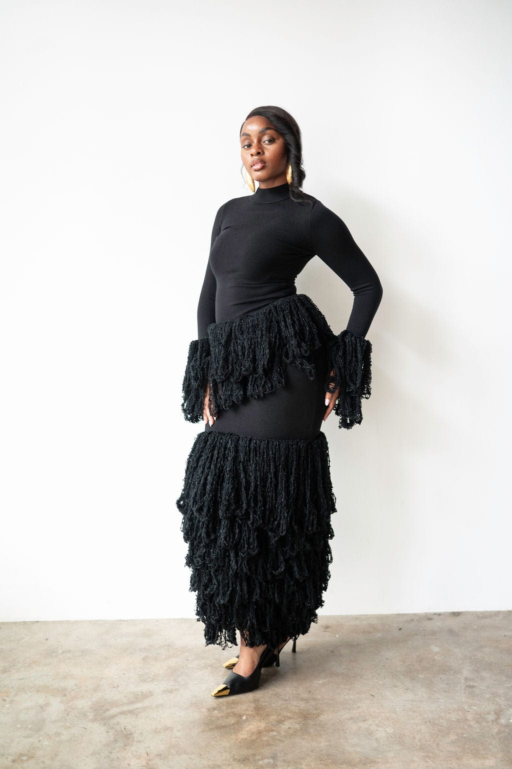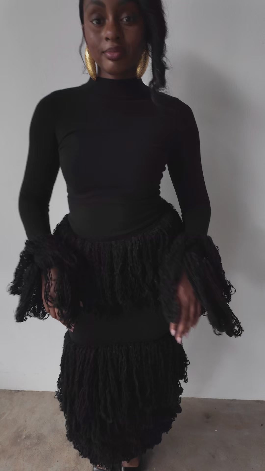 Make a statement with the Wura High Neck Long Sleeve Tassel Knit Top in Black—a bold piece designed for queens who aren't afraid to stand out. This stunning knit features eye-catching tassels and a flattering high neckline that commands attention. The black hued top pairs beautifully with our matching skirt to create an unforgettable dress, or mix and match with your favorite pieces for endless styling possibilities. Whether you're layering it for warmth or showcasing it as your main event, this versatile top celebrates your fearless fashion sense and unique style.