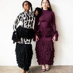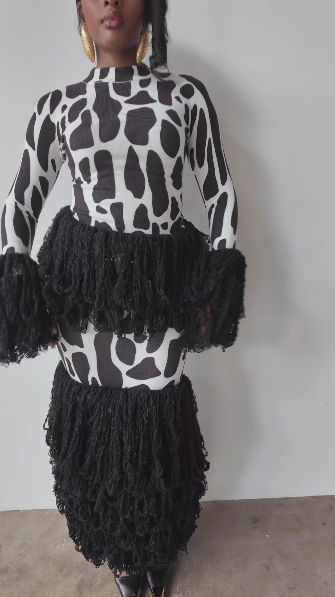 Make a statement with the Wura High Neck Long Sleeve Tassel Knit Top in Black and White—a bold piece designed for queens who aren't afraid to stand out. This stunning knit features eye-catching tassels and a flattering high neckline that commands attention. The black and white print top pairs beautifully with our matching skirt to create an unforgettable dress, or mix and match with your favorite pieces for endless styling possibilities. Whether you're layering it for warmth or showcasing it as your main event, this versatile top celebrates your fearless fashion sense and unique style.