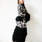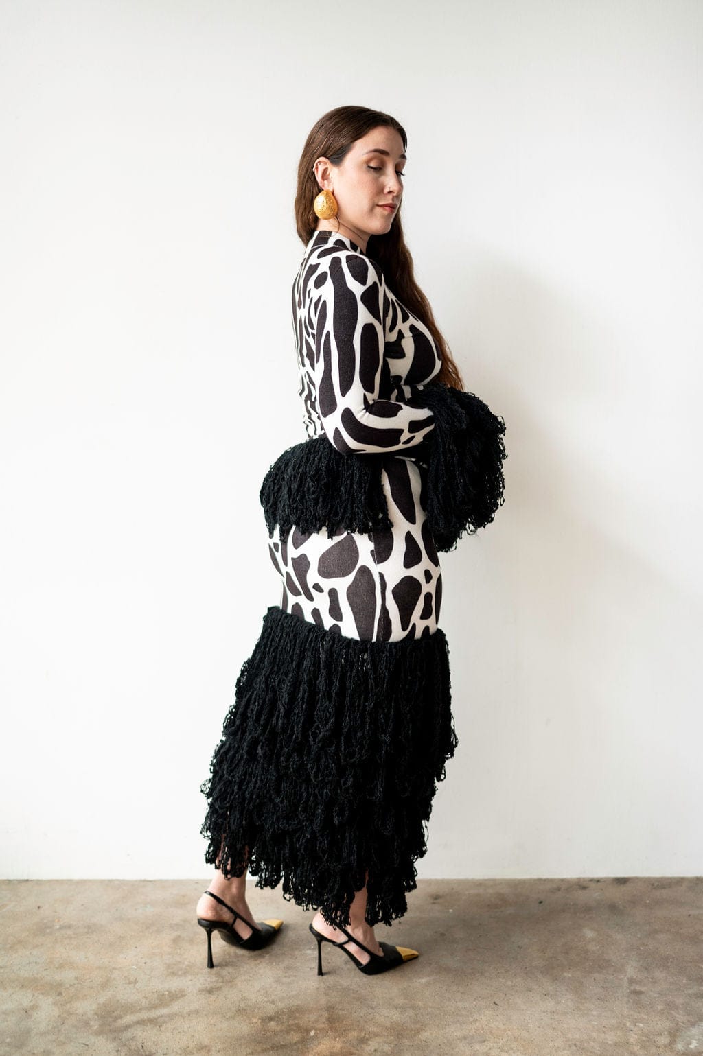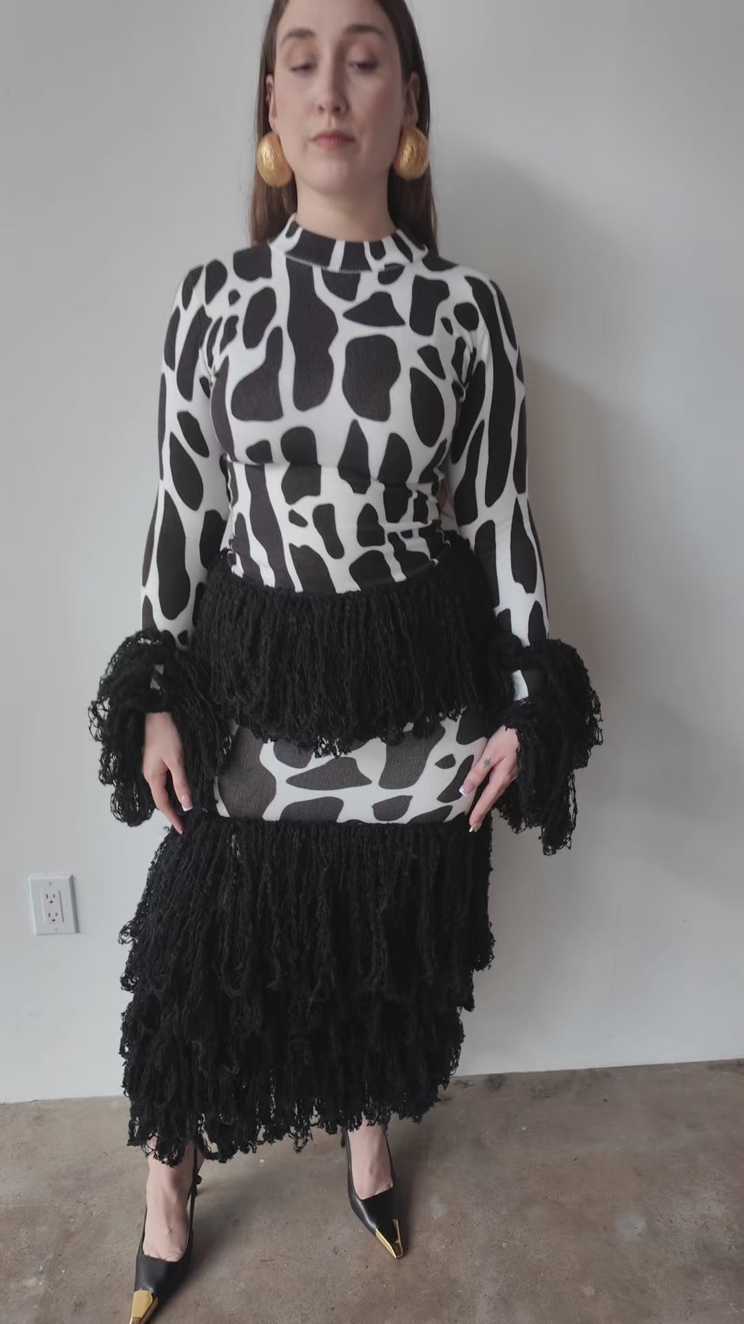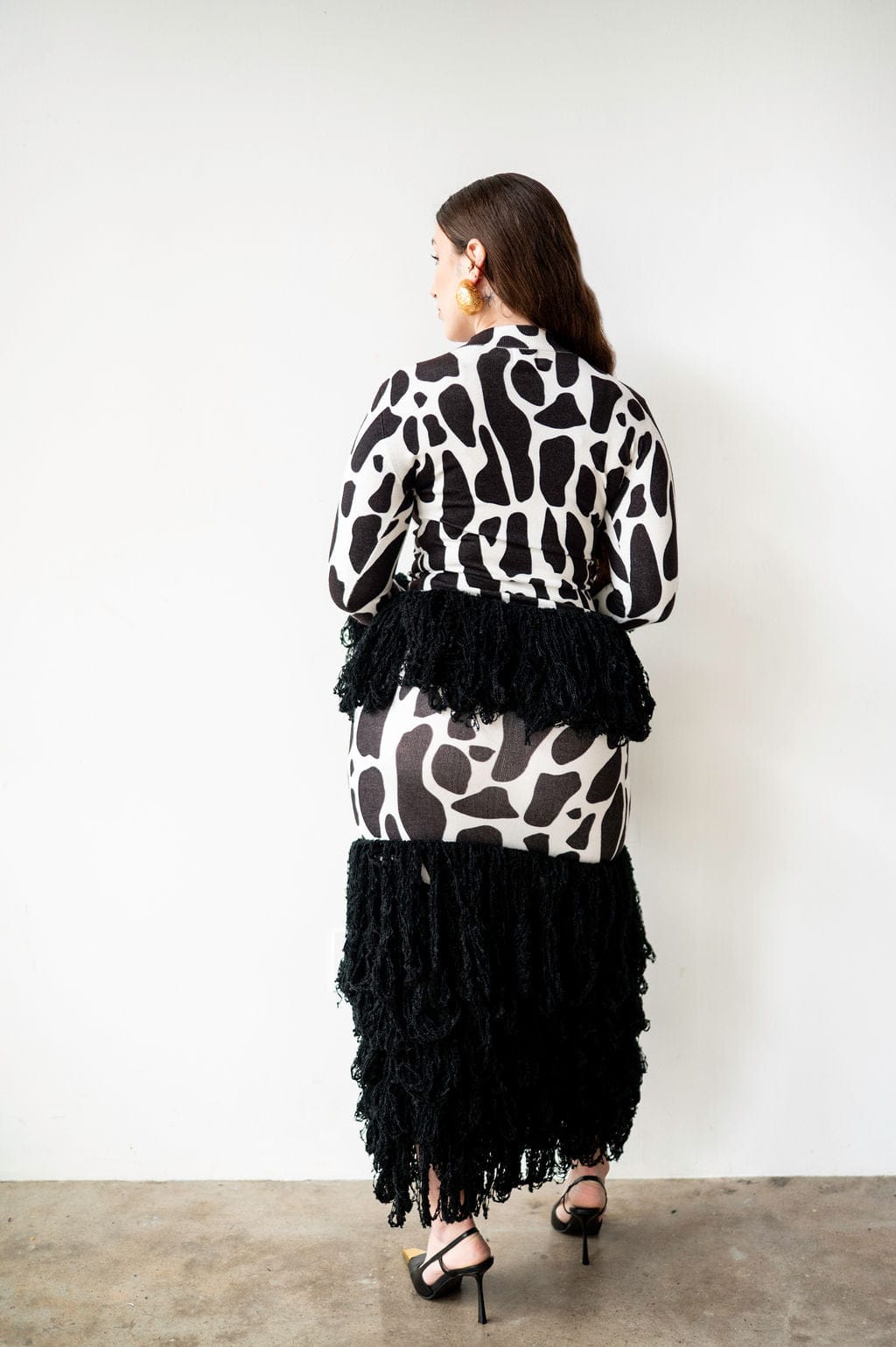 Wura High Neck Long Sleeve Tassel Knit Top in Black and White Print