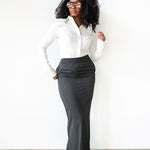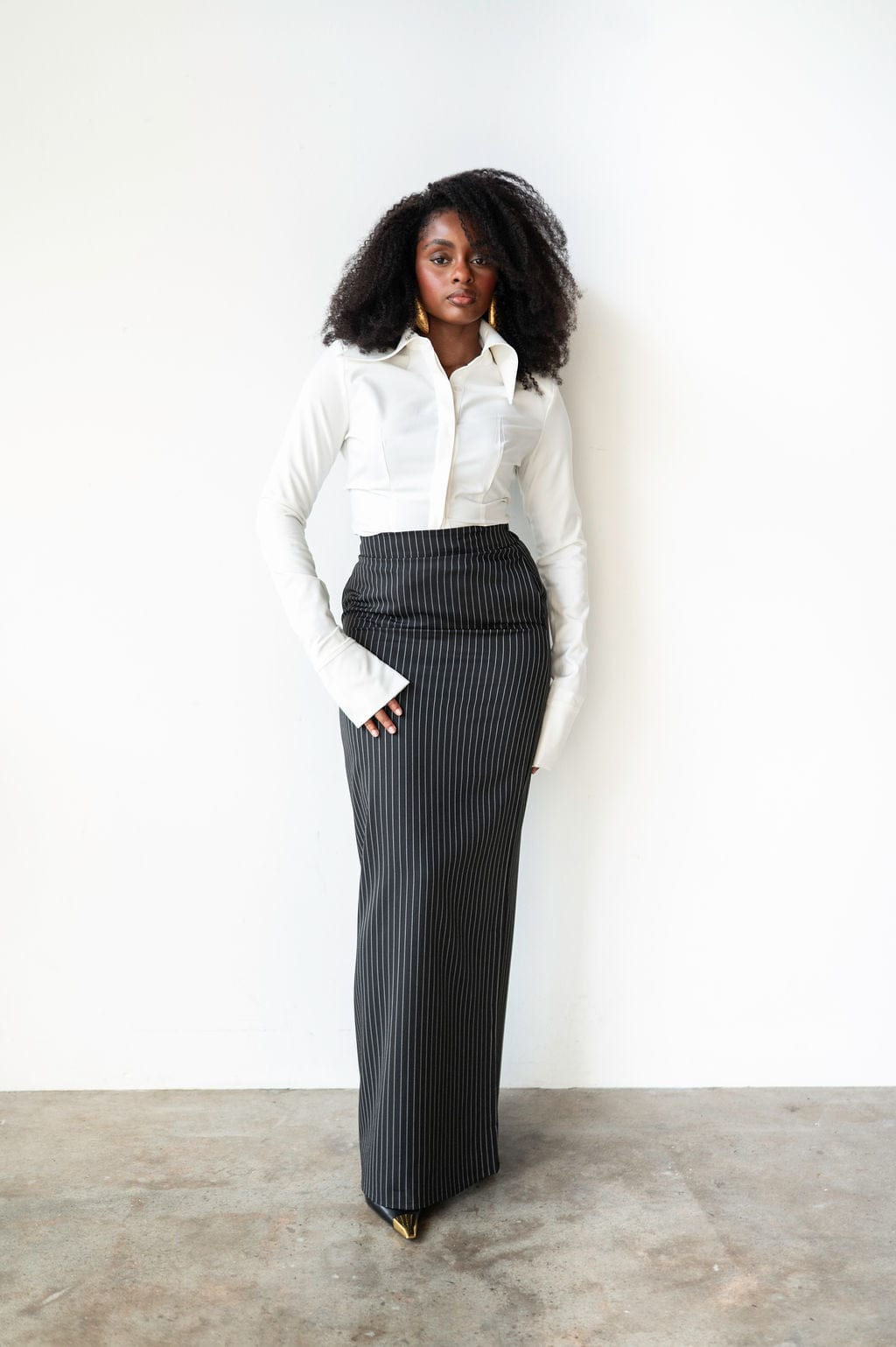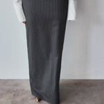 The Ade Long Sleeve Maxi Skirt in Black Pinstripe combines timeless elegance with modern sophistication. Crafted from soft, breathable fabric, this skirt features a flowing maxi silhouette that flatters all body shapes. The subtle pinstripe pattern adds a refined, professional touch, making it ideal for work, casual outings, or special occasions. Its high-waisted design enhances the waistline while allowing comfortable movement throughout the day. Pair it with blouses, sweaters, or tailored tops for a versatile, stylish ensemble.