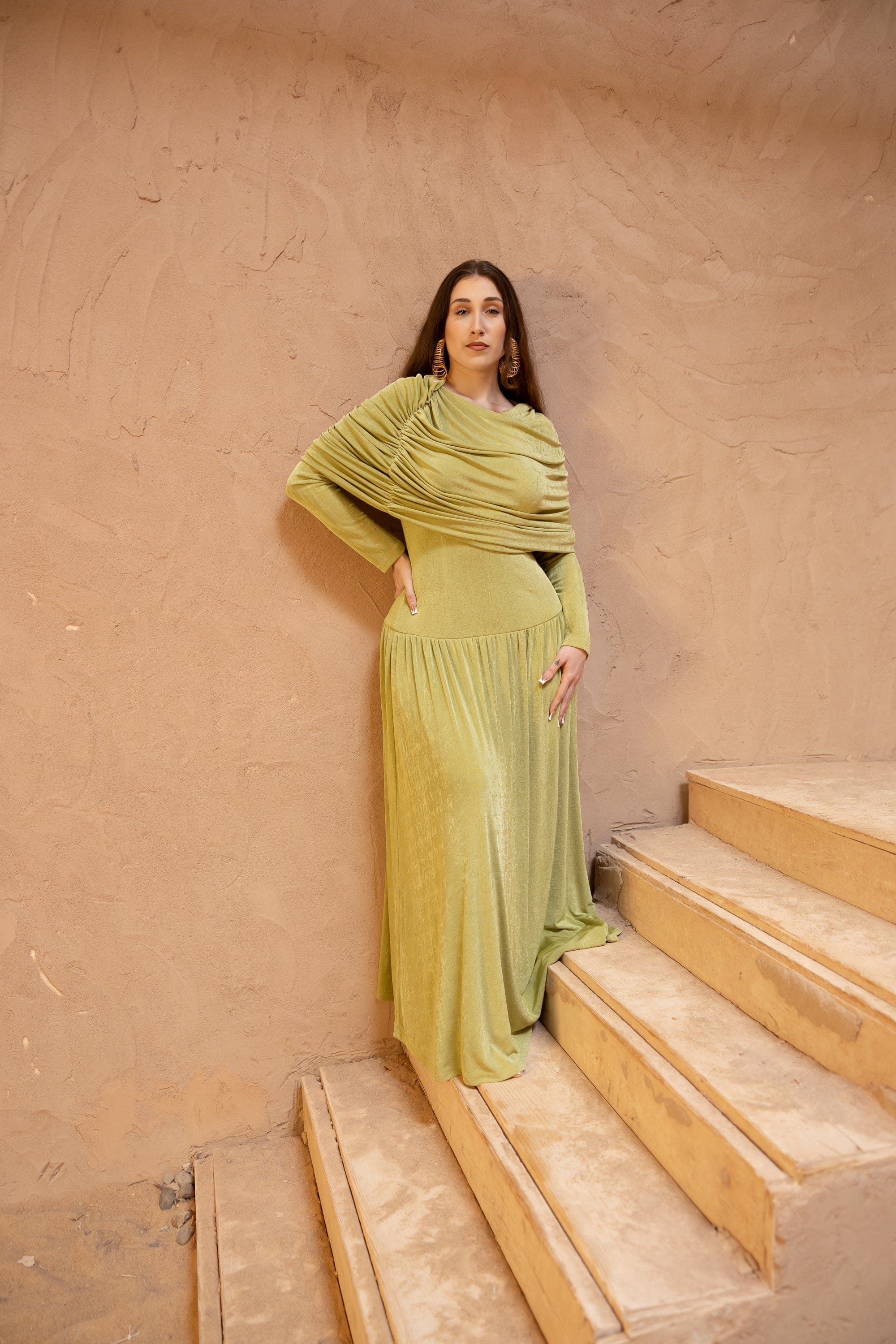 This dress is well made, lined and has substantial weight to the fabric. From the pictures I could not tell to what degree the outer cape was attached to the dress (and range of motion of that over piece). The cape/shawl is mobile (not attched to sleeves, only neckline) and can be worn many ways. I got a lot of compliments on the dress and can't wait to wear it again!