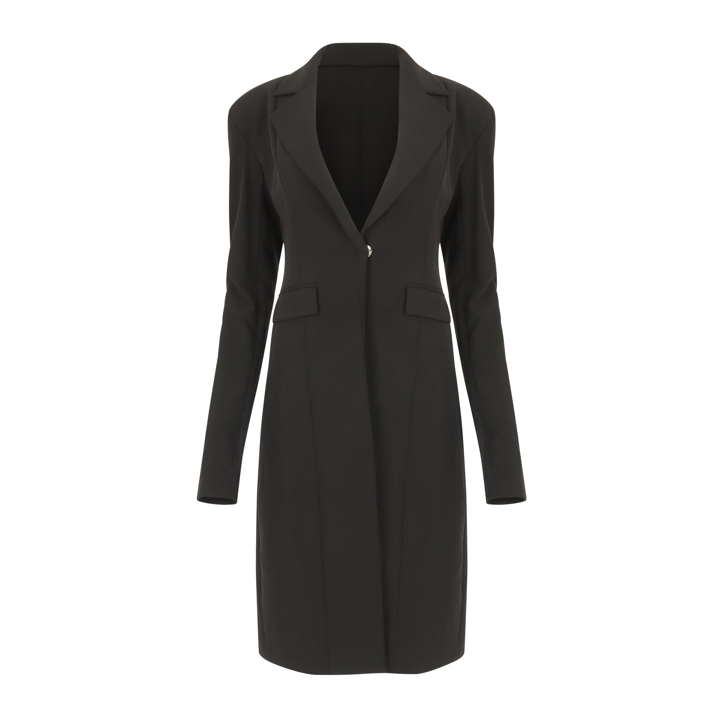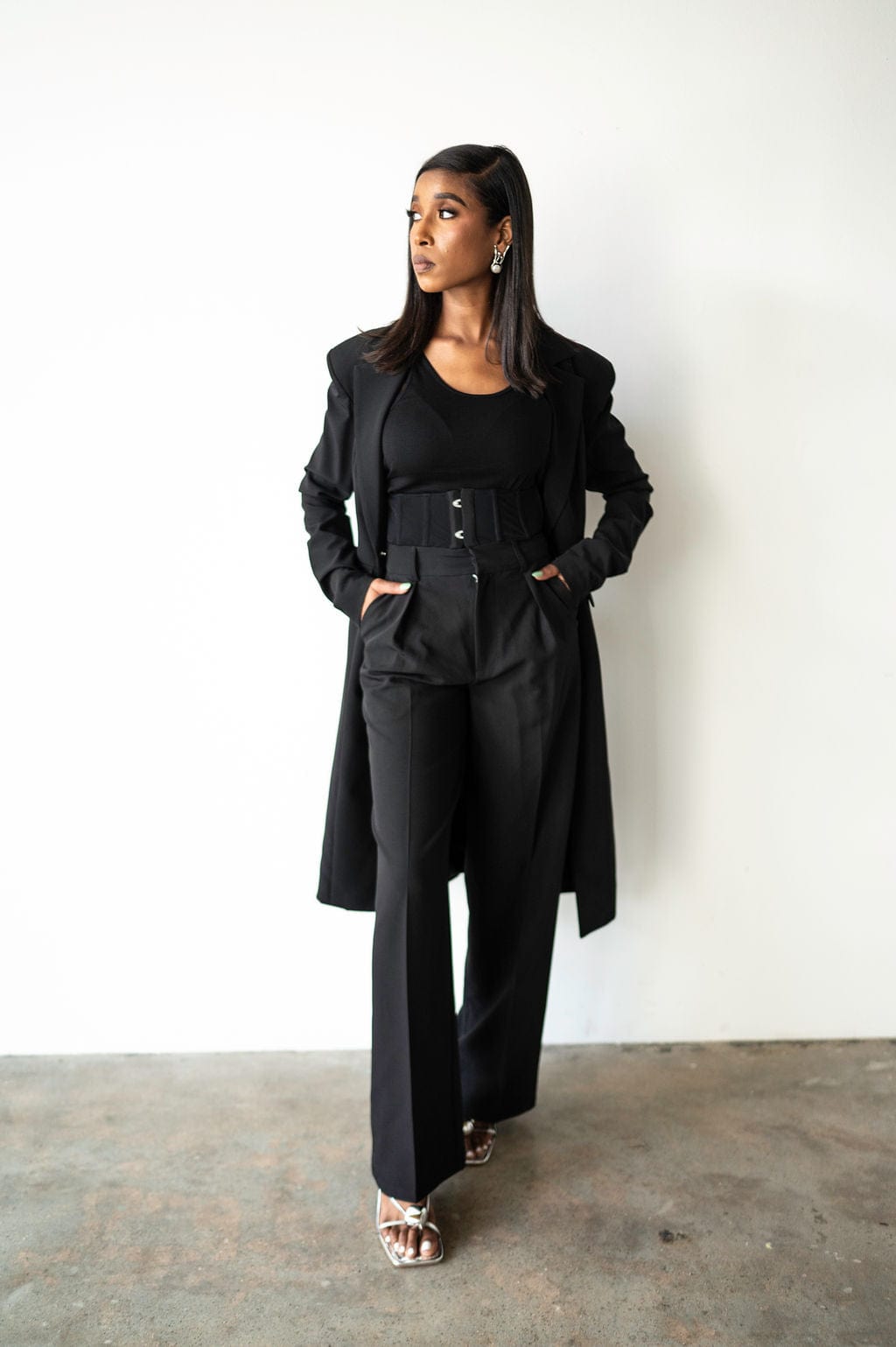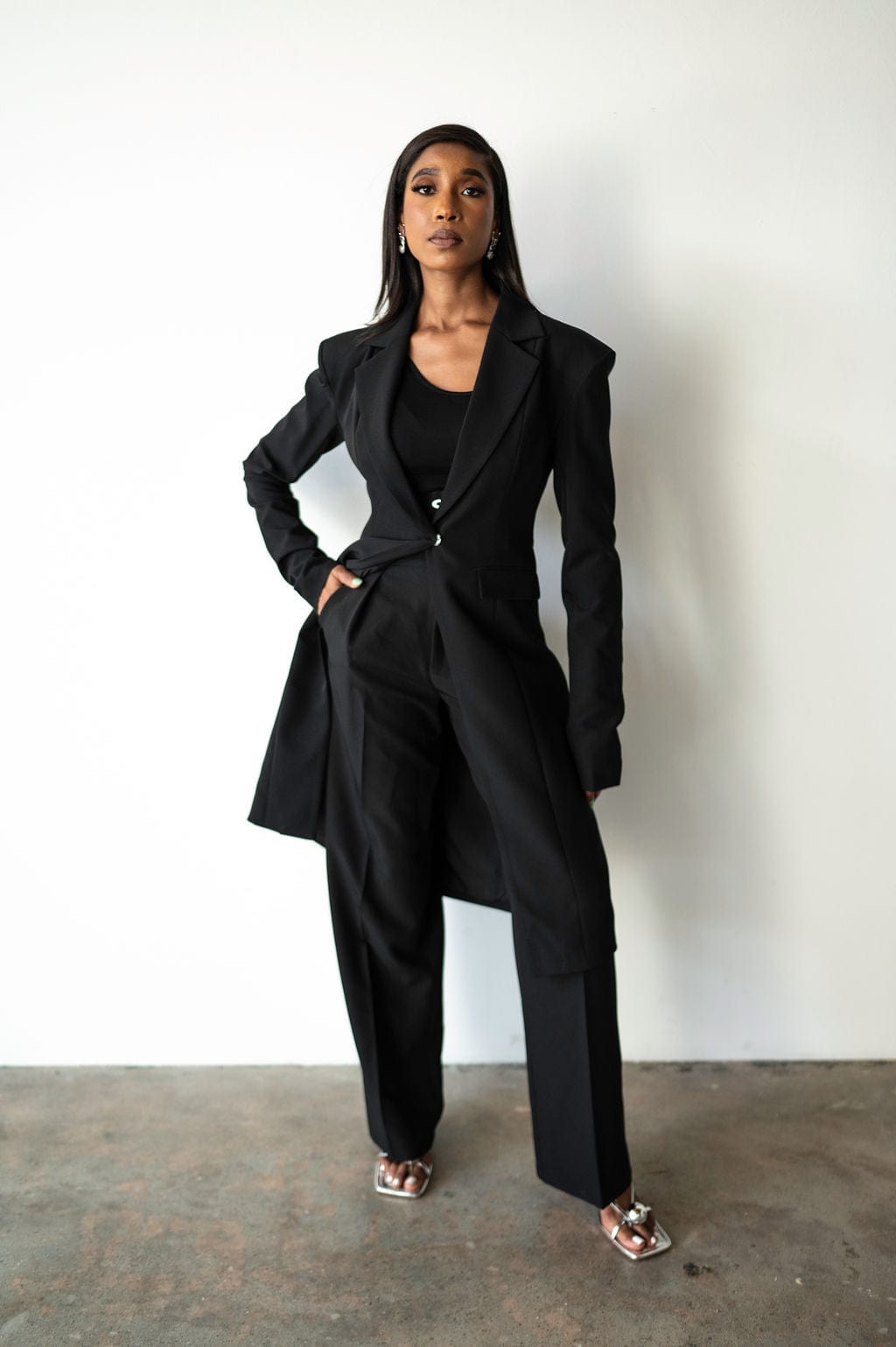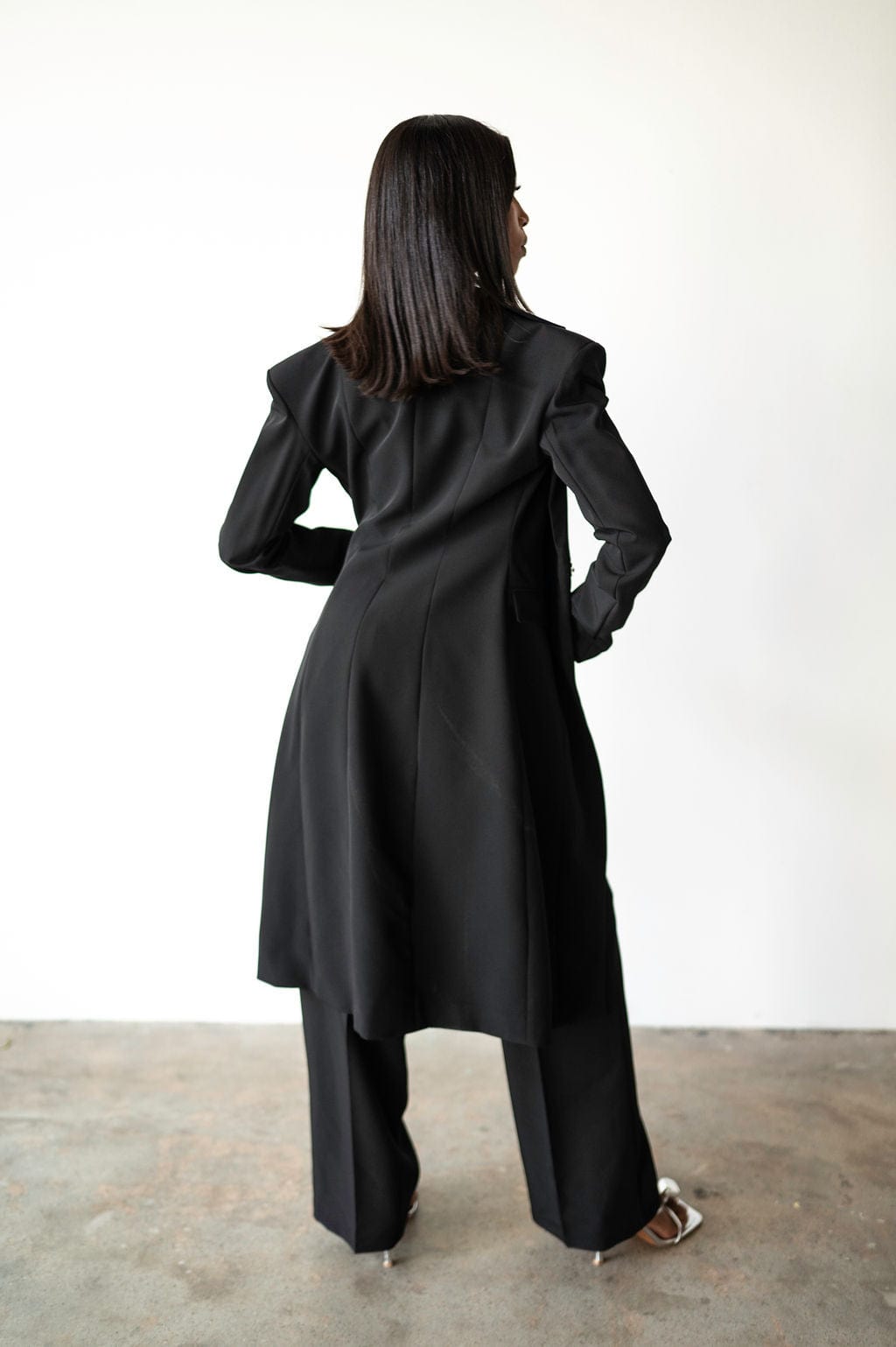 Make a bold statement with the Amaya Power Suit Long Blazer in Black! This chic blazer not only offers a sleek and professional look, but also brings in the waist for a flattering silhouette. Elevate your style and confidence with this must-have piece!