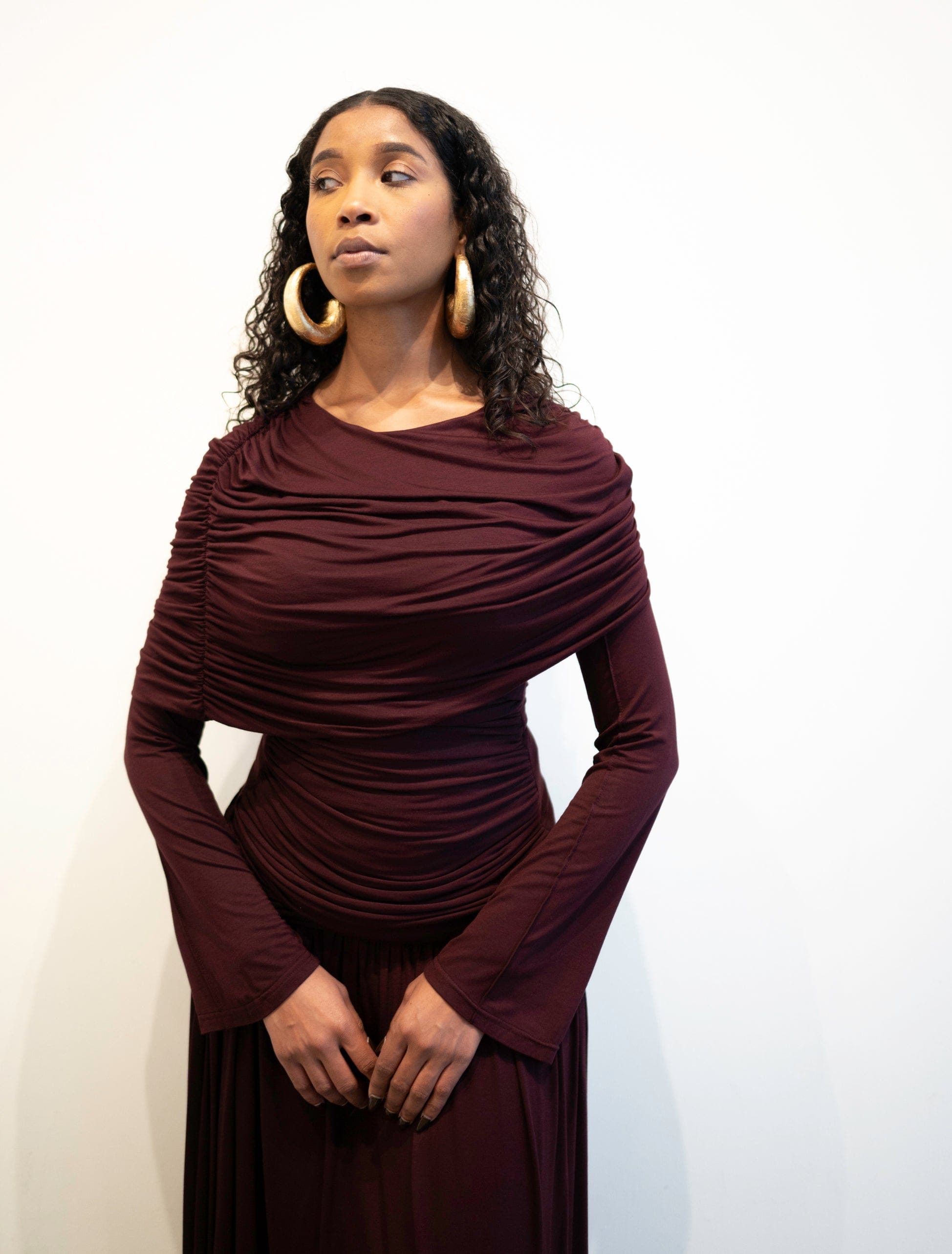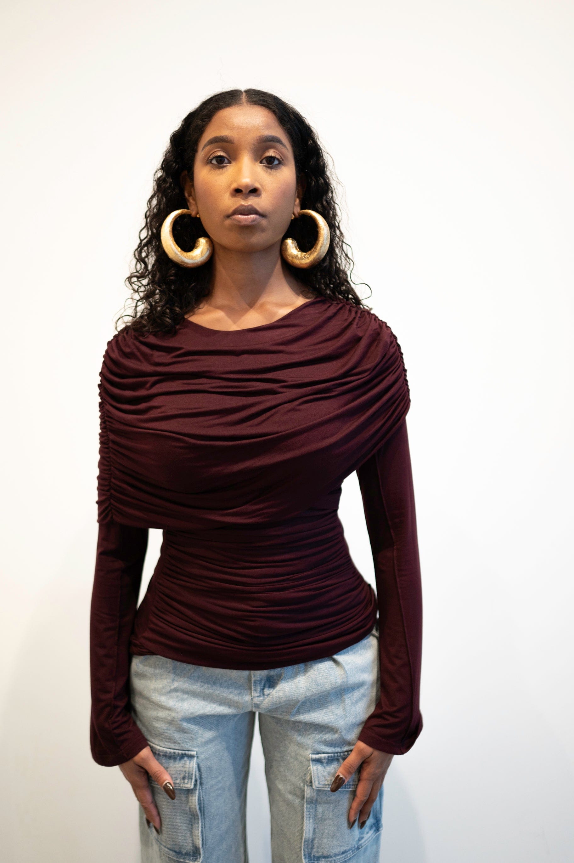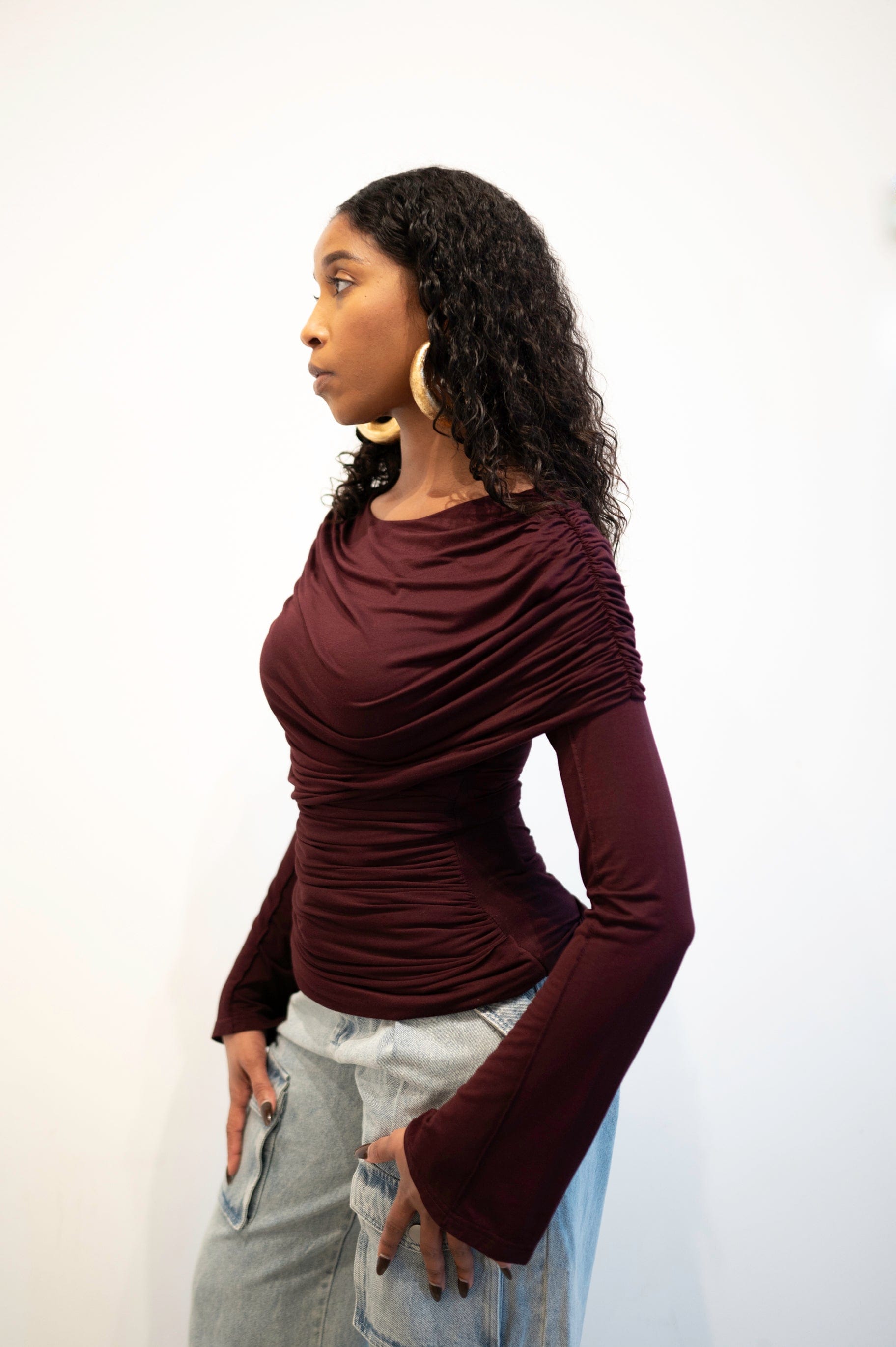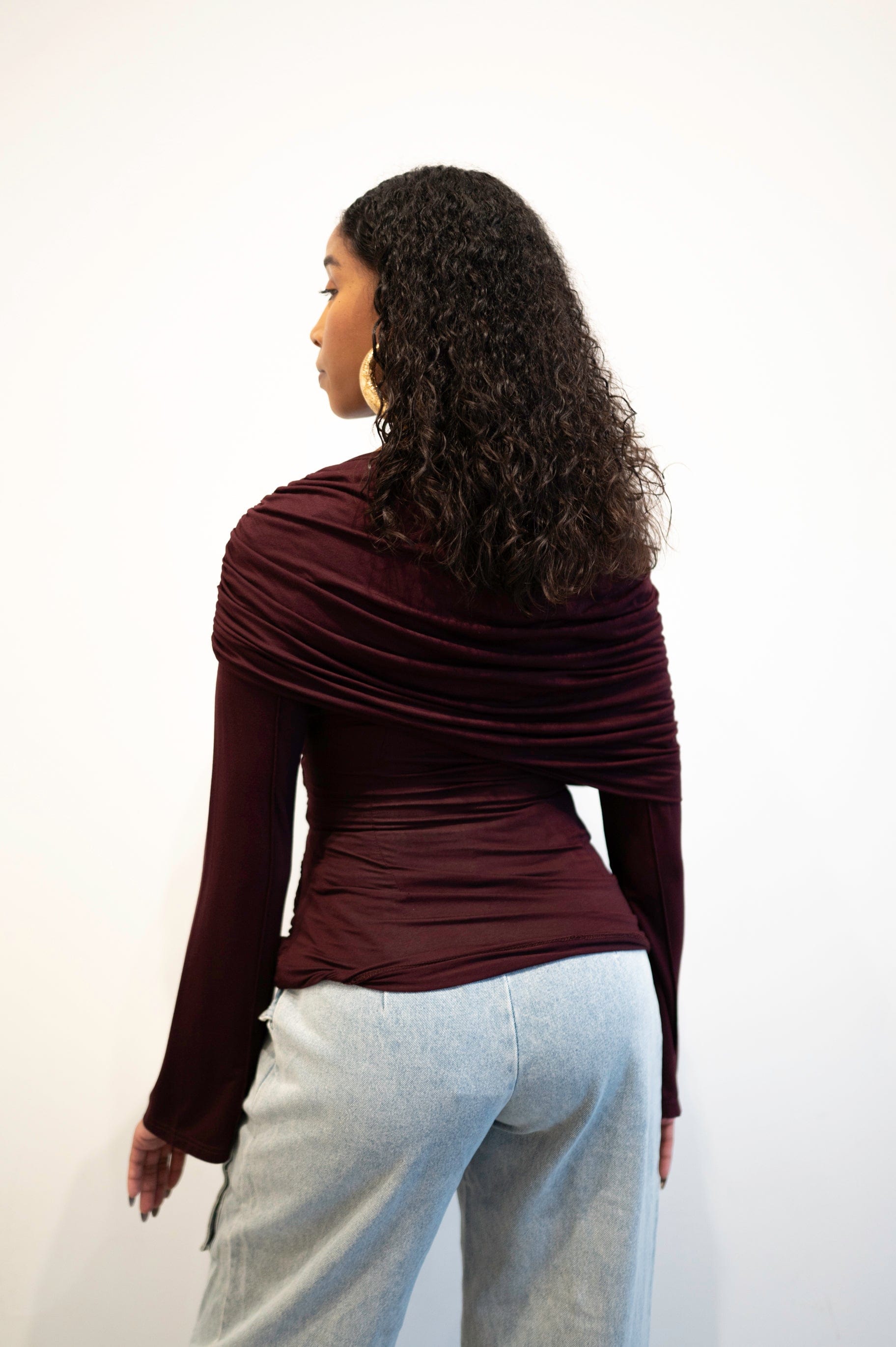 Experience ultimate comfort and style with the Lira Long Sleeved Draped Shoulder Top. Made with soft fabric, this top is perfect for any occasion. Its versatile design allows you to pair it with a skirt for a stylish and effortless look. Elevate your wardrobe with this must-have piece!