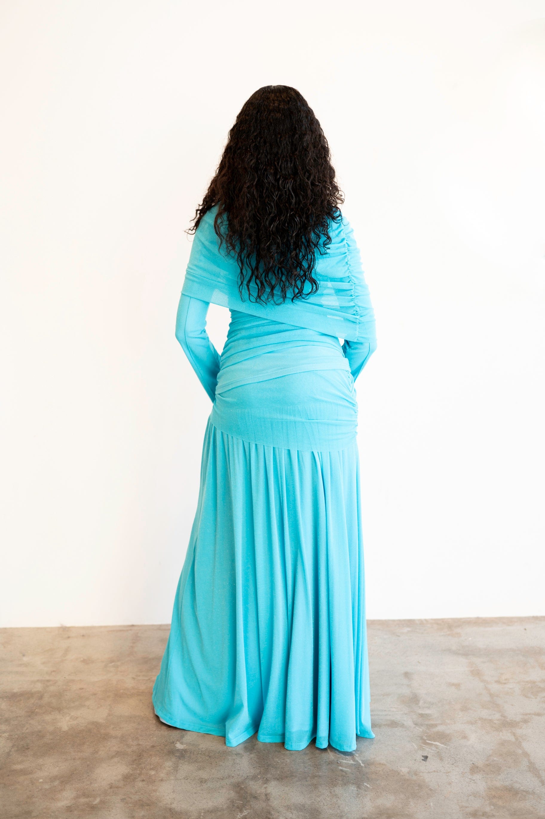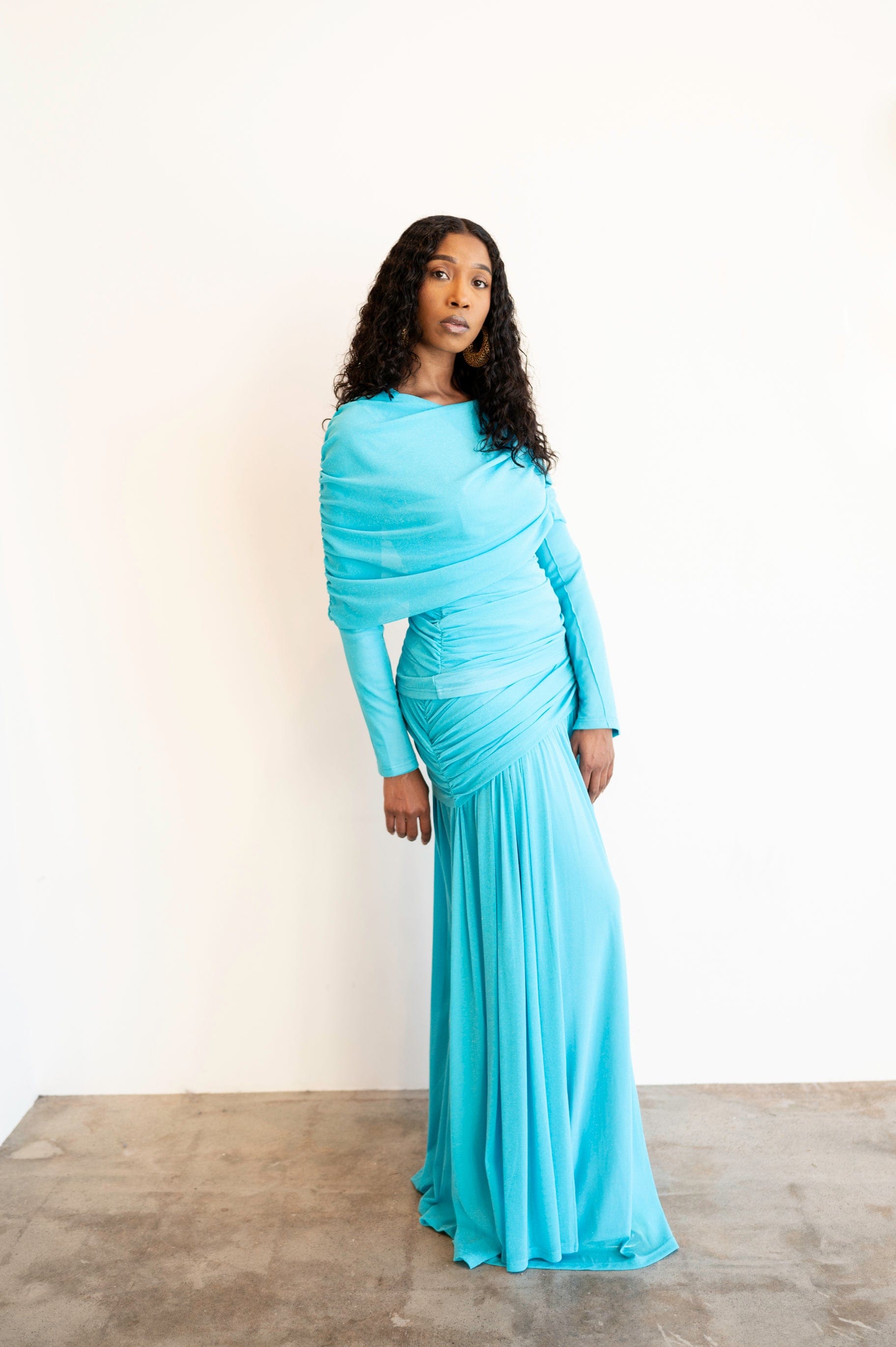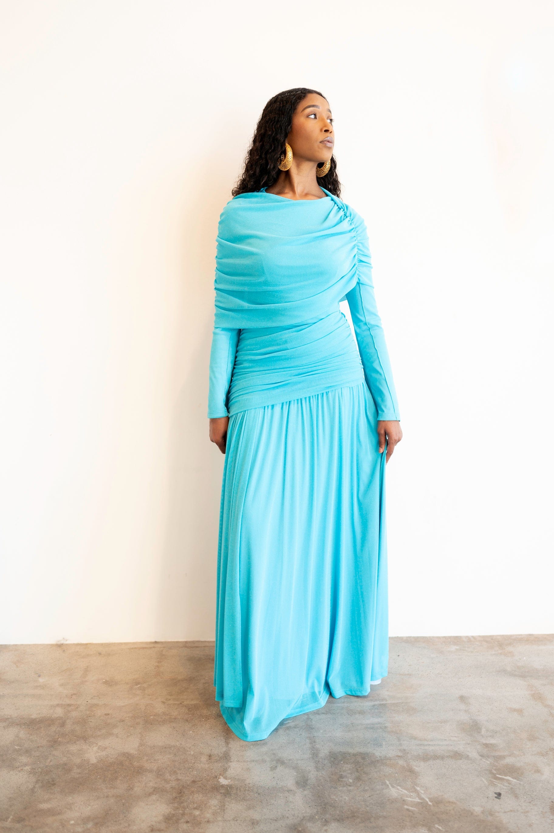 Lira Long Sleeved Draped Shoulder Top Aqua