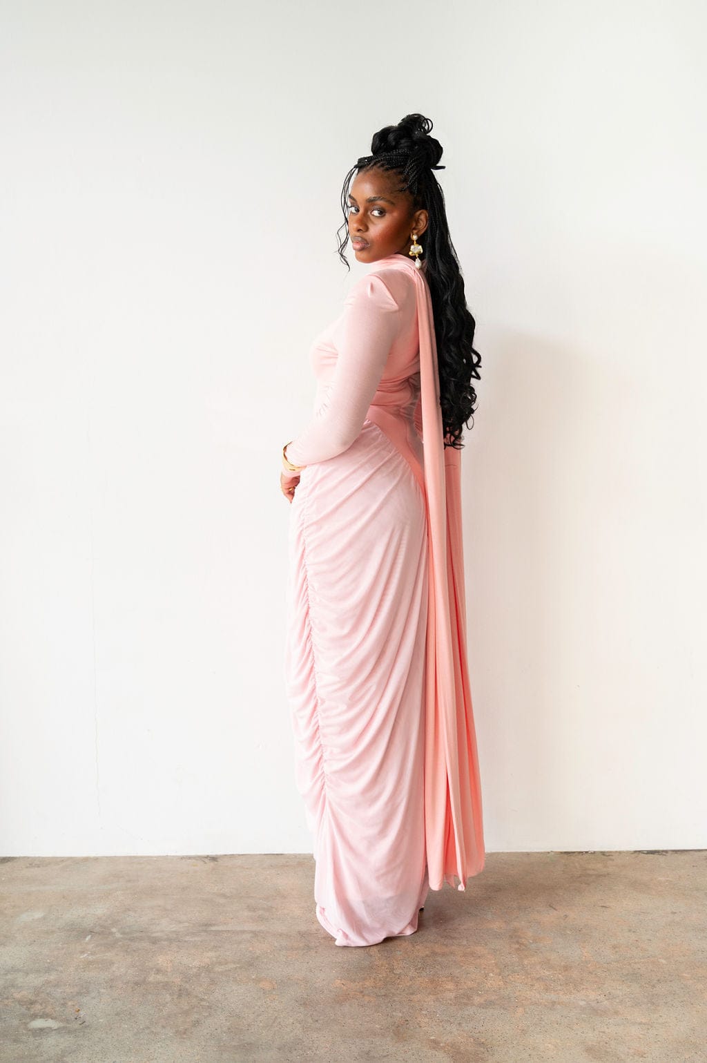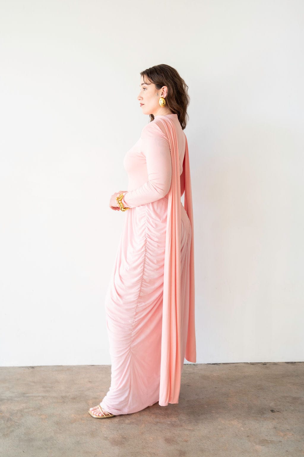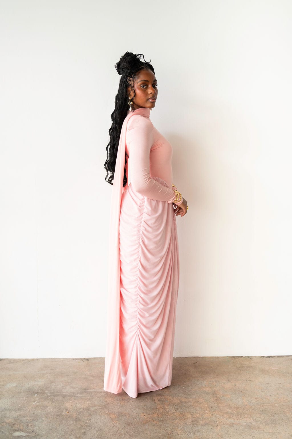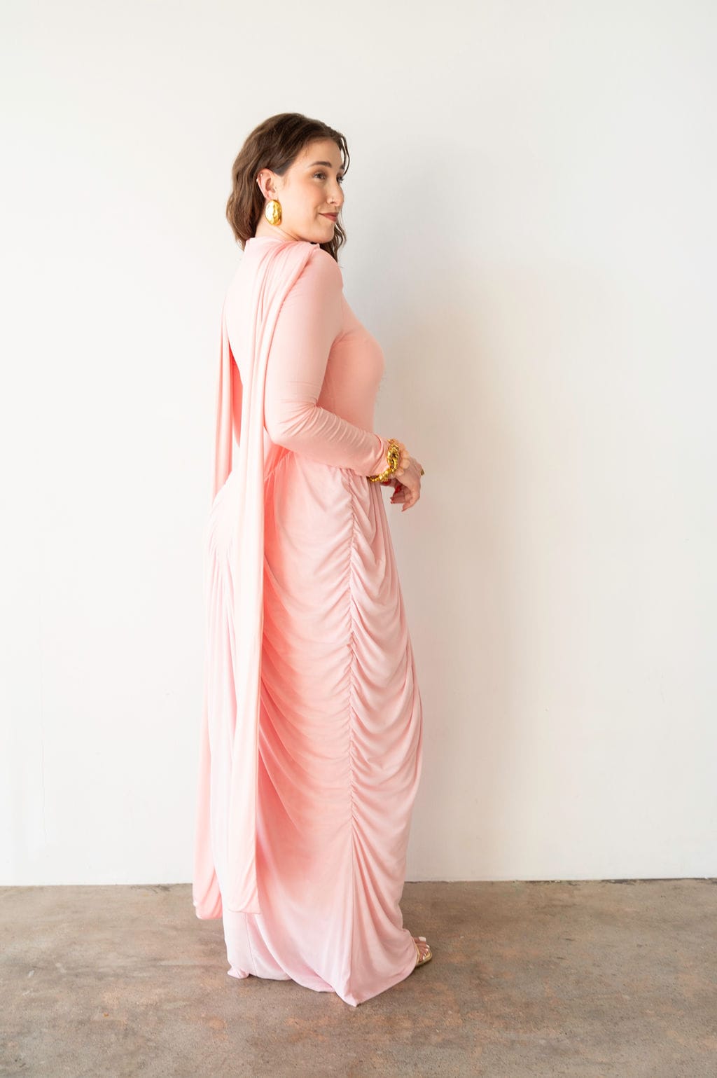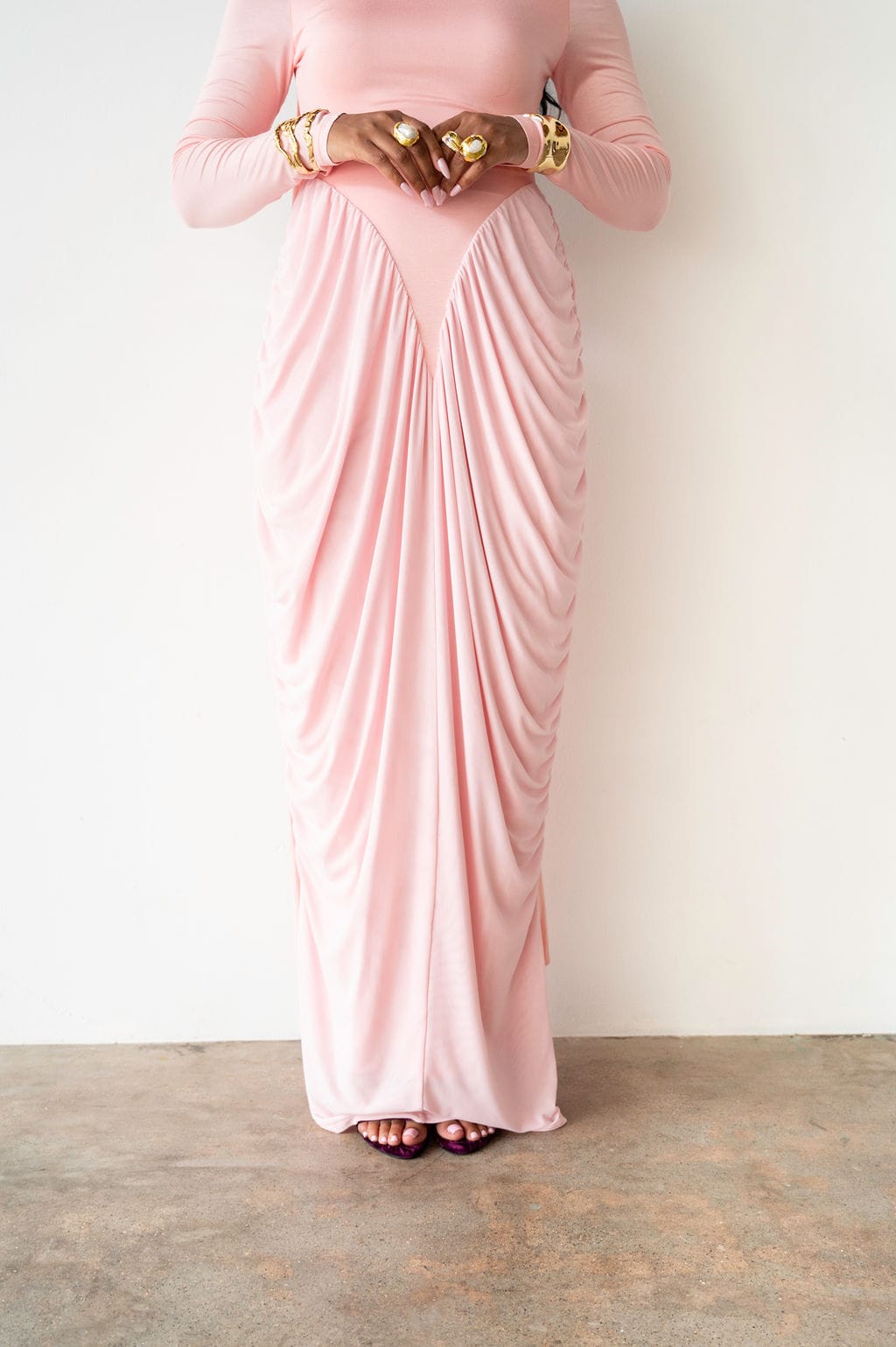 Luvie Long Sleeve Maxi Dress with Scarf in Baby Pink