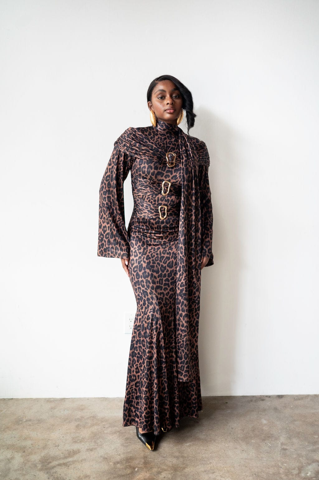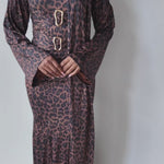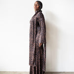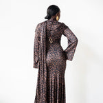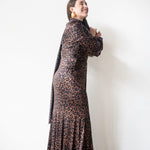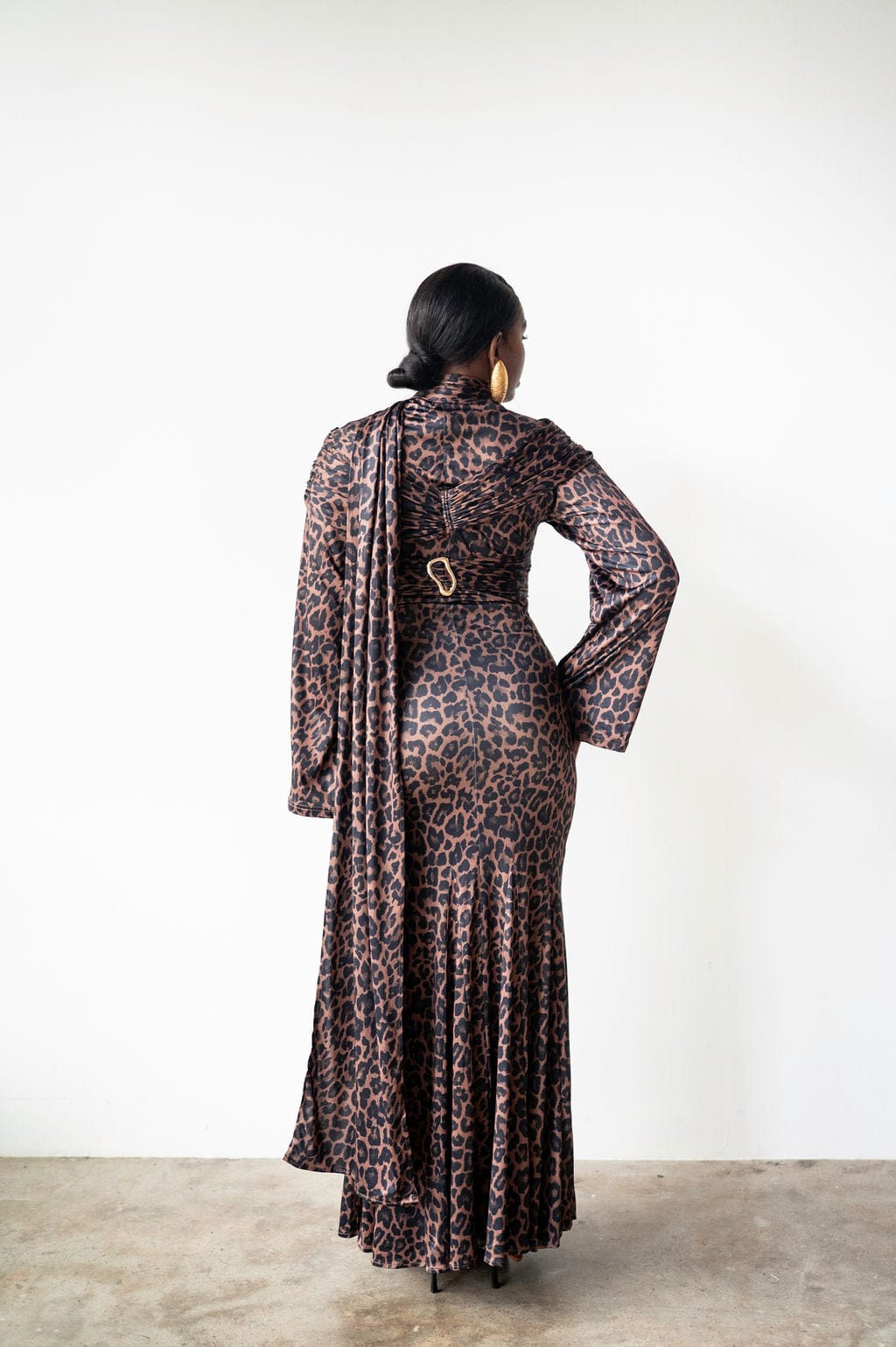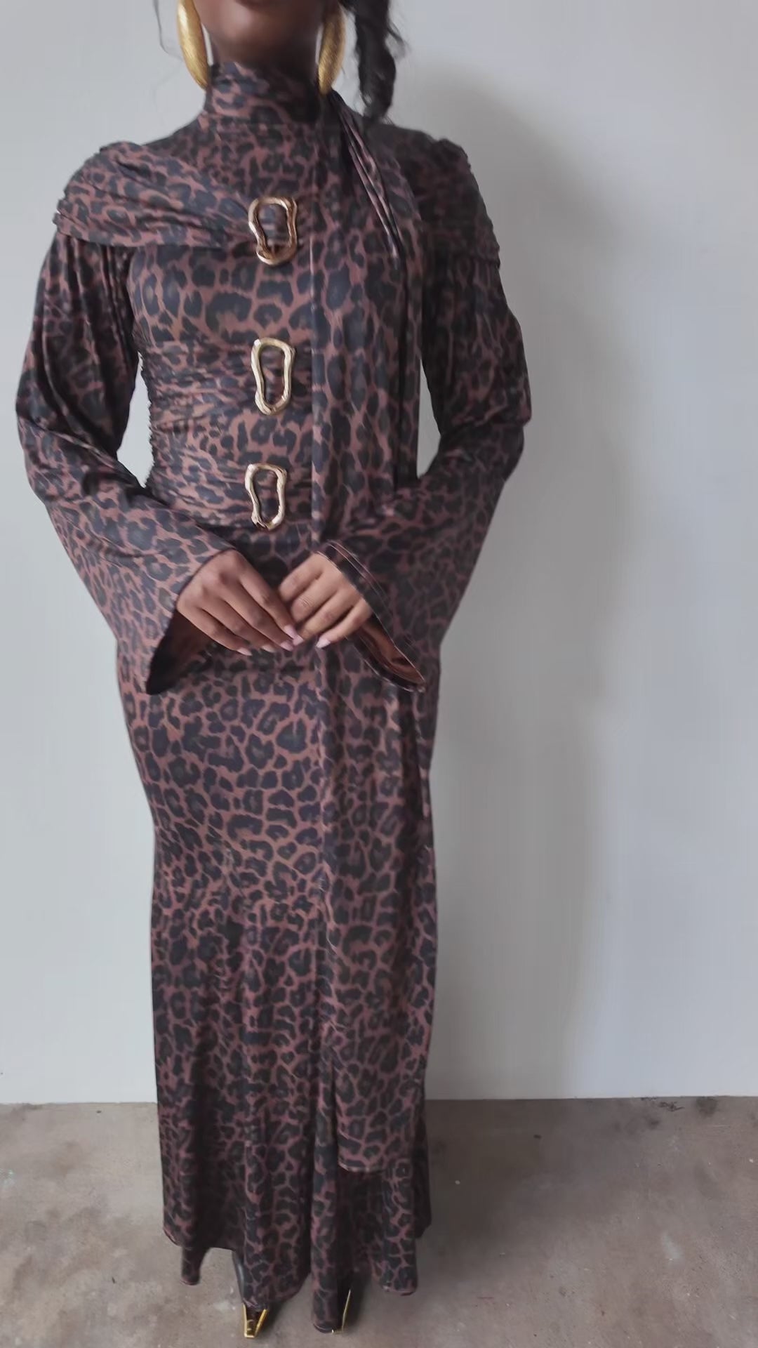 Nur Long Sleeve Flared Maxi Dress with Scarf in Leopard