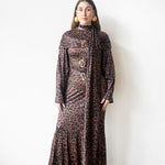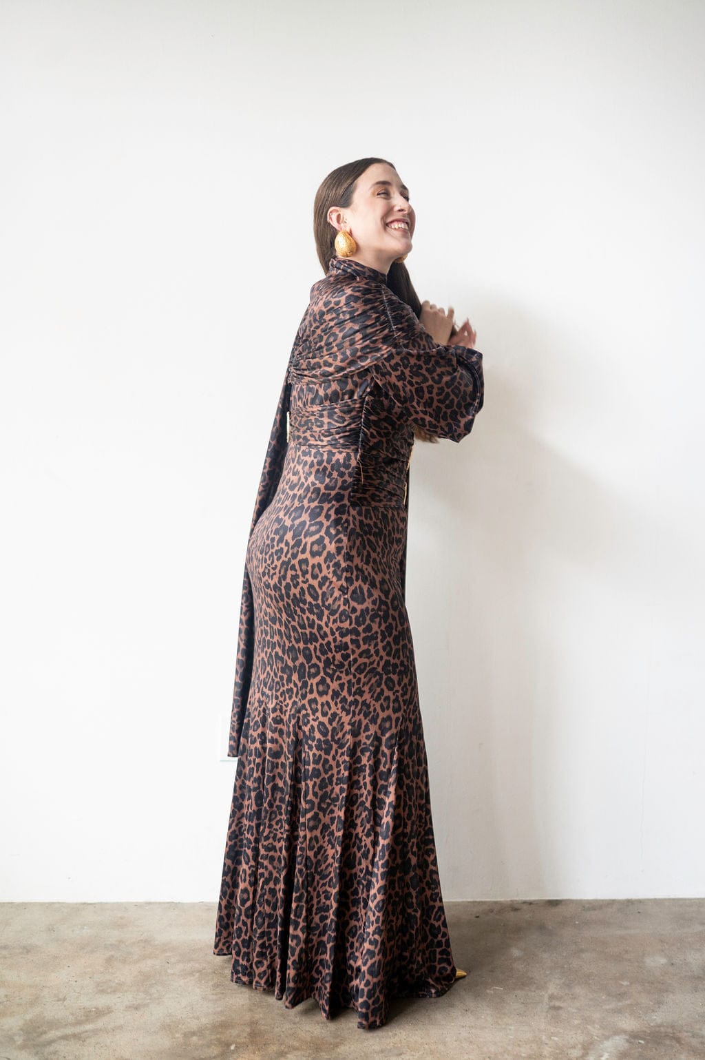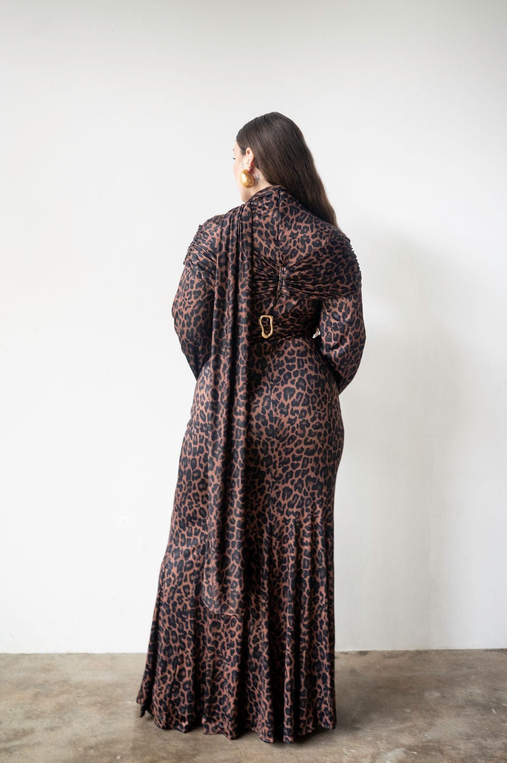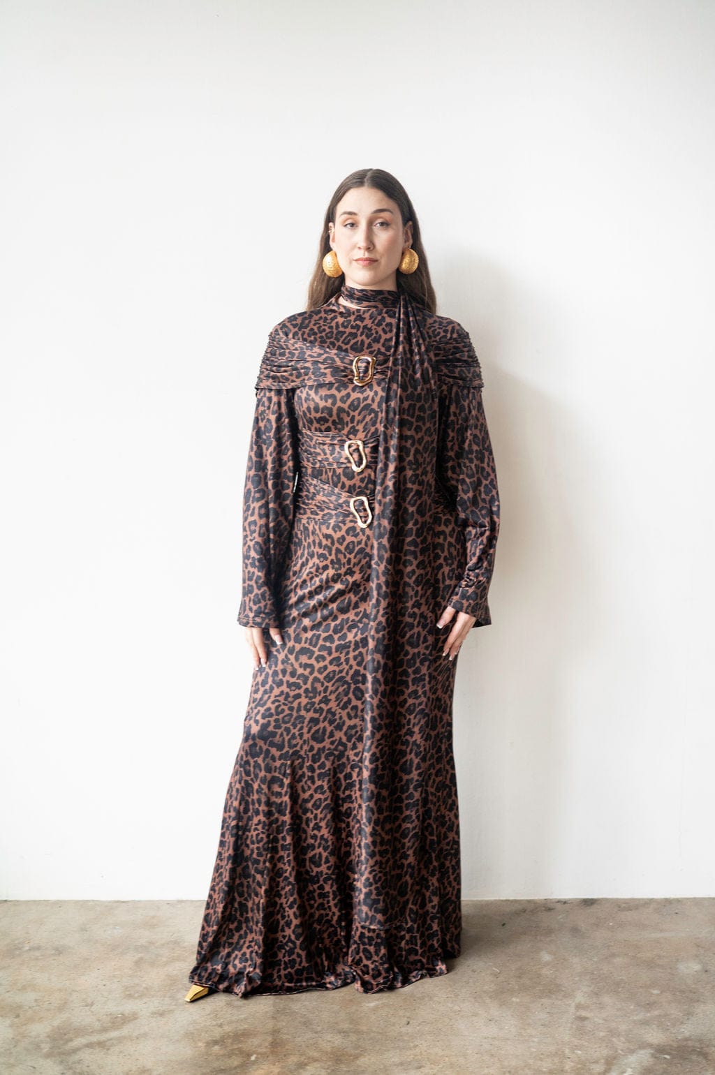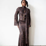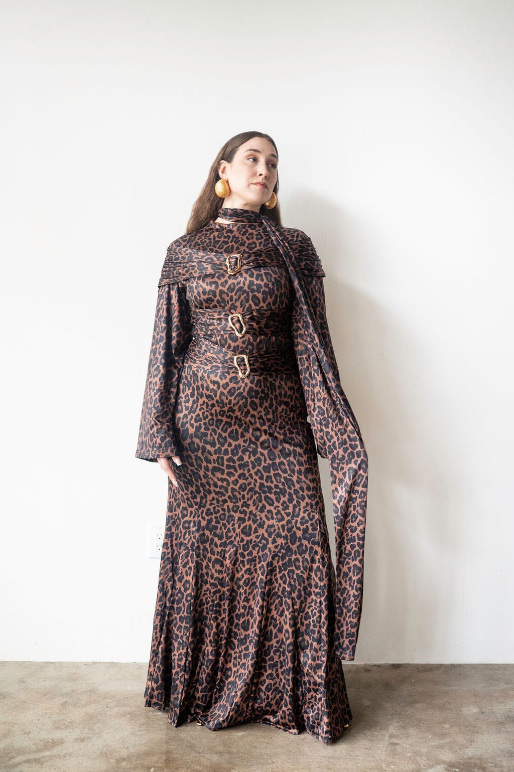 Nur Long Sleeve Flared Maxi Dress with Scarf in Leopard
