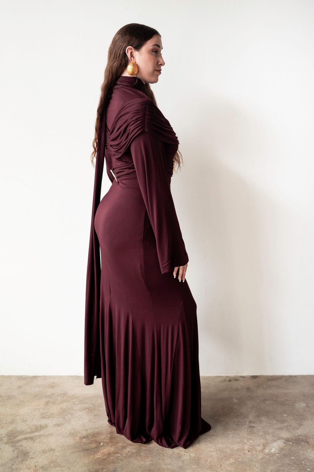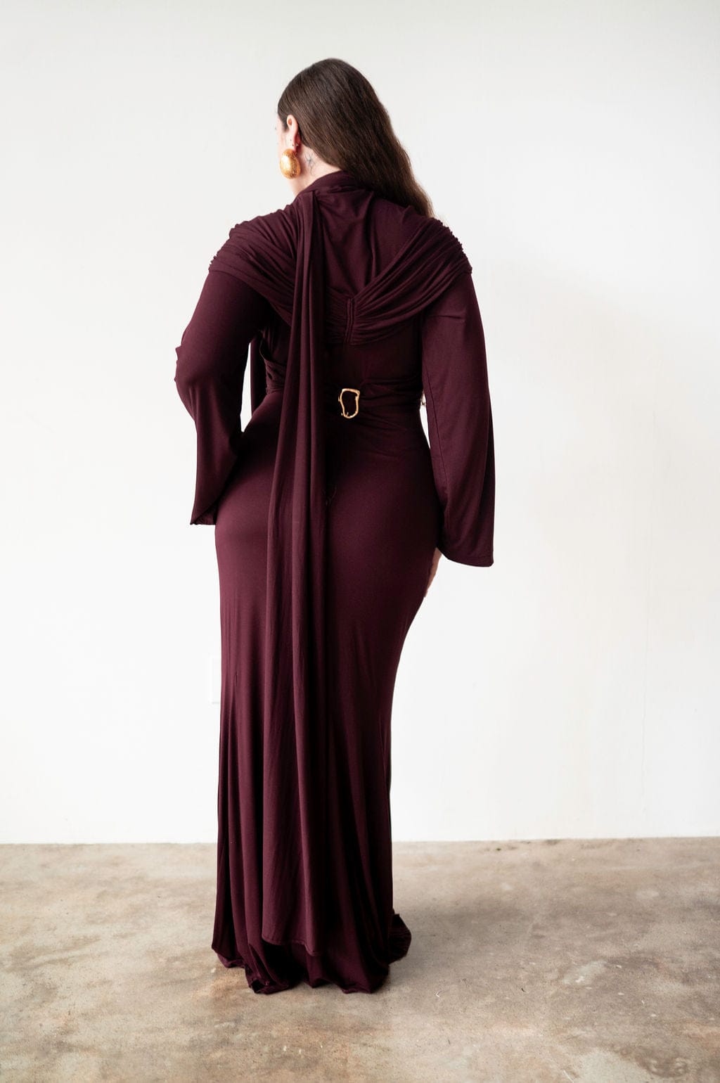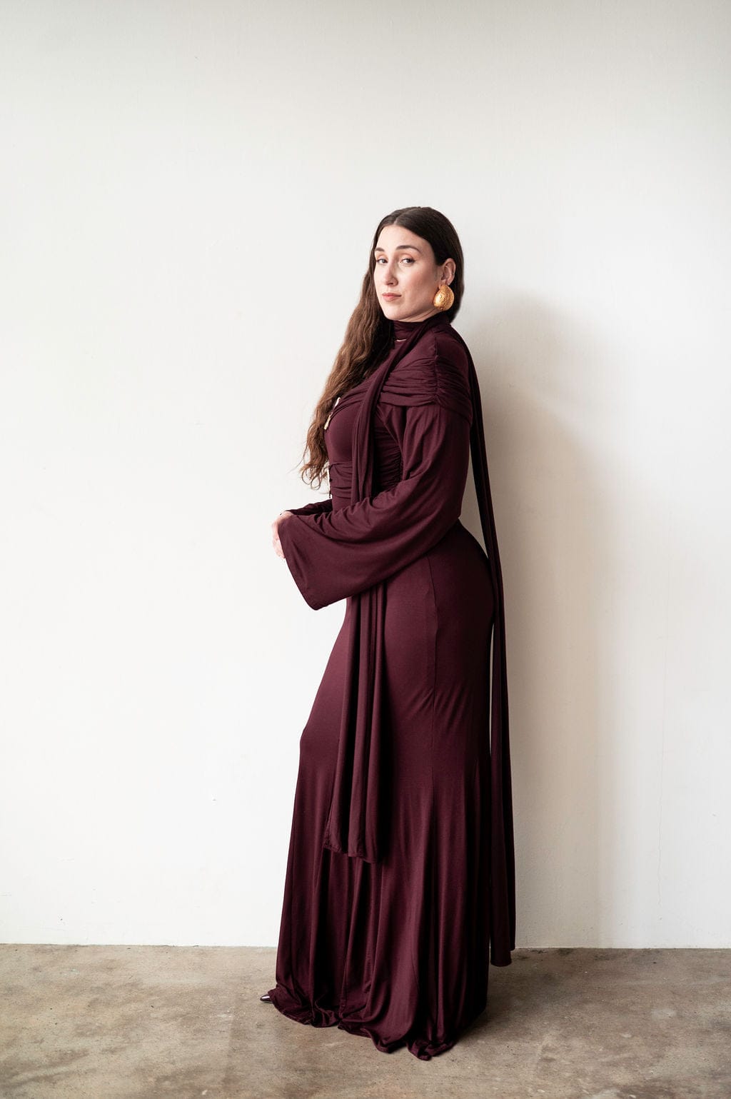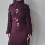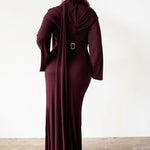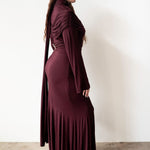 Nur Long Sleeve Flared Maxi Dress with Scarf in Plum