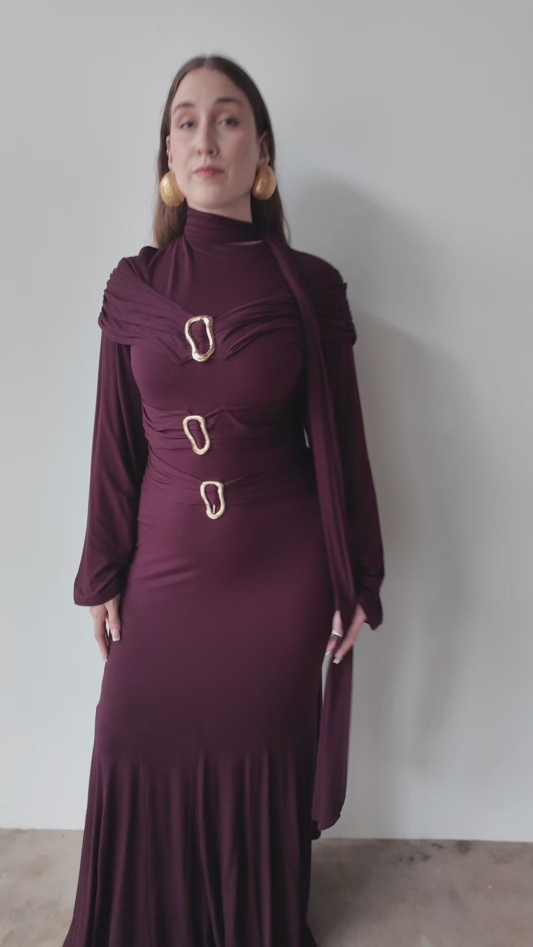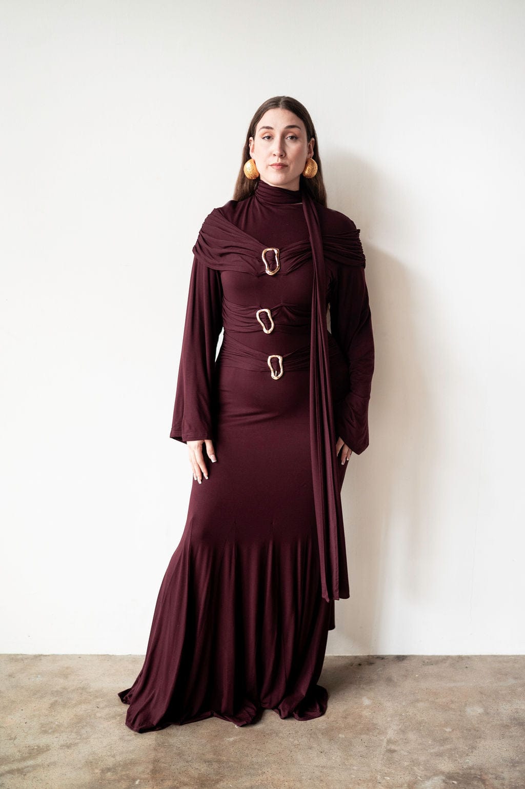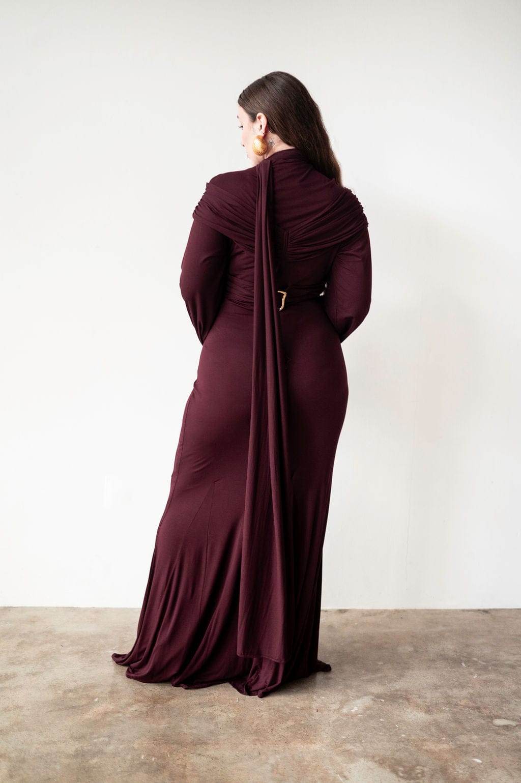 Nur Long Sleeve Flared Maxi Dress with Scarf in Plum