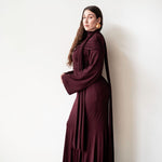 The Nur Long Sleeve Flared Maxi Dress with Scarf in Plum combines elegant femininity with graceful movement. Crafted from soft, flowing fabric, this dress features a flared maxi silhouette that flatters all body shapes. The matching scarf adds a versatile styling option, perfect for work, casual outings, or special occasions. Its long sleeves and high-quality material ensure comfort while maintaining a polished, sophisticated look. Pair it with heels, flats, or statement accessories for a chic, complete ensemble.