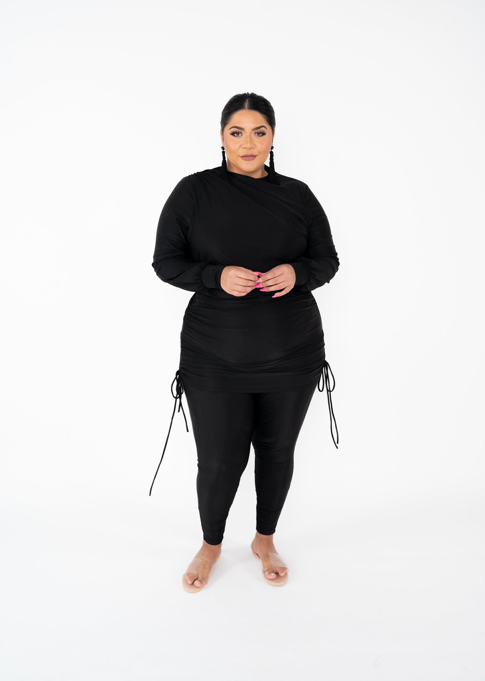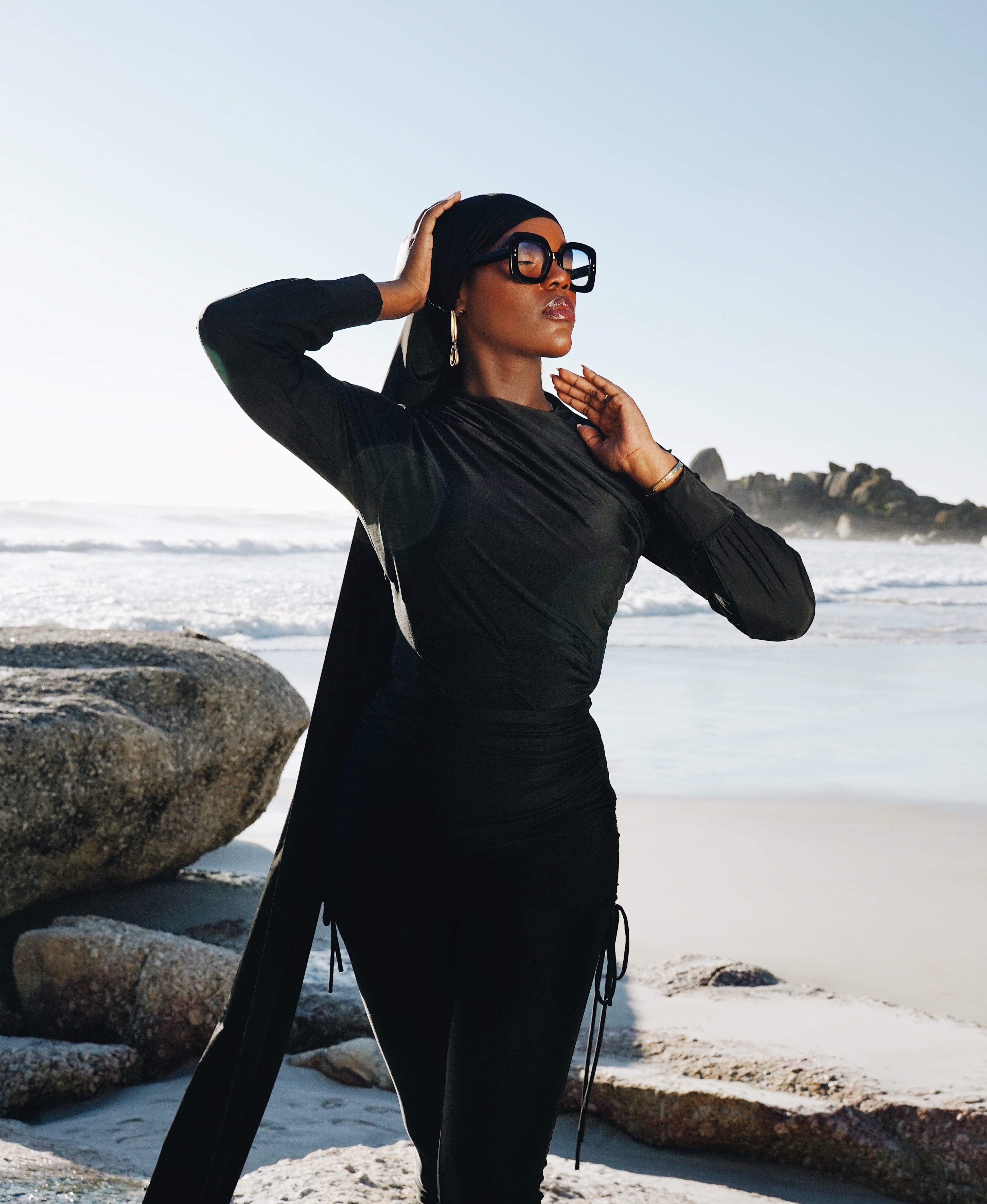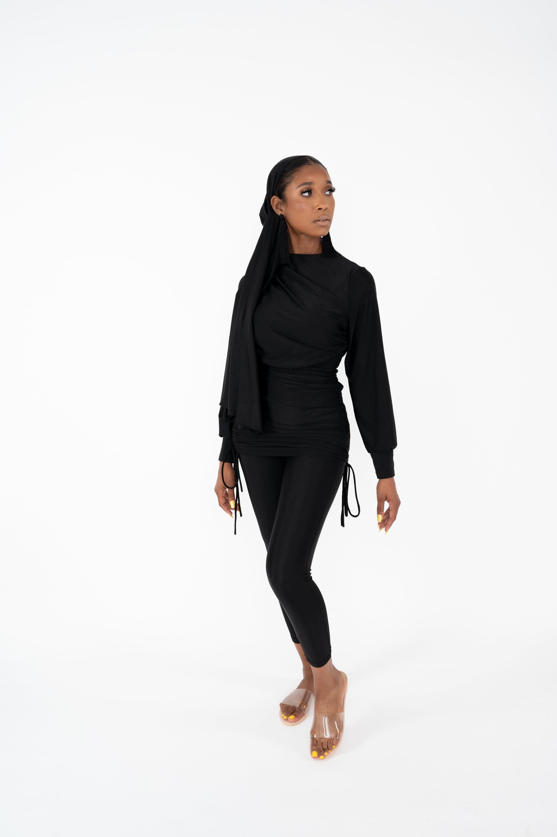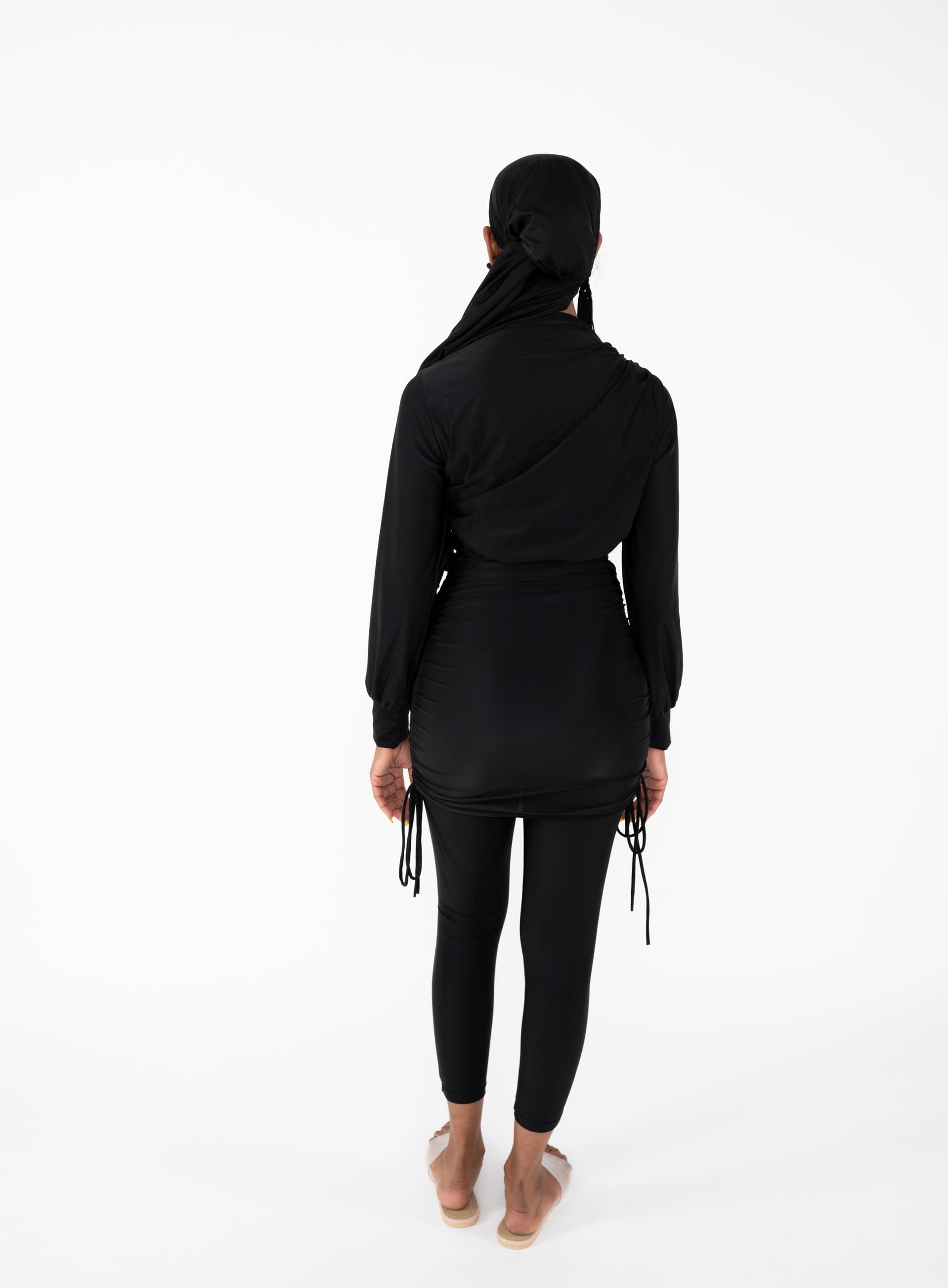 RI MI modest swimsuits come with four pieces; head turban, bodysuit, overskirt, leggings. We recommend you wear your bodysuit first, then your leggings, and then your overskirt. All swimsuits are made of high quality, quick drying swim fabric.