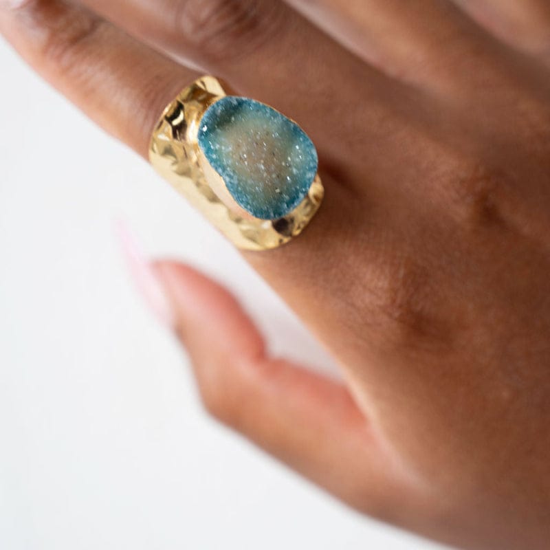 We all know the perfect accessory isn’t always understated — sometimes it’s meant to shine. The Sali Gemstone Ring features a mesmerizing natural crystal surface that sparkles with every movement. The elegant oval shape frames the shimmering druzy beautifully, creating a piece that feels both refined and eye-catching. Whether paired with casual daytime outfits or worn as a statement piece for an evening out, this ring adds effortless brilliance to your everyday style.