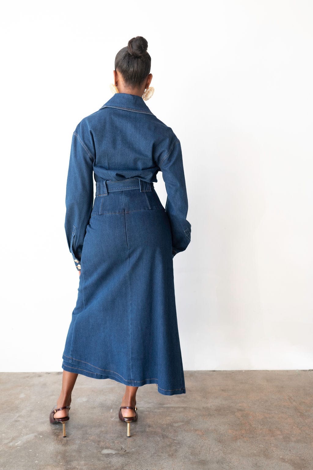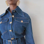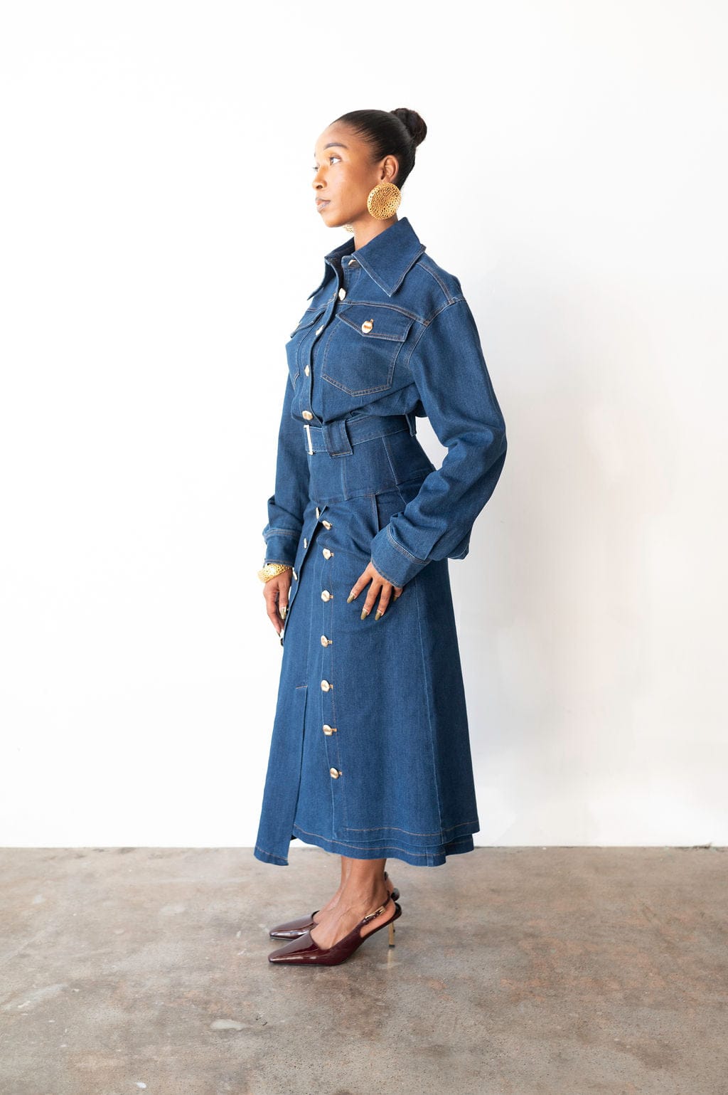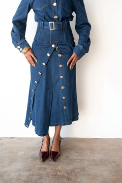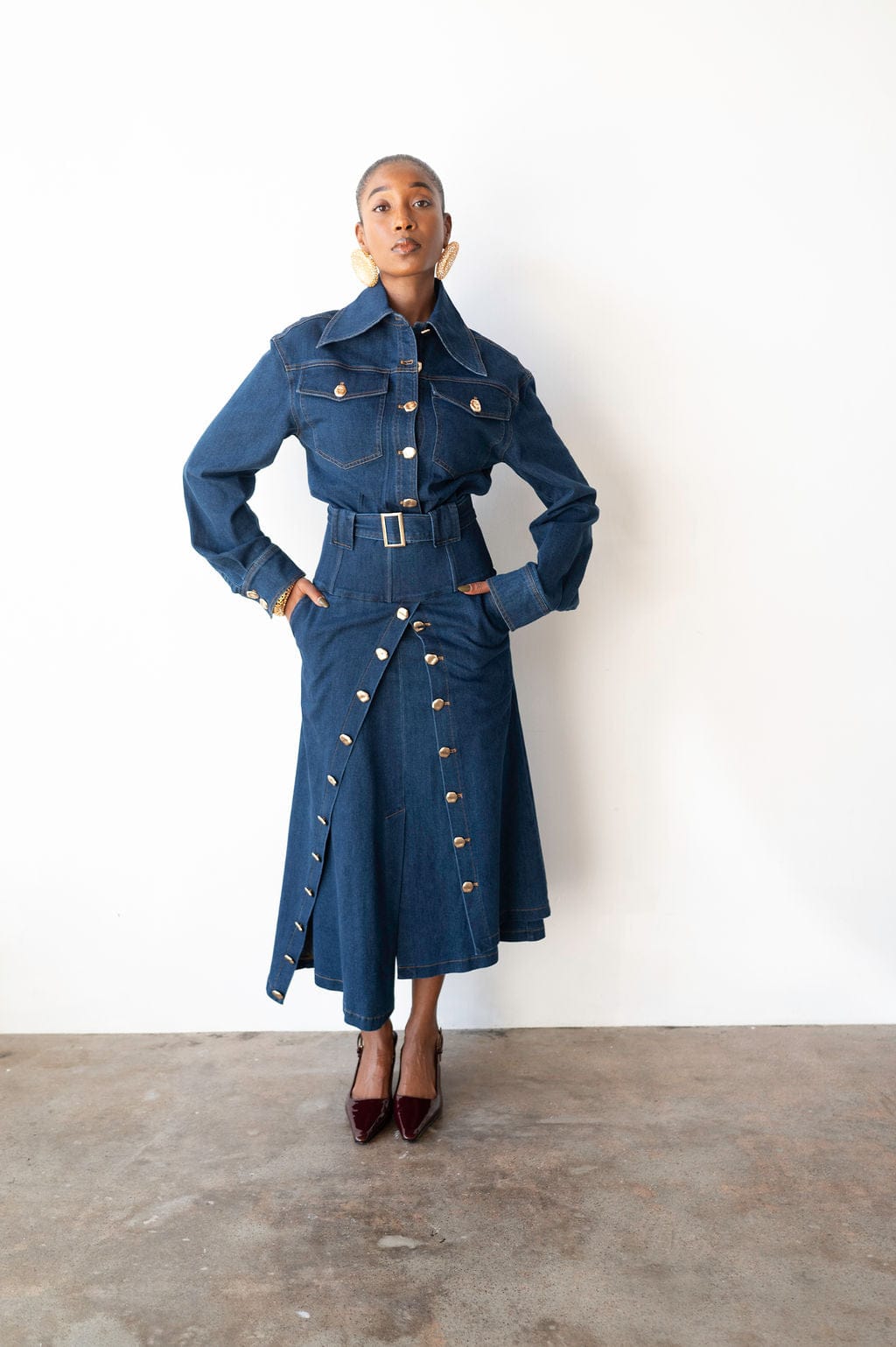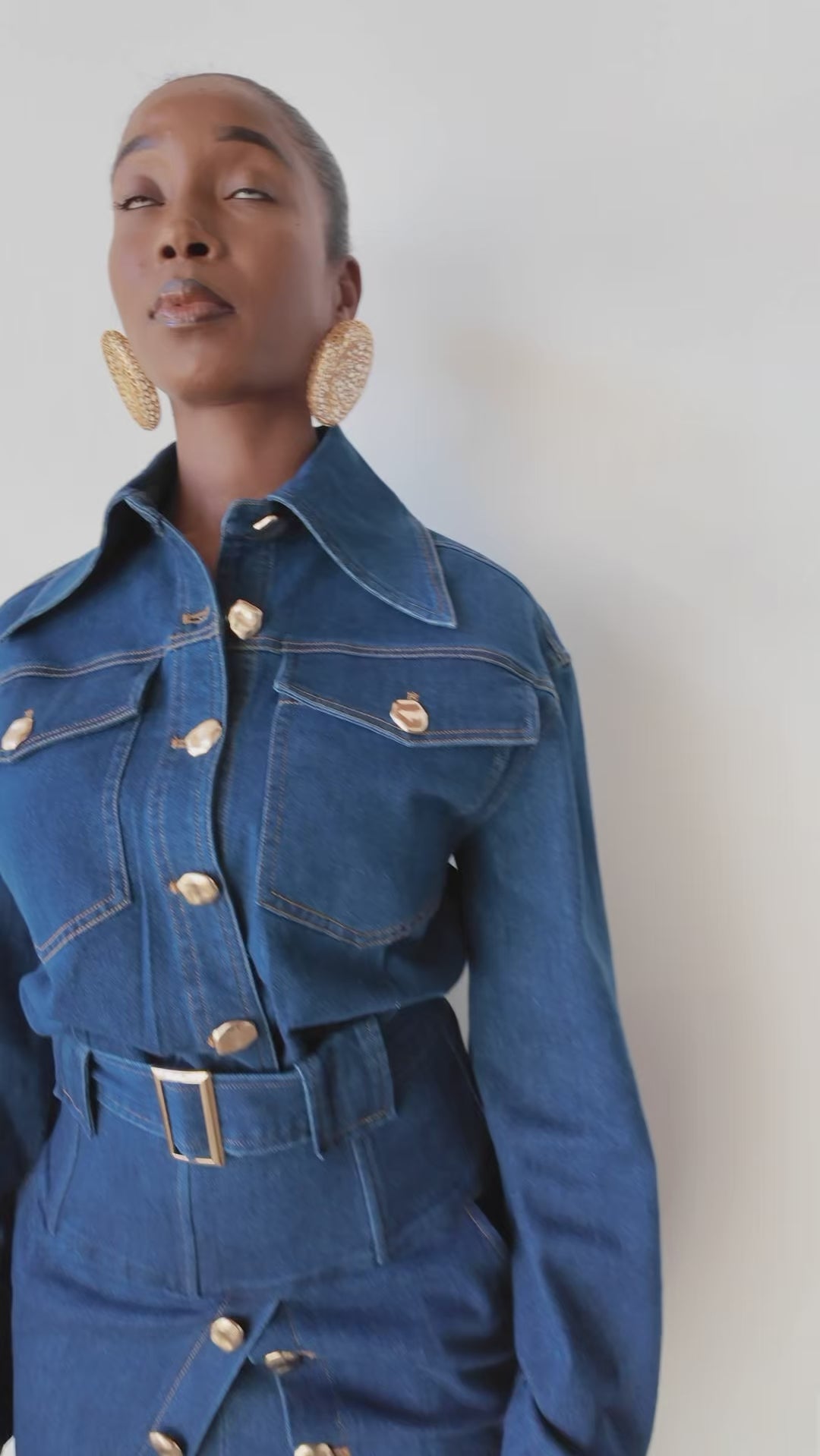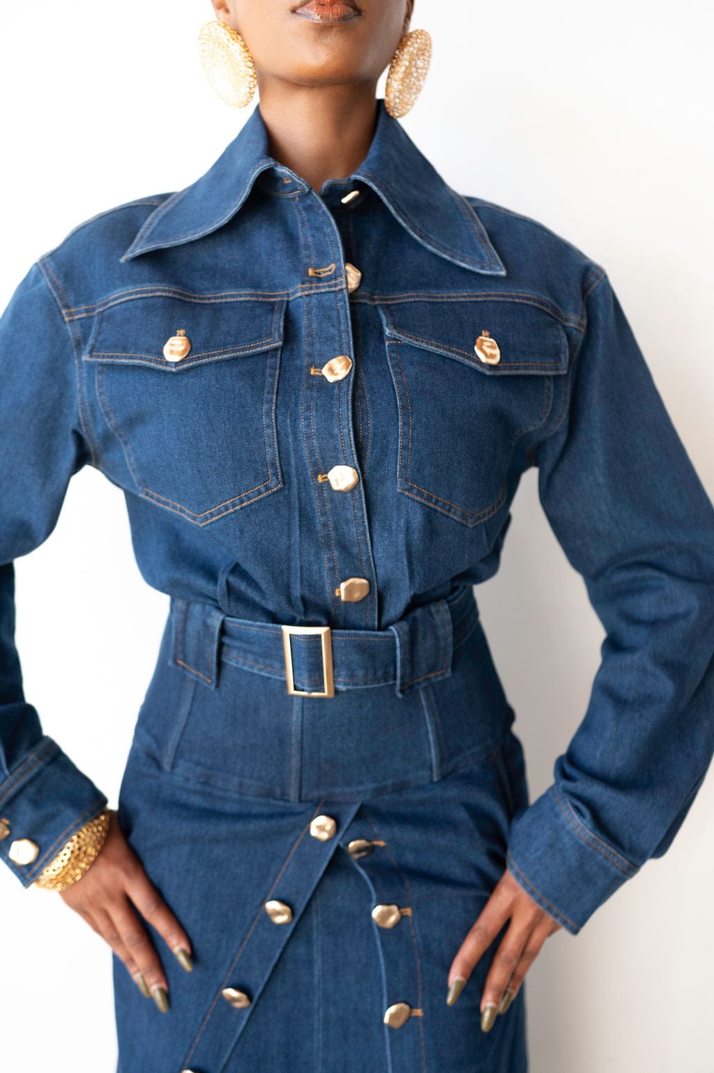Elevate your wardrobe with this commanding long sleeve denim top, where sophisticated gold buttons transform a classic piece into something extraordinary. The refined tailoring and timeless denim construction provide endless styling possibilities, while luxe metallic details inject undeniable personality. Combine it with the Lai denim skirt for a cohesive ensemble that captures attention and reflects your discerning taste. Invest in pieces that work as hard as you do—this is denim reimagined for the modern, confident woman.
