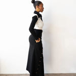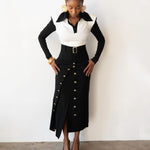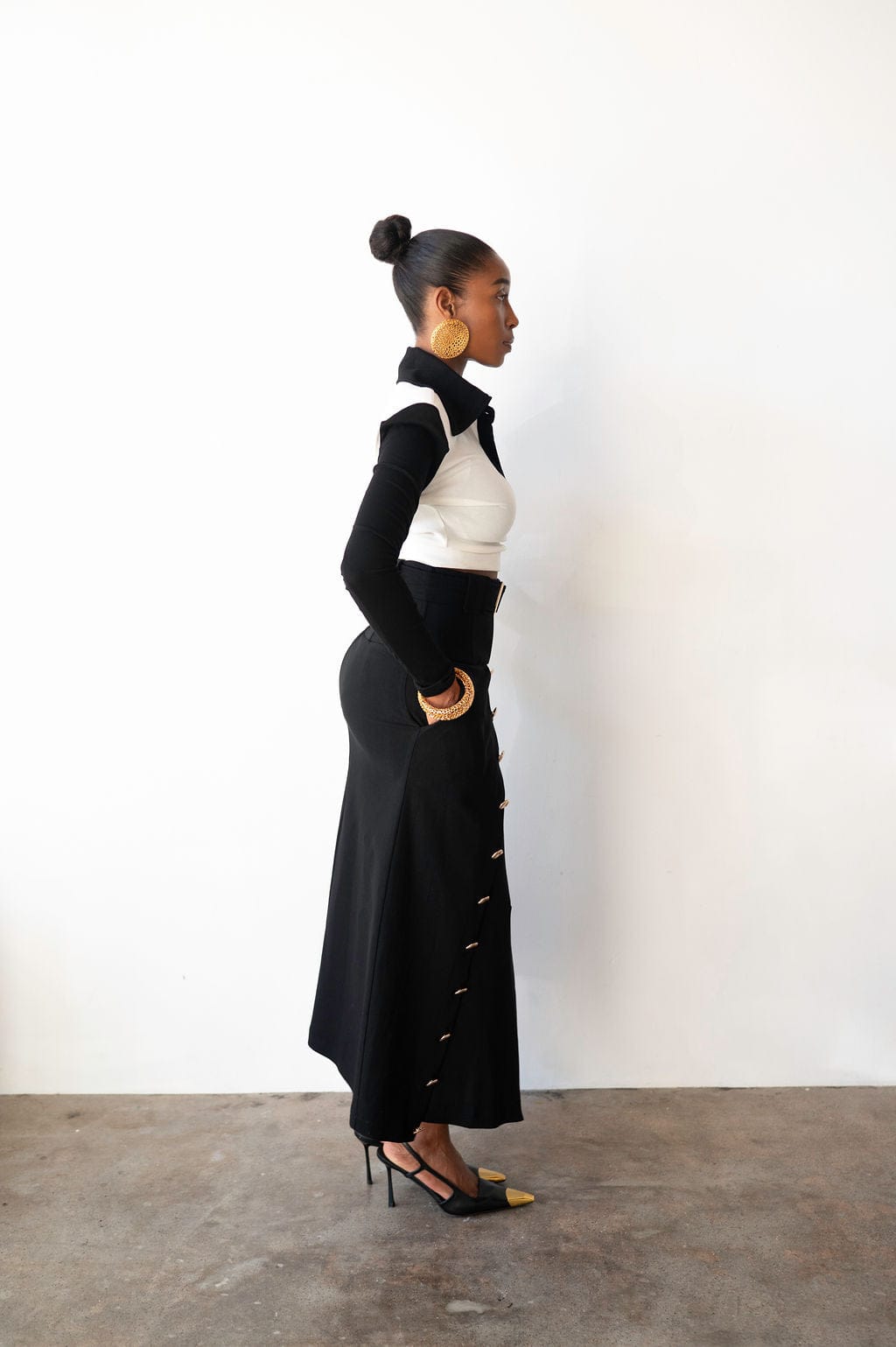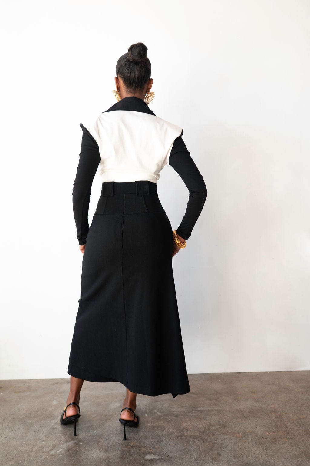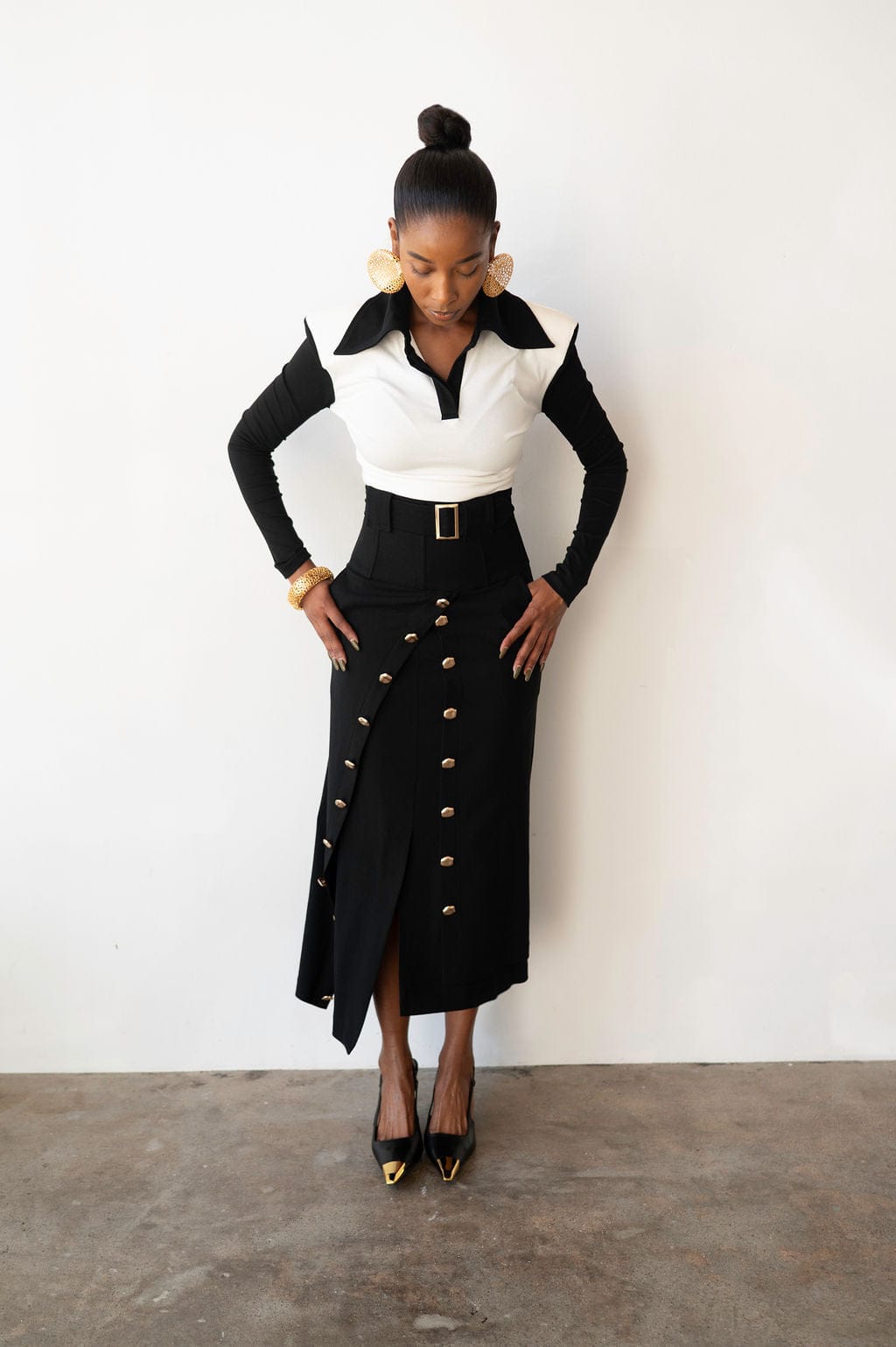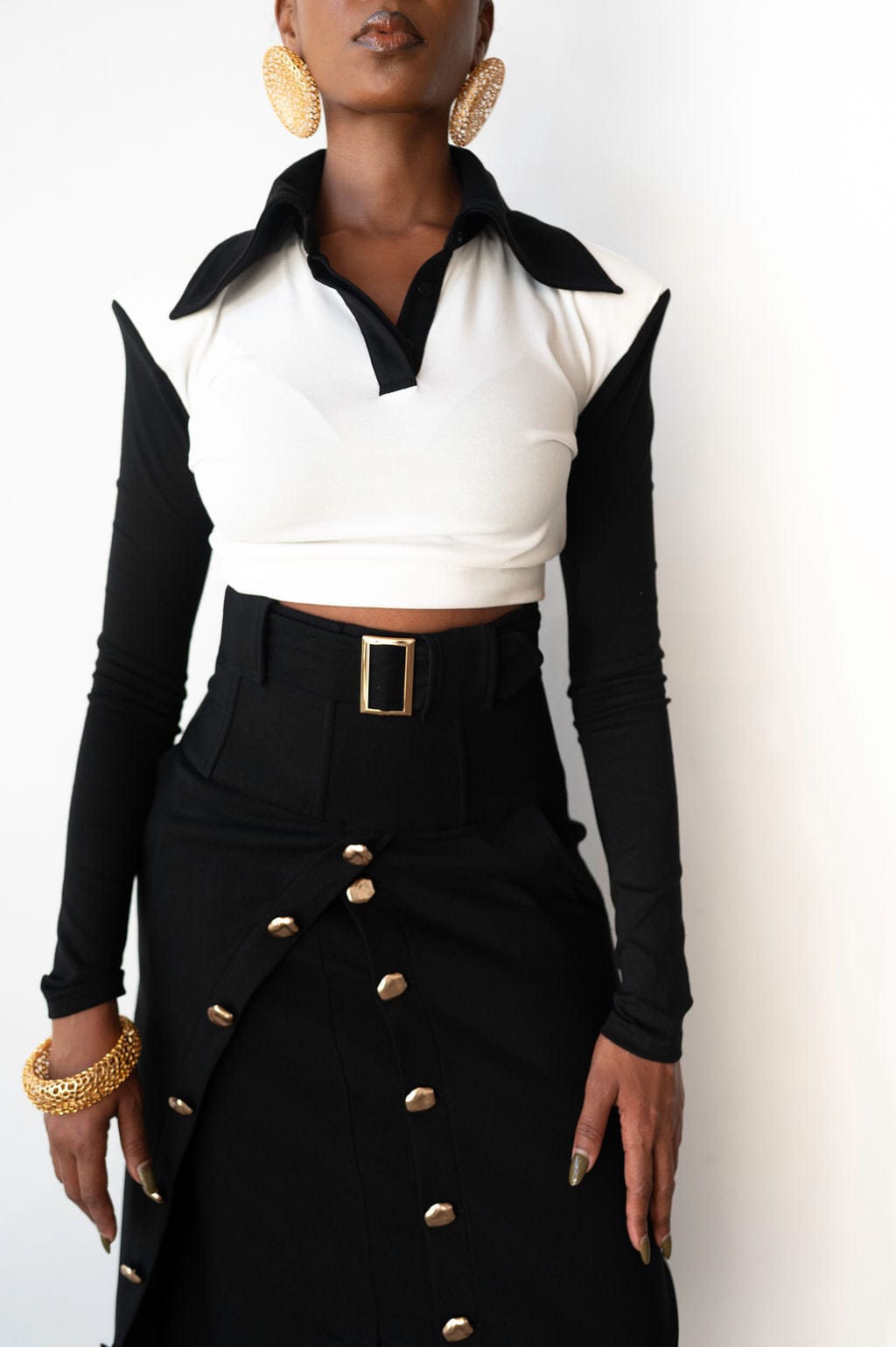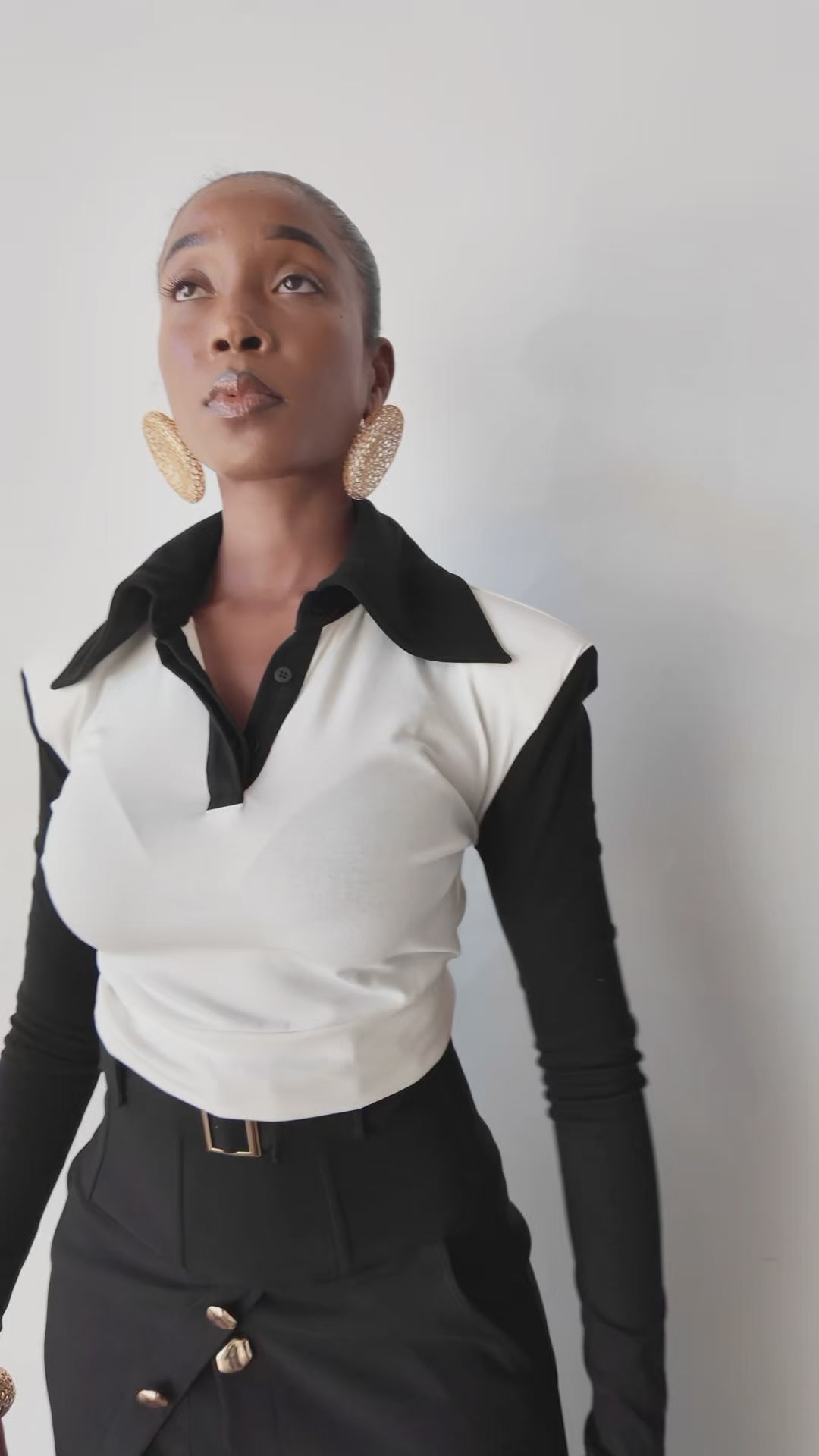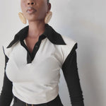 Make a statement with the Valentina Exaggerated Collar Long Sleeve Color Block Cropped Top. This bold piece features striking black and white color blocking that demands attention, paired with structured shoulder pads that command presence and elevate your silhouette. The exaggerated collar adds dramatic flair while the cropped length keeps the look modern and versatile. Perfect for those ready to stand out and own their style with confidence.