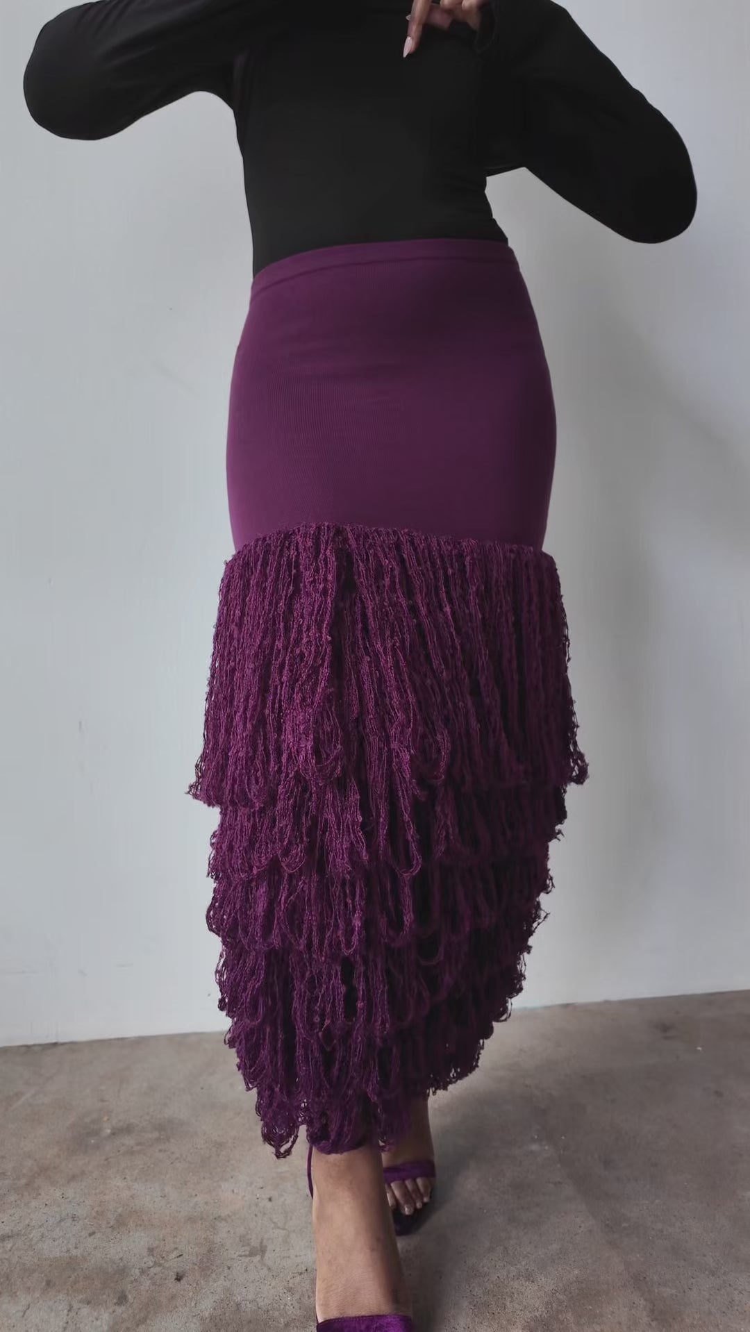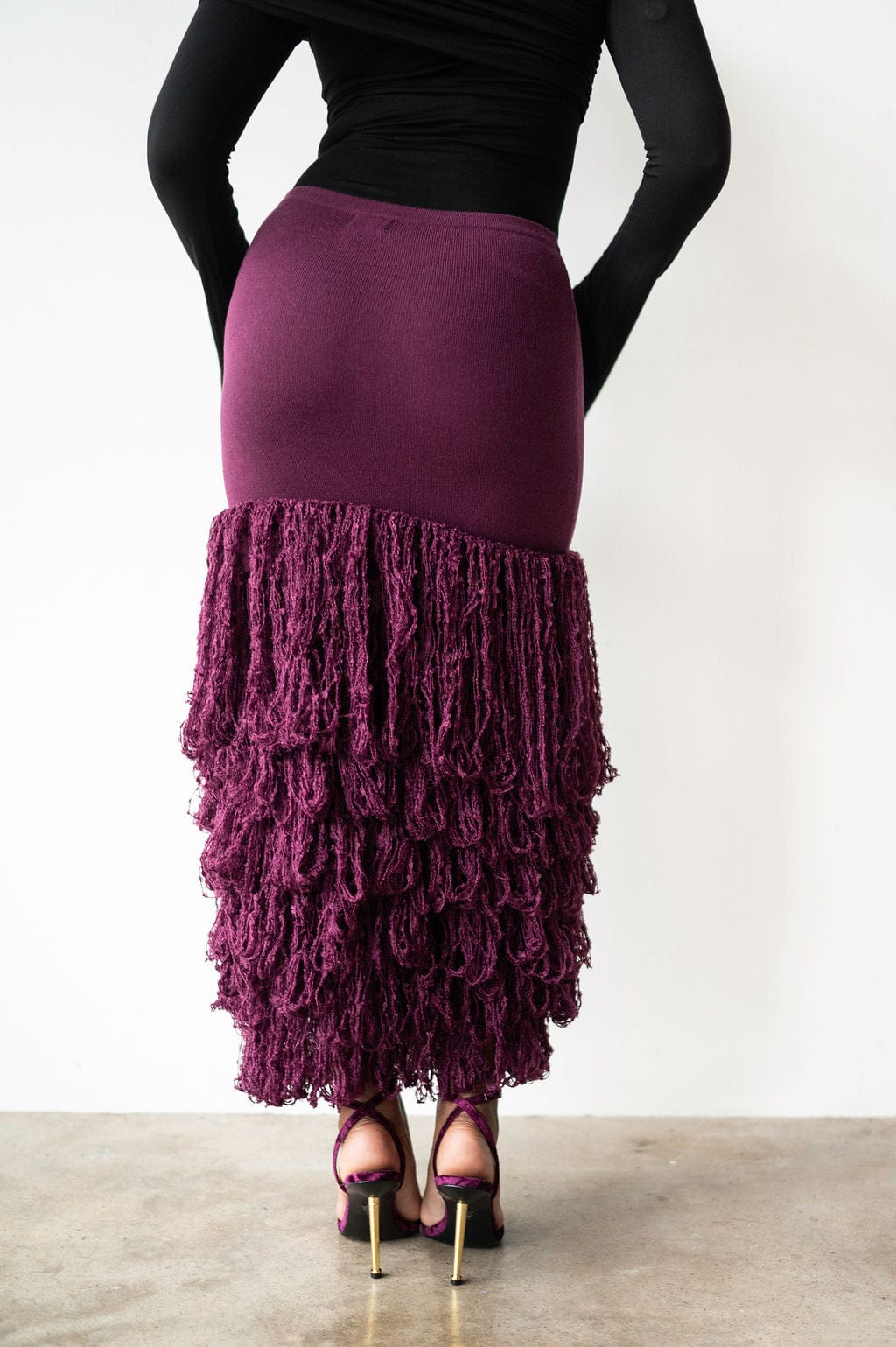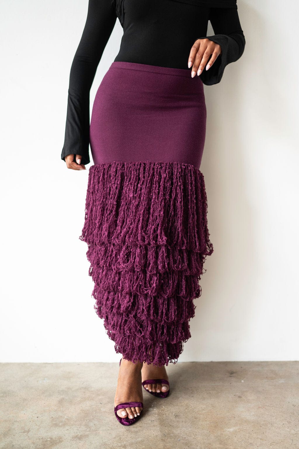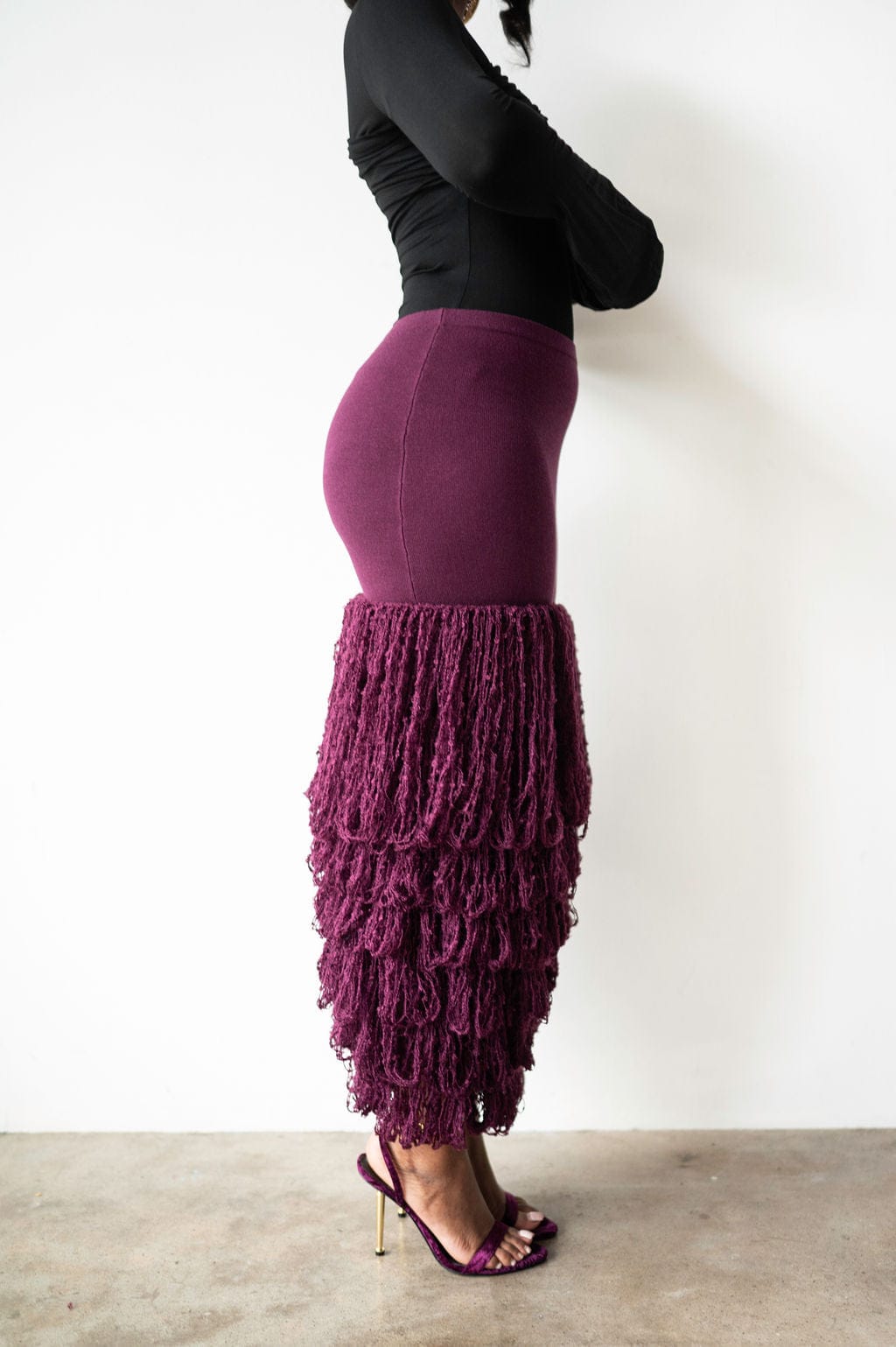 Make a statement with the Wura Knit Tassel Maxi Skirt in Plum—a bold piece designed to turn heads. The intricate tassel detailing adds texture and movement, while the rich plum hue ensures you stand out from the crowd. Pair it with a complementary shirt to create a stunning dress moment, or mix and match with your existing wardrobe for endless styling possibilities. Versatile, eye-catching, and undeniably chic.
