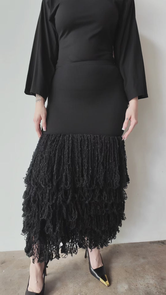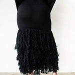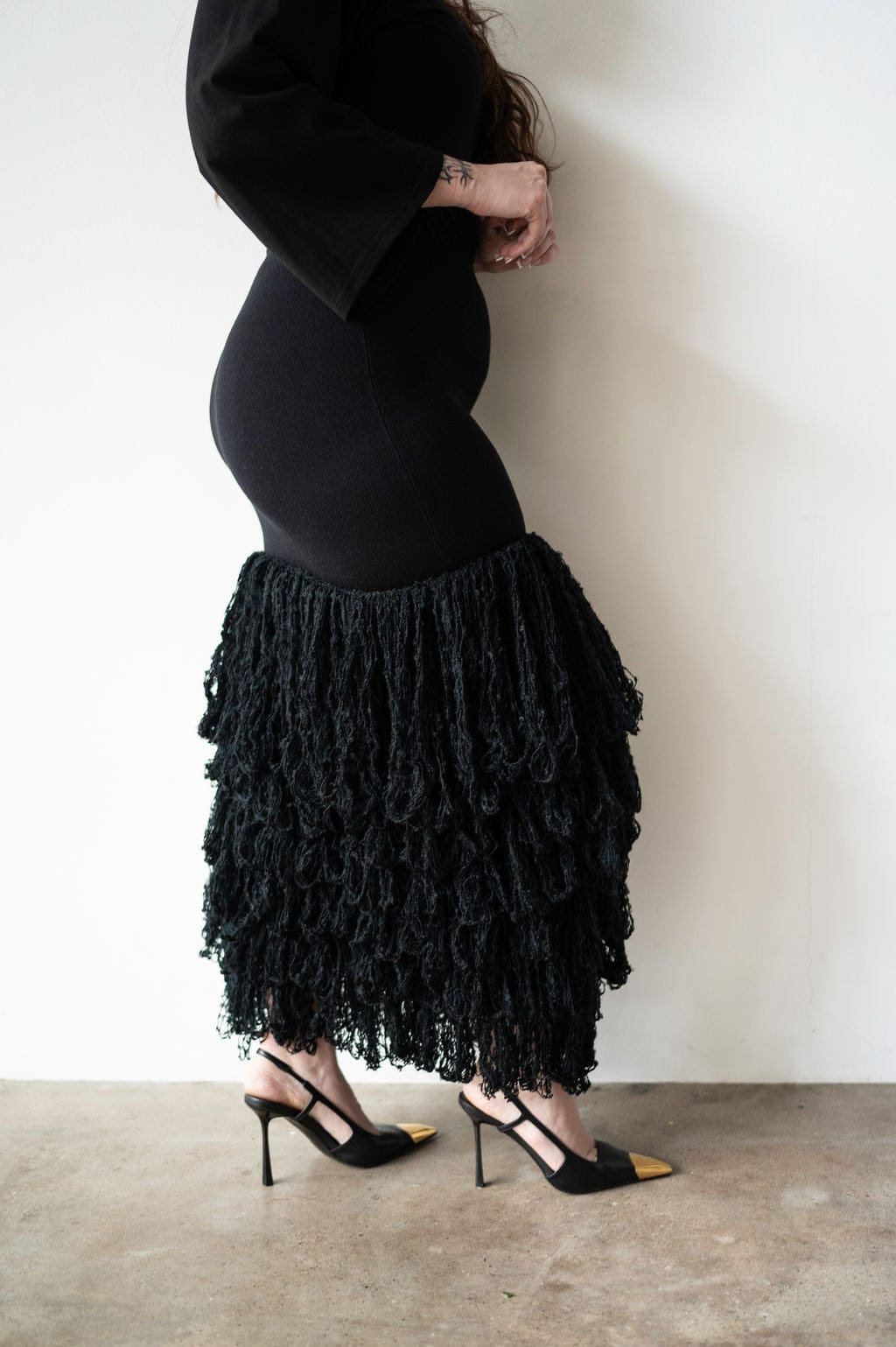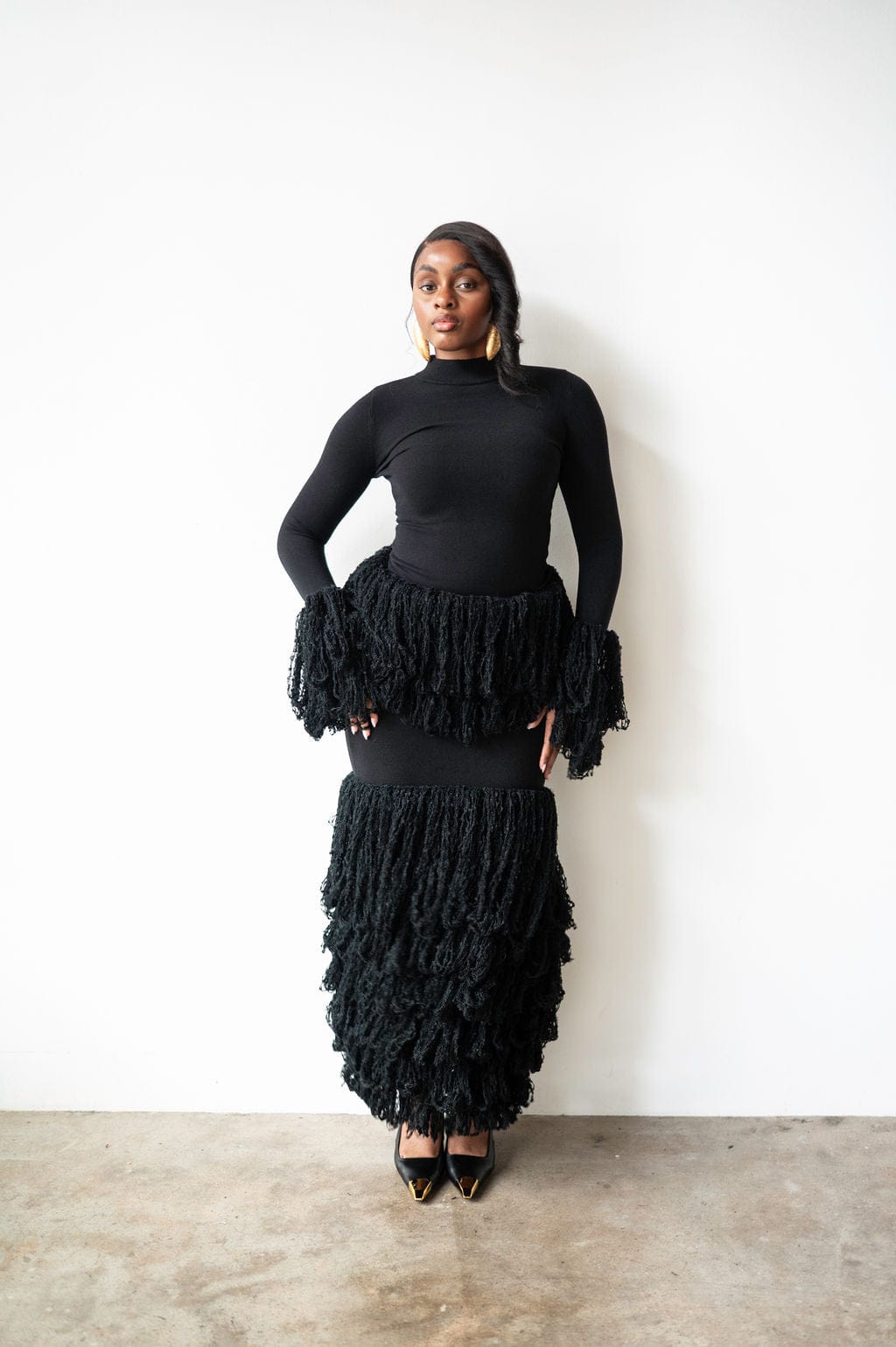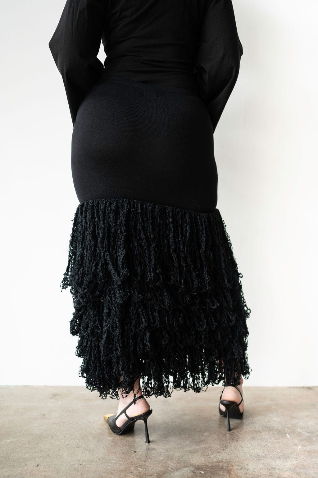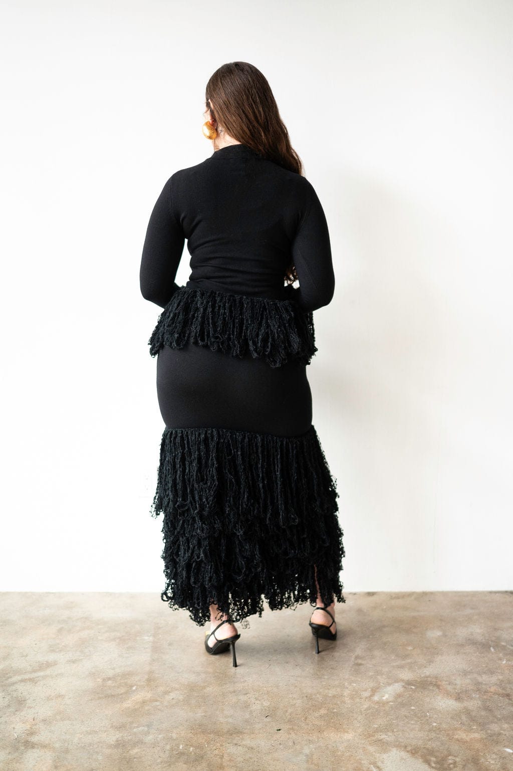Make a statement with the Wura Knit Tassel Maxi Skirt in Plum—a bold piece designed to turn heads. The intricate tassel detailing adds texture and movement, while the rich black hue ensures you stand out from the crowd. Pair it with a complementary shirt to create a stunning dress moment, or mix and match with your existing wardrobe for endless styling possibilities. Versatile, eye-catching, and undeniably chic.